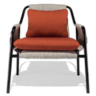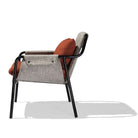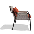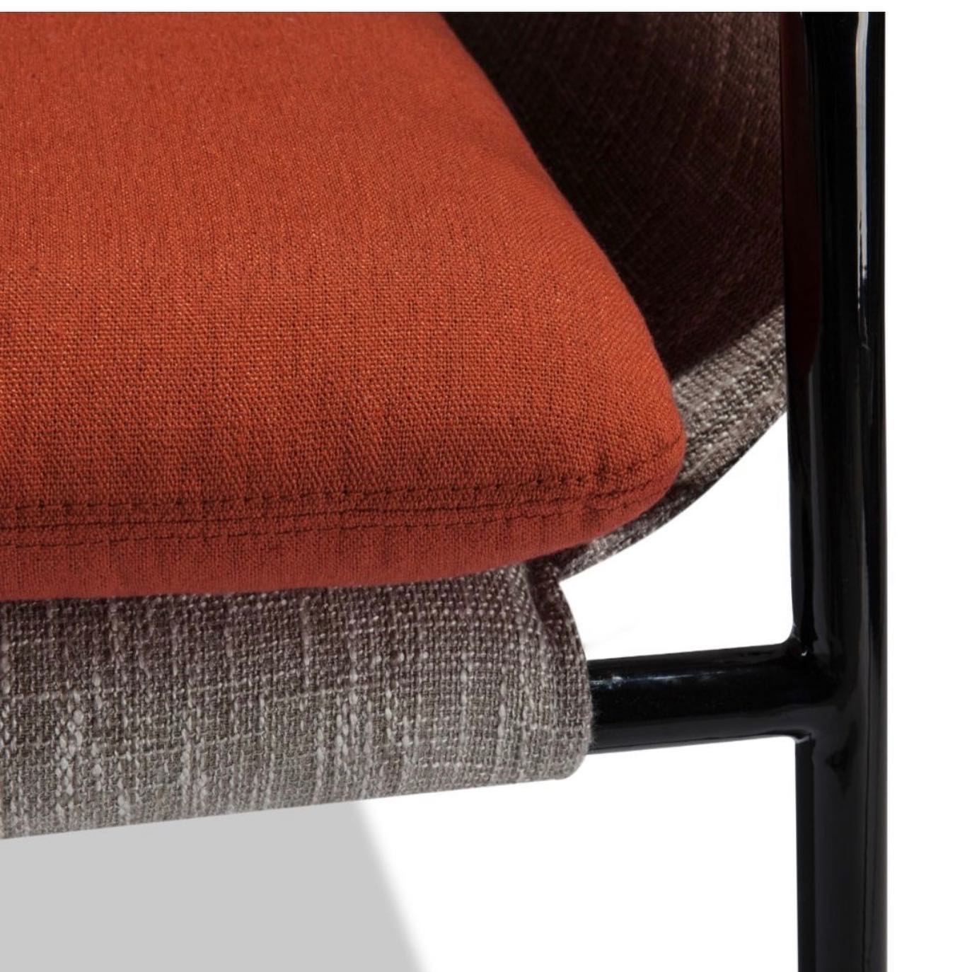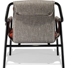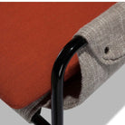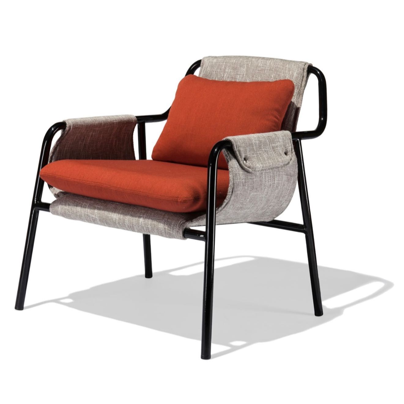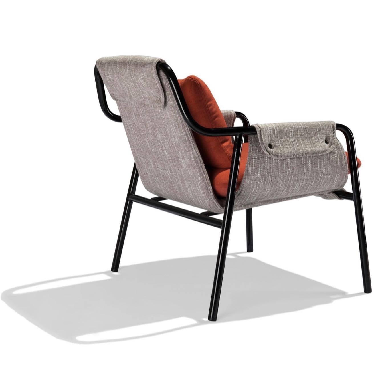 An eclectic combination of slung fabric and angled lounge chair, the Fletcher Chair is one of a kind. Featuring a matte black steel frame, a speckled gray fabric with snap details, and bold titian colored cushion set. Swatches available upon request.