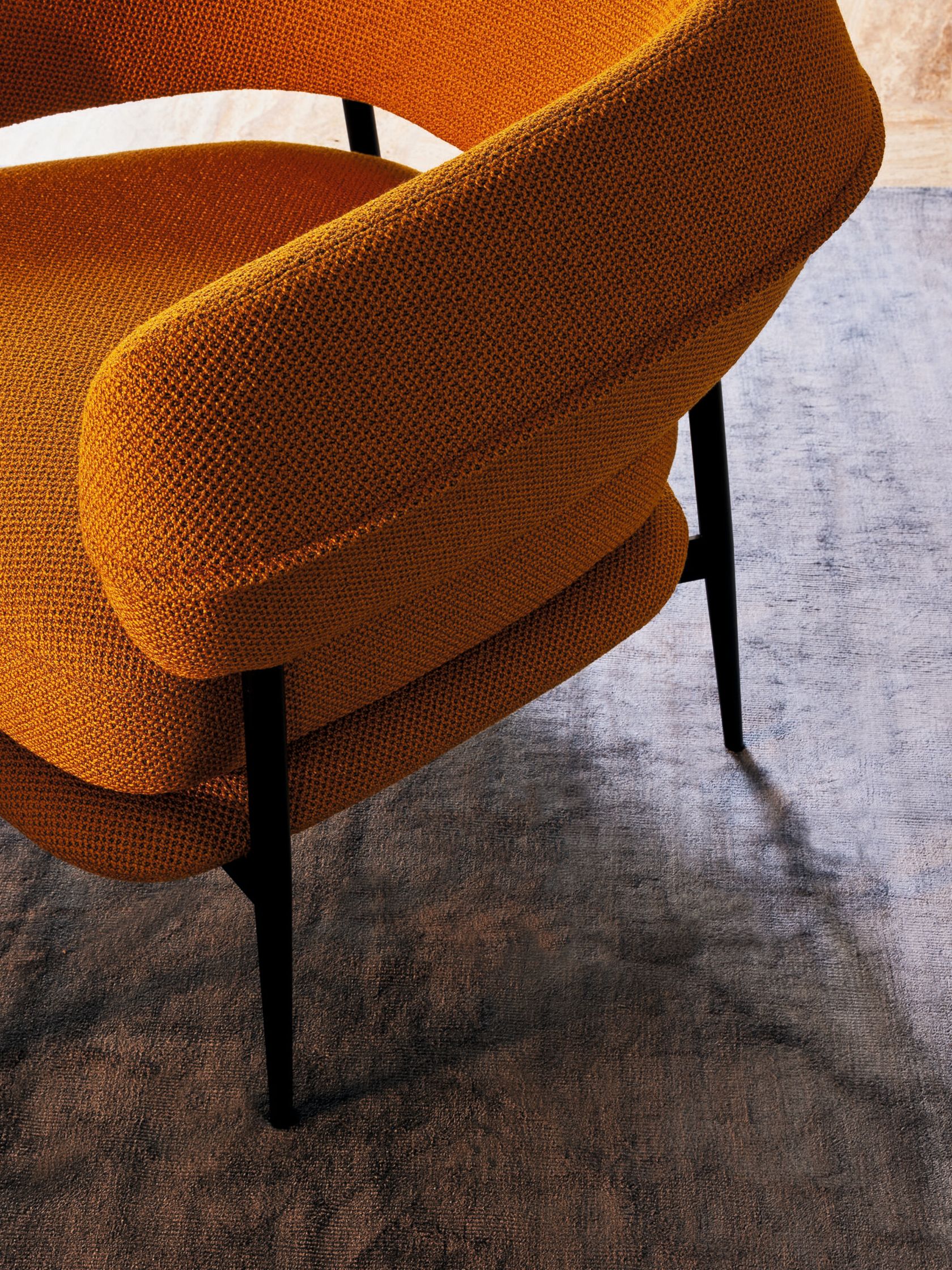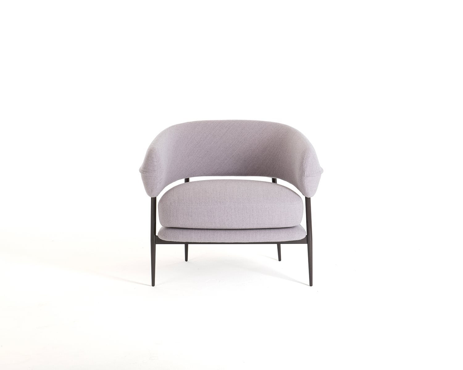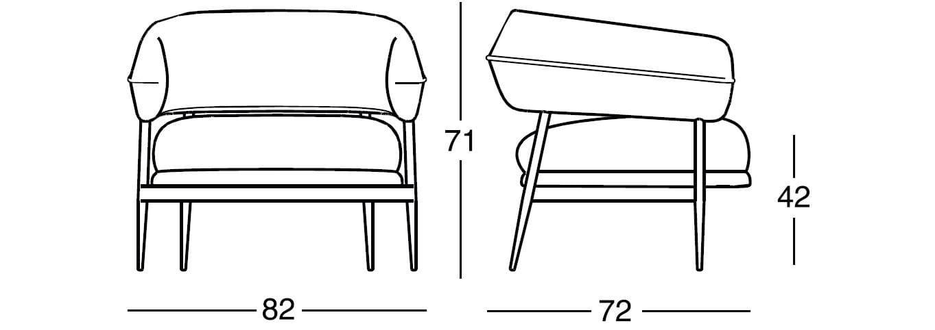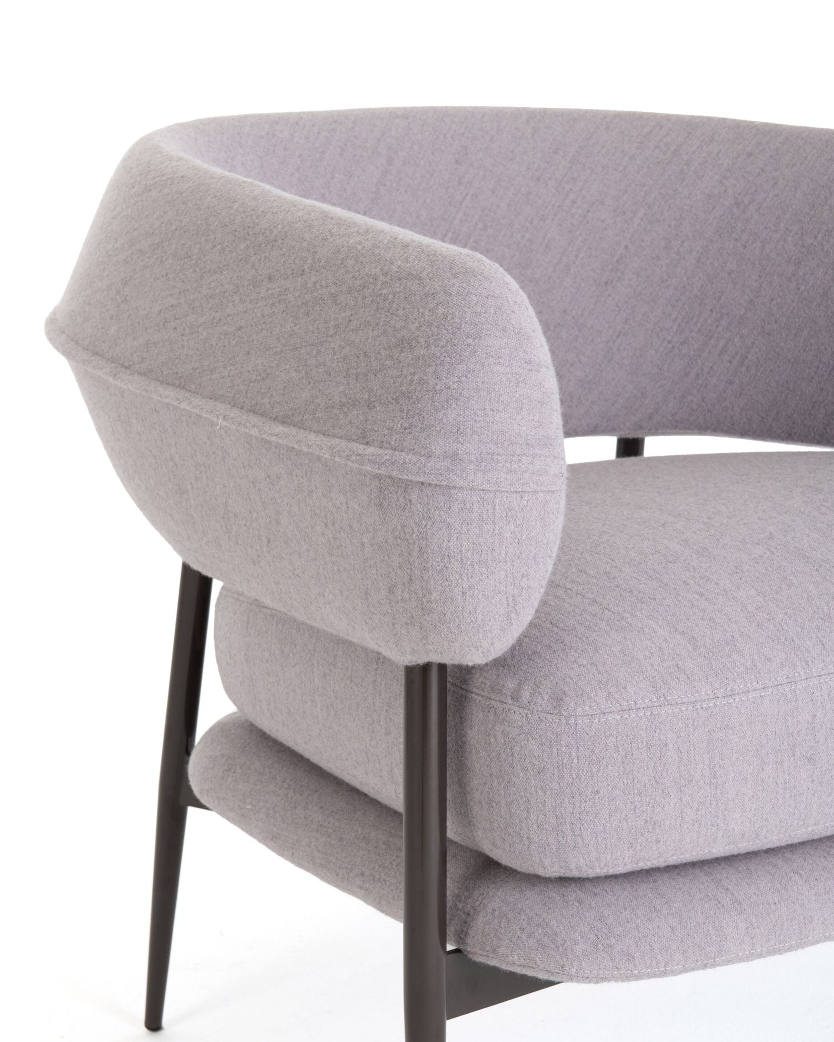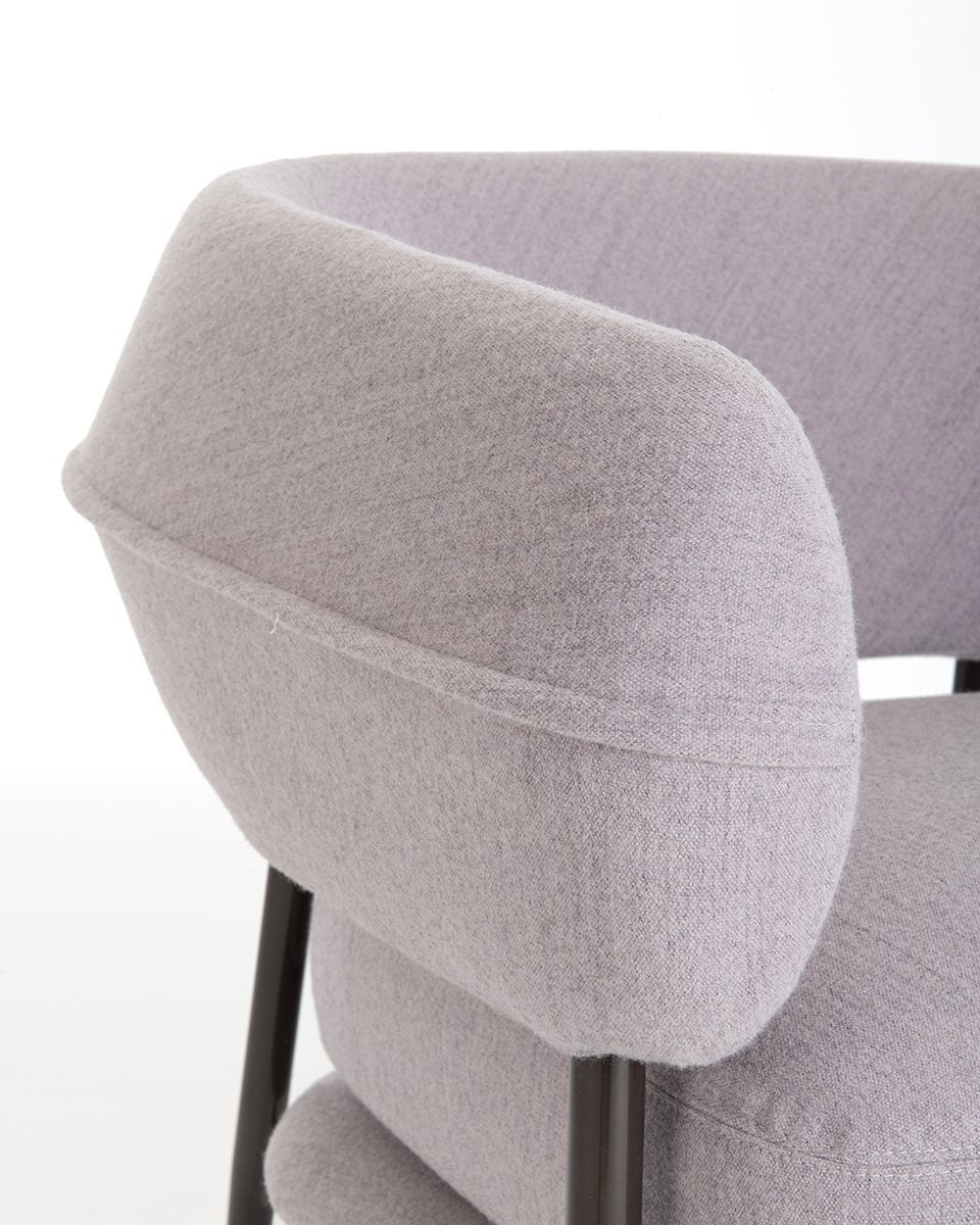 A slim yet sturdy tapered tubular steel frame,framevarnished amaranth, espresso, graphite or black, provides sup-port in the centre for the two overlapping seat cushions while supporting the sus-pended sculpted polyurethane backrest at the top. The semi-circular backrest em-braces the seated user while also serving as an armrest, providing convenient support for them to get up. An air slit separates the backrest from the seat, creating a light-weight effect, which is accentuated by the tapered and slightly slanted legs that add dynamism to the armchair.