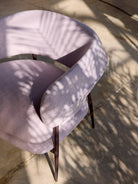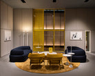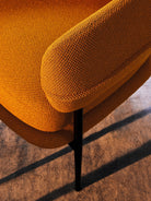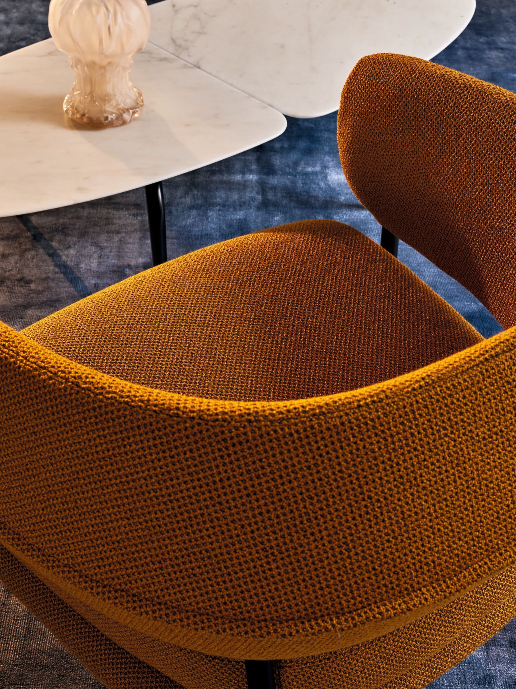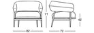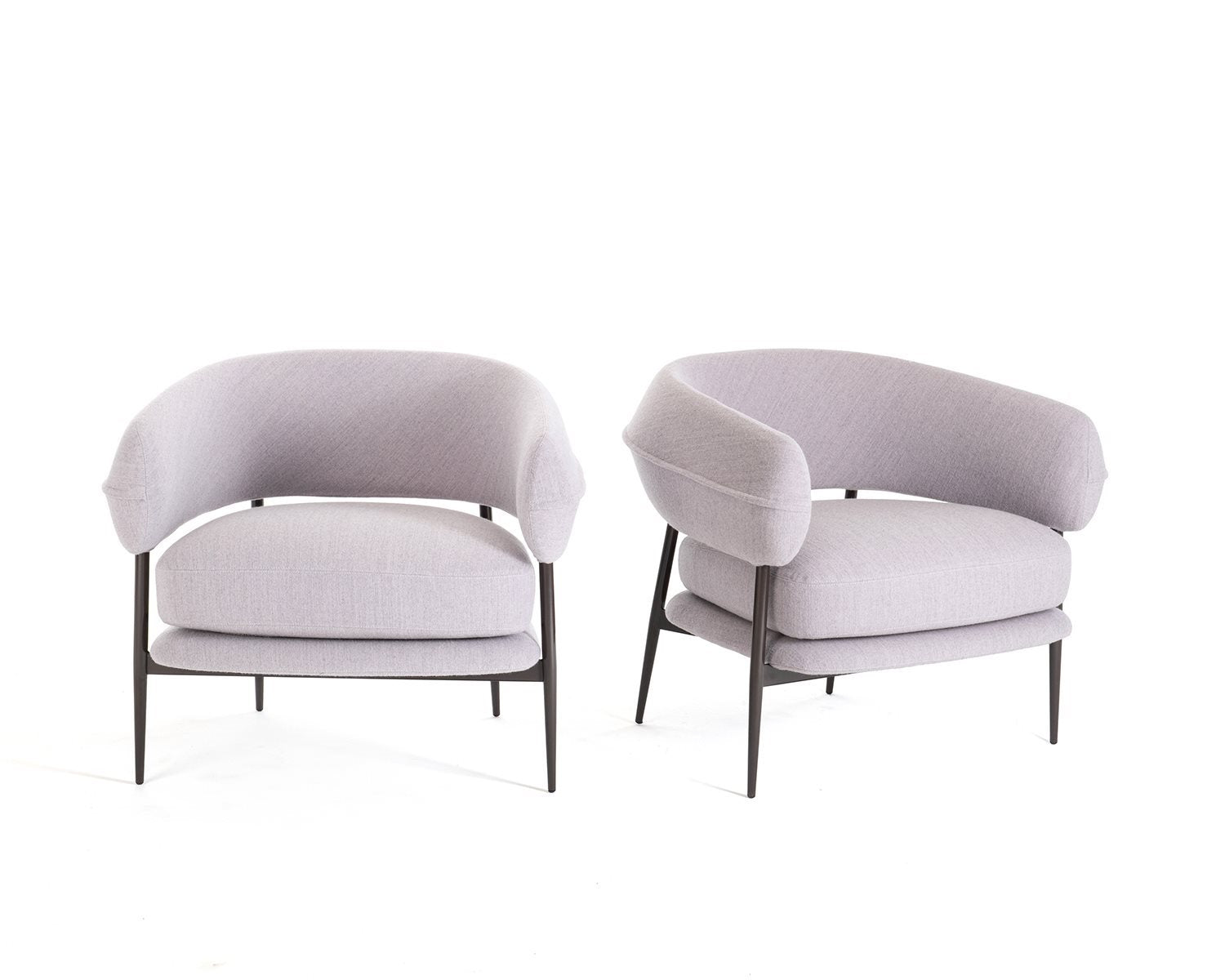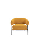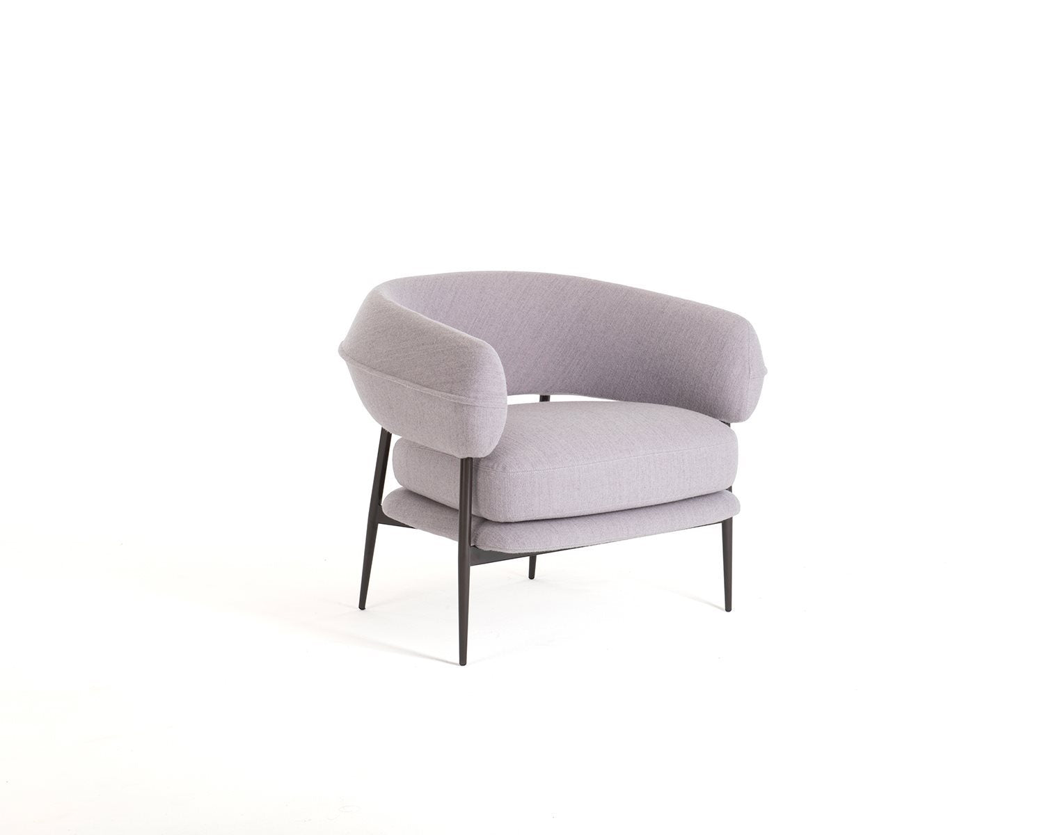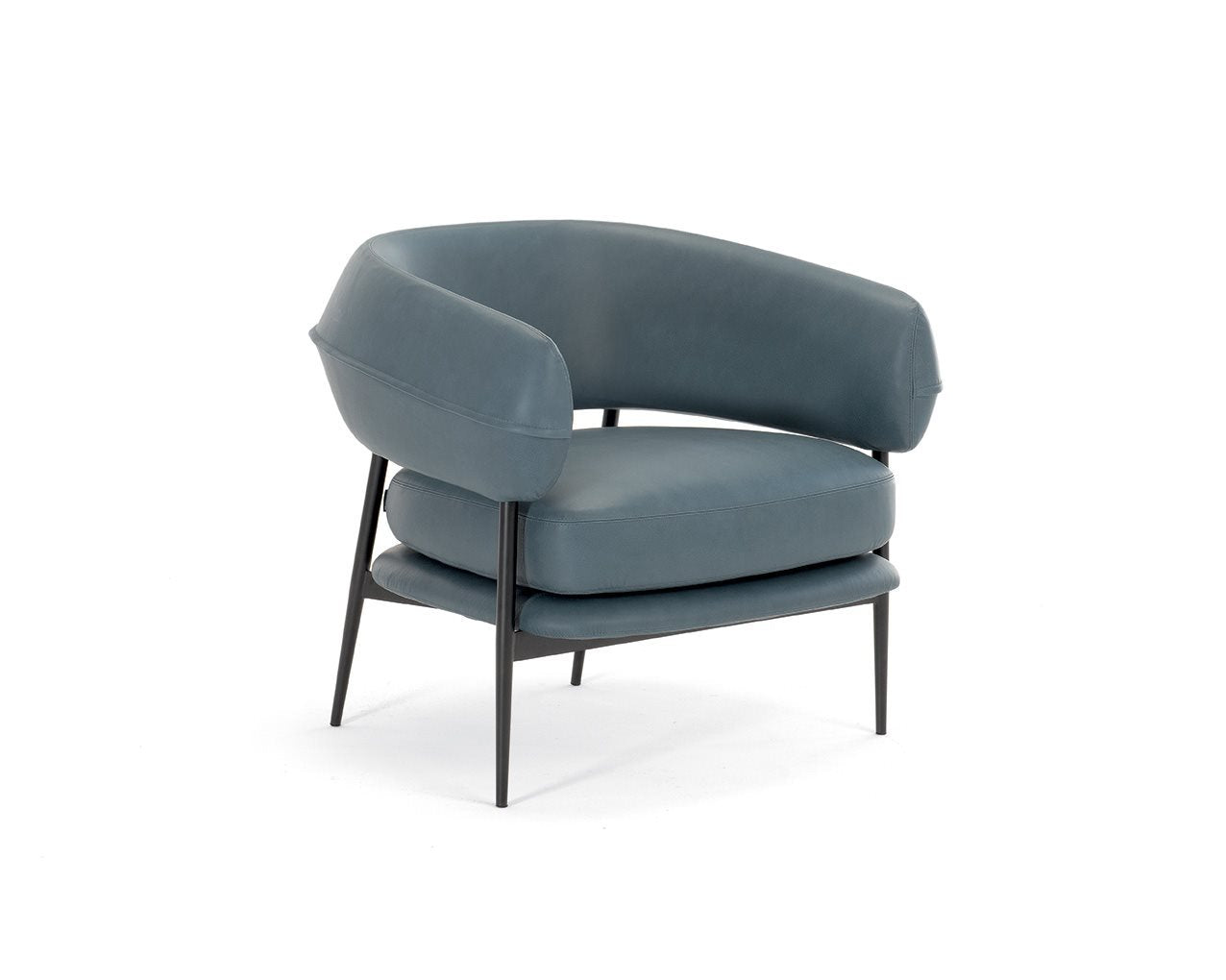 A slim yet sturdy tapered tubular steel frame,framevarnished amaranth, espresso, graphite or black, provides sup-port in the centre for the two overlapping seat cushions while supporting the sus-pended sculpted polyurethane backrest at the top. The semi-circular backrest em-braces the seated user while also serving as an armrest, providing convenient support for them to get up. An air slit separates the backrest from the seat, creating a light-weight effect, which is accentuated by the tapered and slightly slanted legs that add dynamism to the armchair.