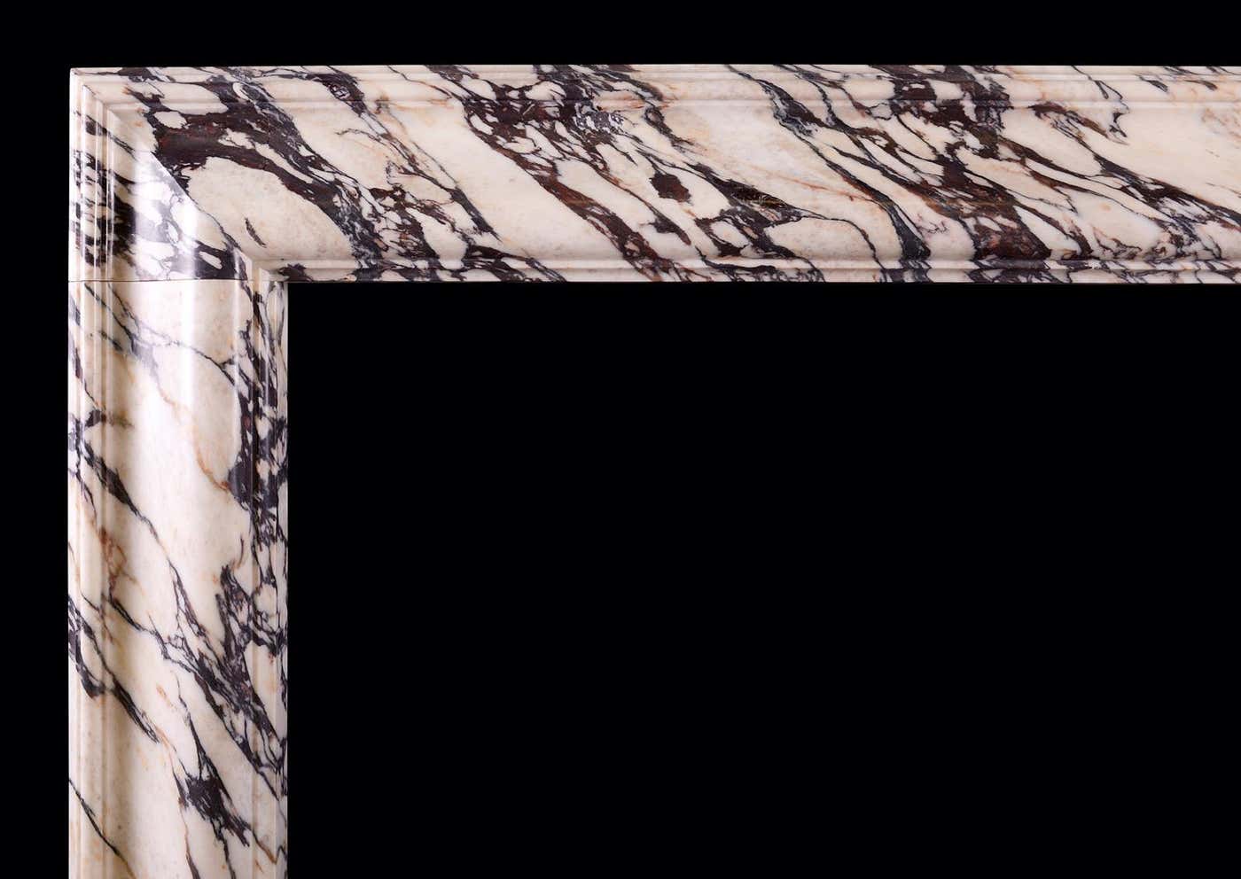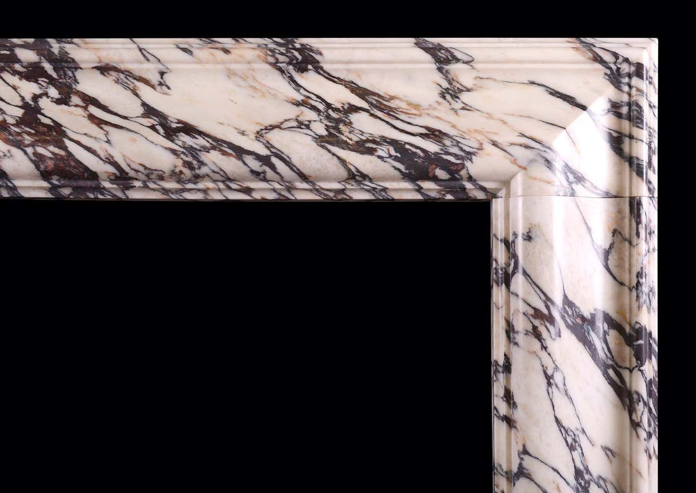A bolection fireplace in Italian Breche Violiette marble. The creamy white background marble with striking purple and violet veining throughout.
