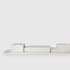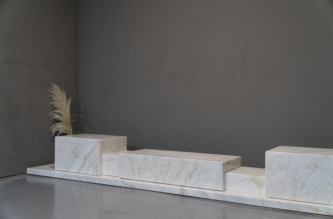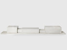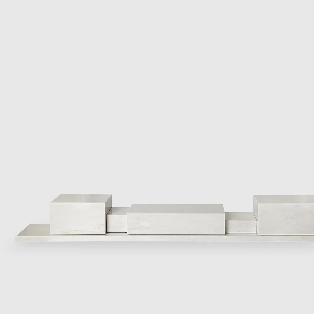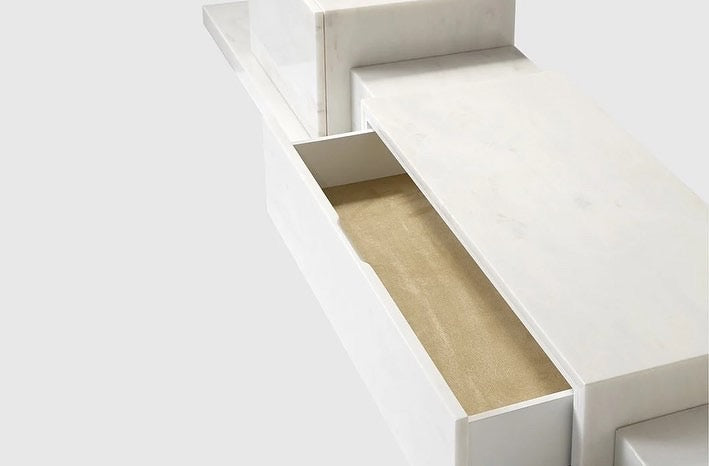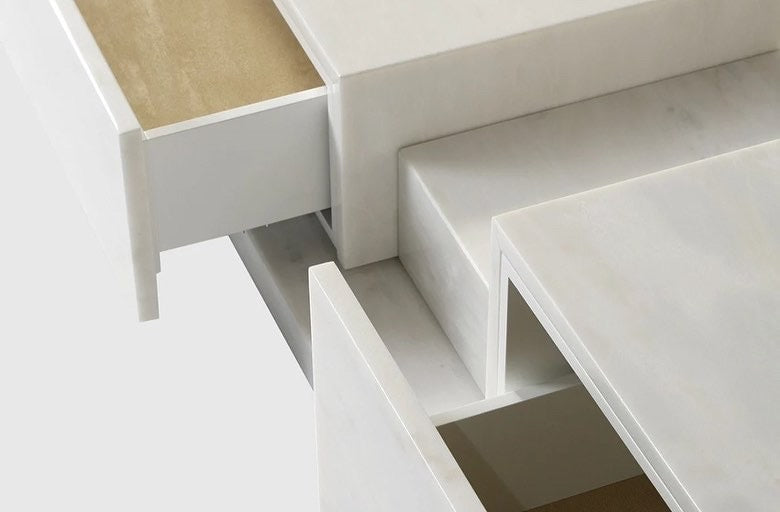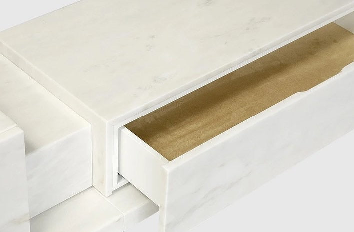 combination of boxes of different dimensions and angles that form a minimal sideboard, which synthesize functionality and provide seemingly imperceptible storage space. the perfect combination of the stone’s mitre cut, using sophisticated cutting machines, and the mastery of gluing by the hand of experienced artisans.