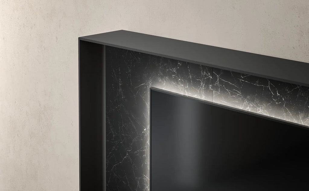 Wallover® Composition 6 is a TV partition in Kera Invisible White. Cornice is a module of the Wallover® System designed to transform a TV, even a large one, into a picture. Cables are housed in the rear technical space, so they can be managed invisibly without the need to move electrical sockets. The Picture Frame is combined with two Bookcases that break up the rhythm of the composition and two closed elements with flap doors, called Bases.