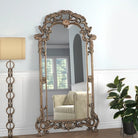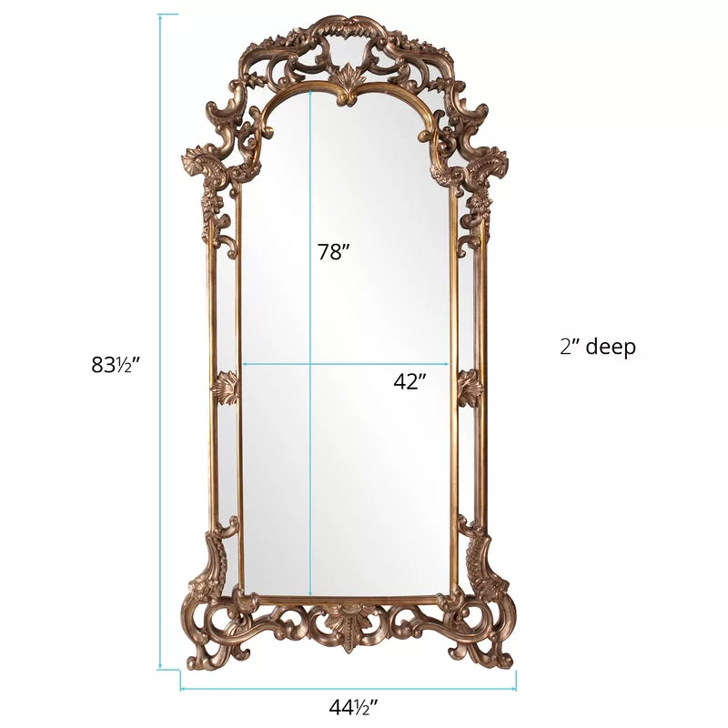 This full-length mirror adds an eye-catching glam accent to your space with plenty of light and an ornate look. Its rectangular frame is crafted from a reflective glass panel in a dramatic arched silhouette. The design features a resin frame with elegant and refined scrollwork detailing, right down to the feel. We love that this full-length mirror comes in a variety of hues, from classic bronze to hot pink. We love that this mirror mounts to the wall or leans up against it for a more contemporary aesthetic.