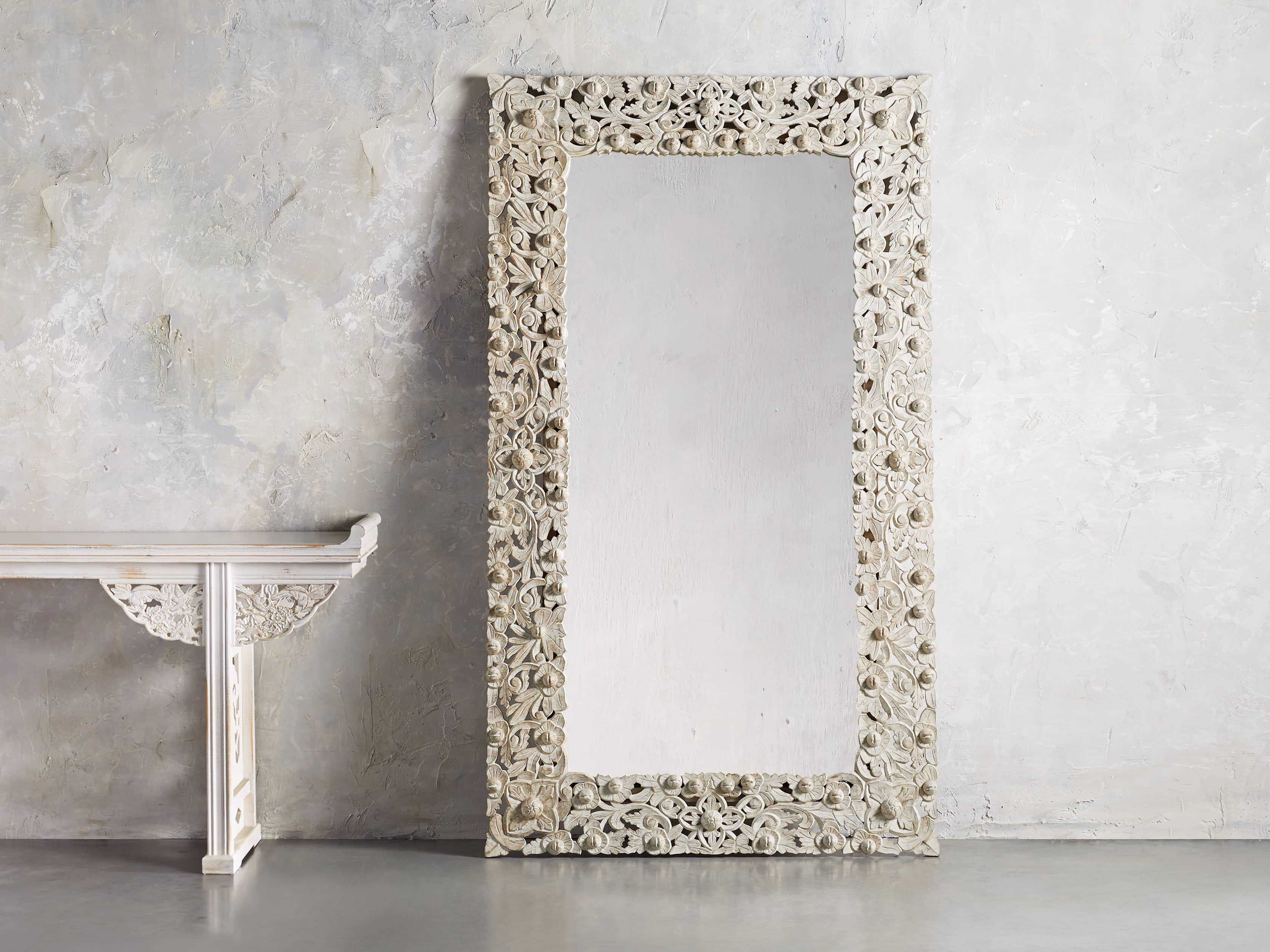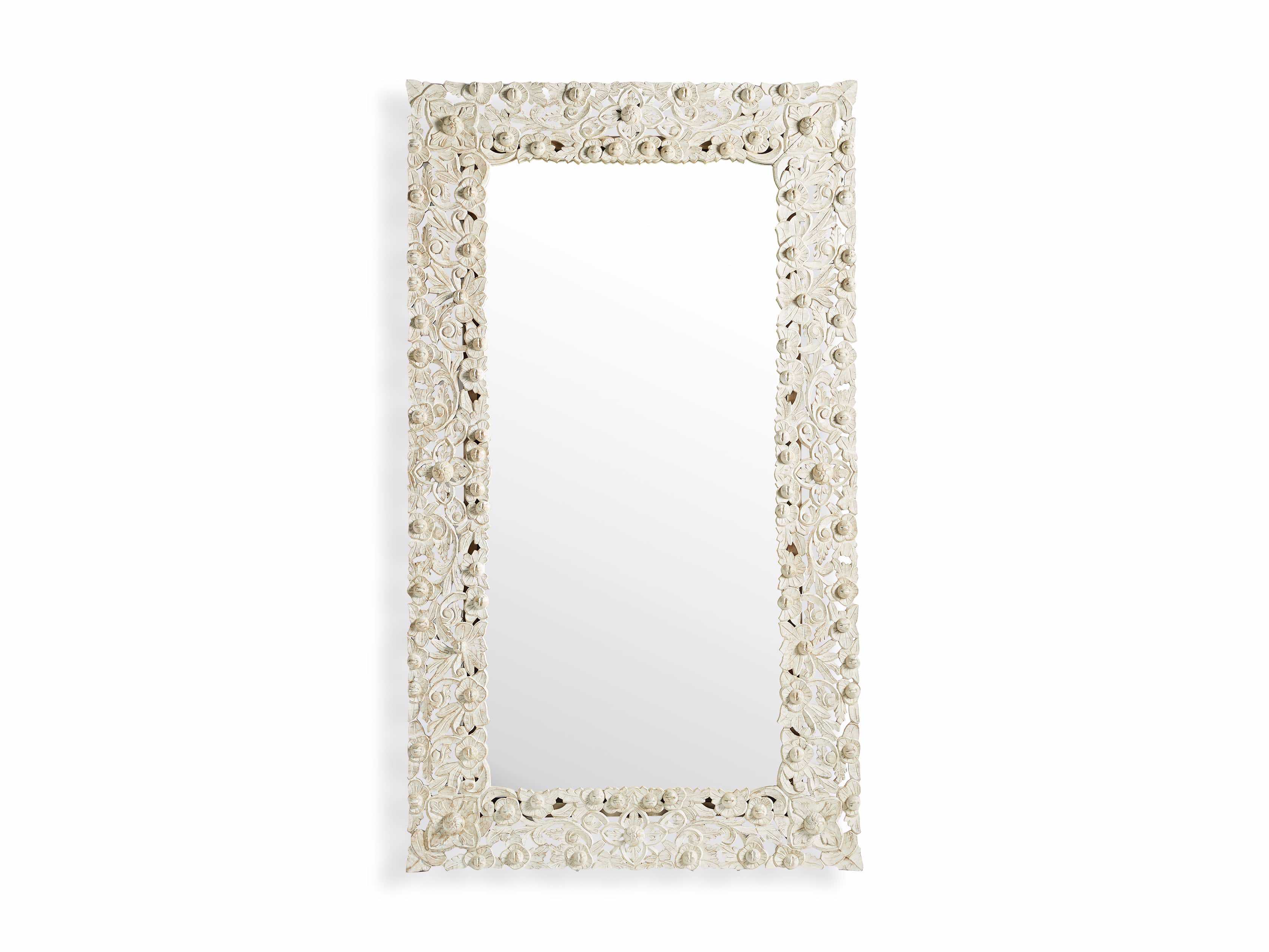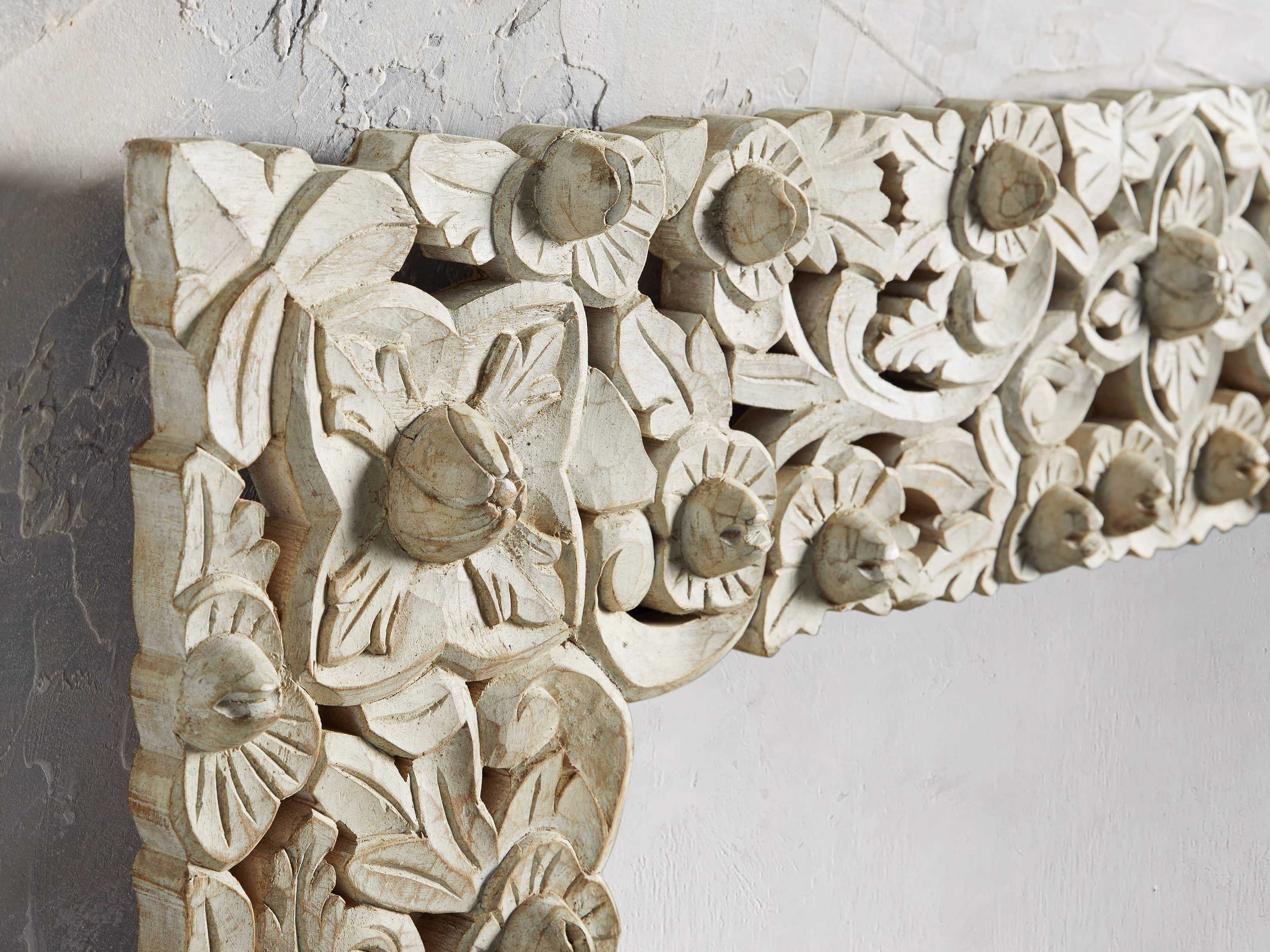 Framed in intricately hand-carved mango wood, our Flourish mirror is elegantly decorated with detailed flowers, leaves, and floral medallions. Artfully hand-applied finishes a