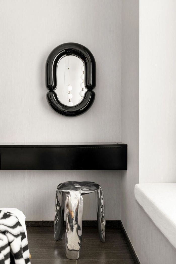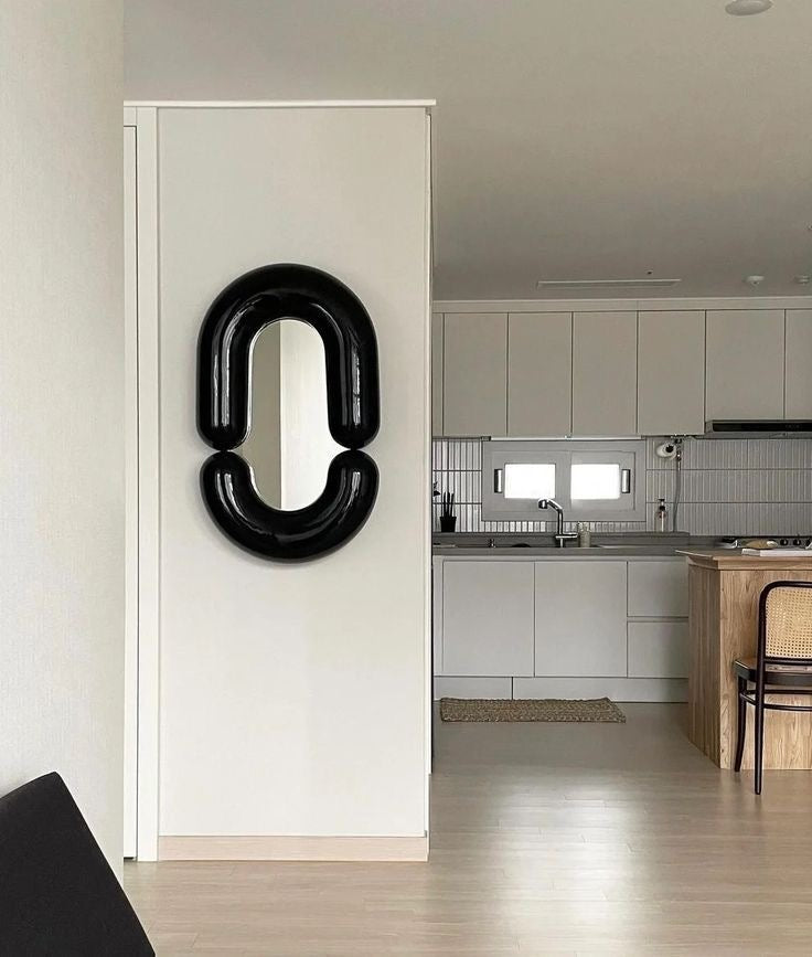 The Hennu Mirror's unique, organic shape sets it apart as a statement piece, reflecting a sense of creativity and playfulness. Crafted with meticulous attention to detail, the polished resin and wood frame in pristine white not only offers a clean and fresh aesthetic but also introduces a dynamic and sculptural element to your decor.