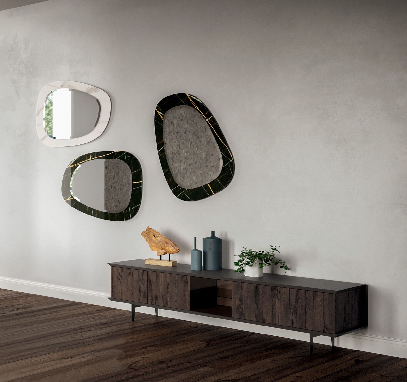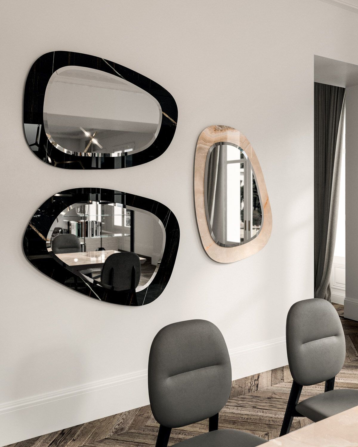Miami Vice is an elegant organic double-depth shape, outlined by a precious Marble Glass frame that reflects its richness.‎ The thin bevels multiply the reflected image and create chromatic compositions capable of providing light and movement.‎ It is not just a mirror, but a timeless gem that transforms every room into an art gallery.‎