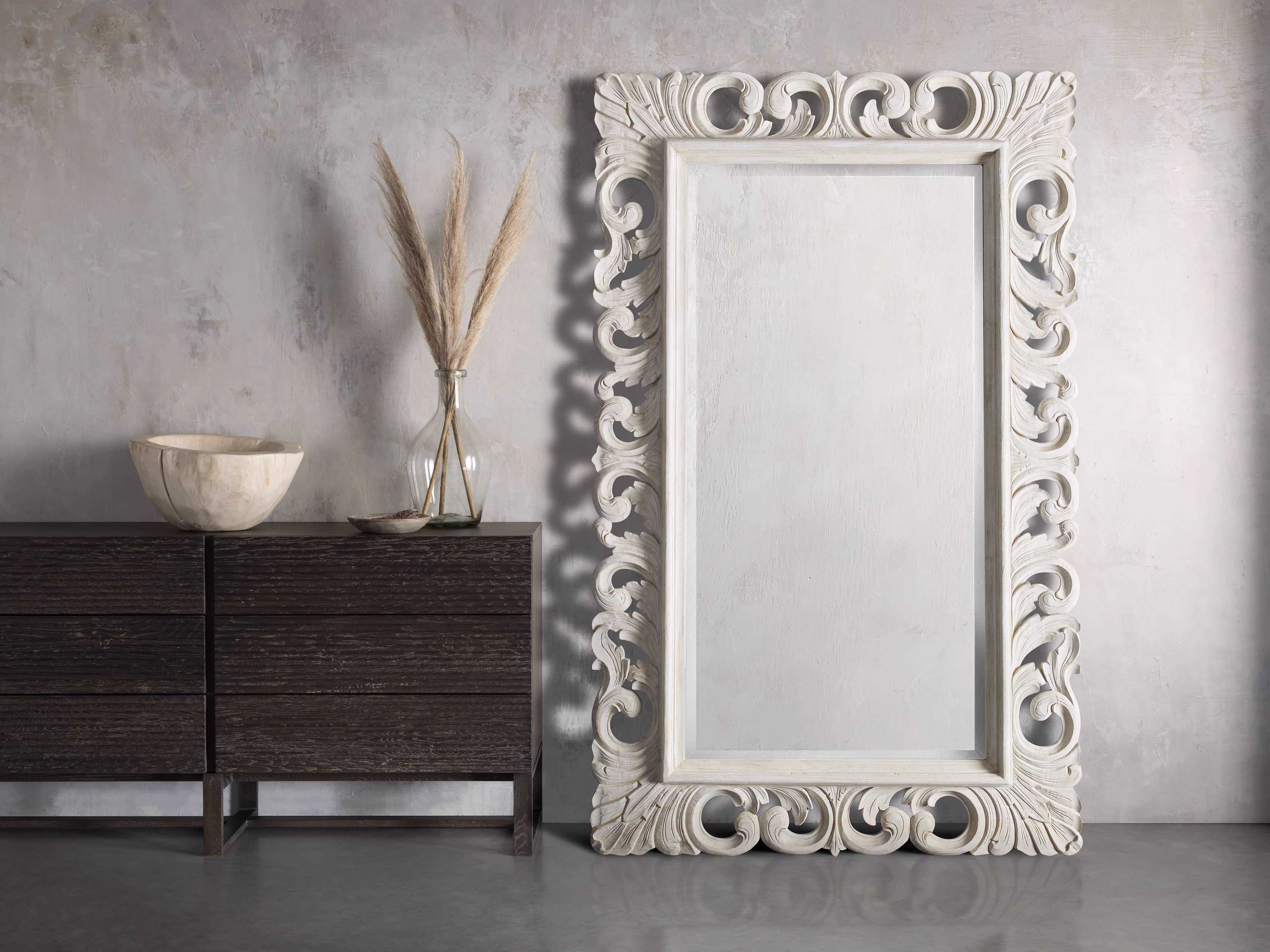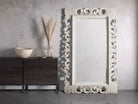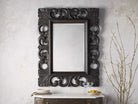 The beautifully hand-carved frames of our Porter Mirrors are crafted by Indonesian artisans from solid teak wood. Beveled glass complemented by hand-applied finishes and curve