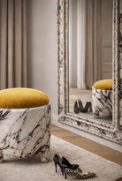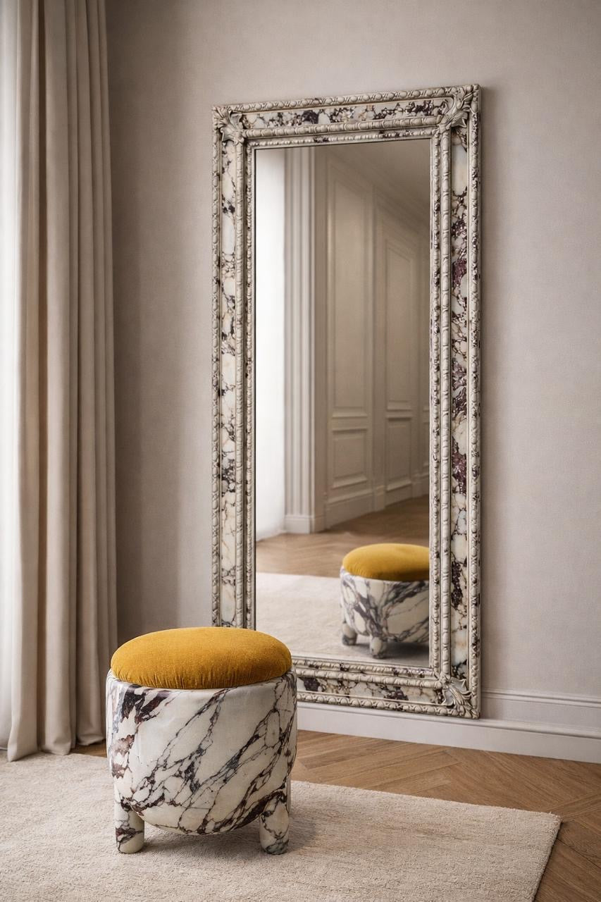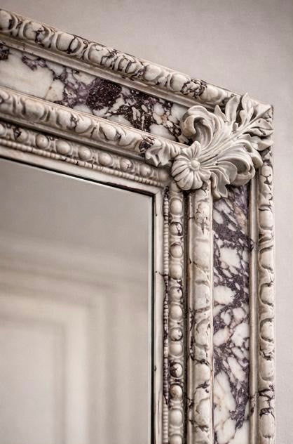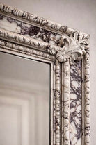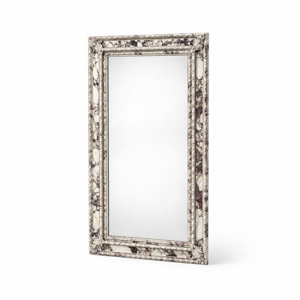 The frame is richly detailed with classical molding, enhanced by a striking marble-inspired finish that blends soft ivory tones with dramatic natural veining. This unique surface treatment gives the mirror a sculptural presence—both opulent and artistic—while remaining neutral enough to complement a wide range of interiors.