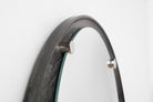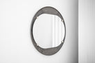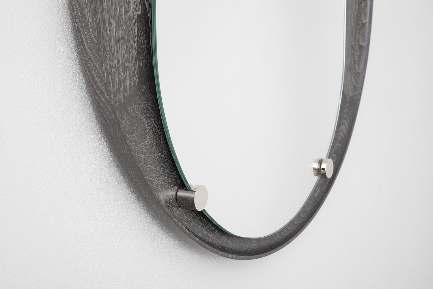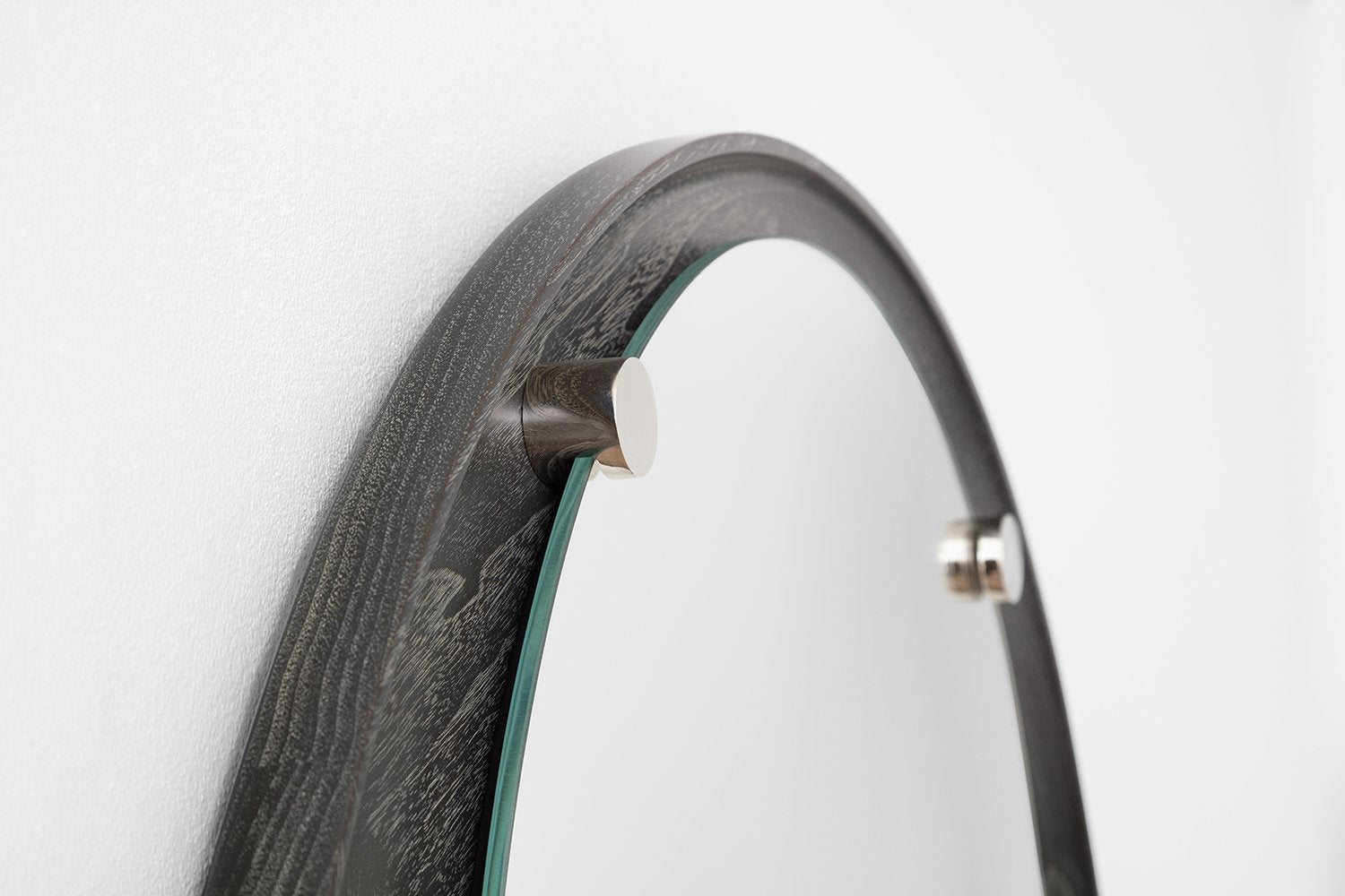 The Roswell Mirror is inspired by the geometric shapes and patterns of the 1970’s. Roswell’s sculpted circular Ash oak wood grains frame breaks out of the box, bringing movement and light to your interiors spaces. Suspended by four hand patinated clips, our bronze, smoke, or starphire mirror will capture your attention as you enter a room.