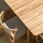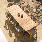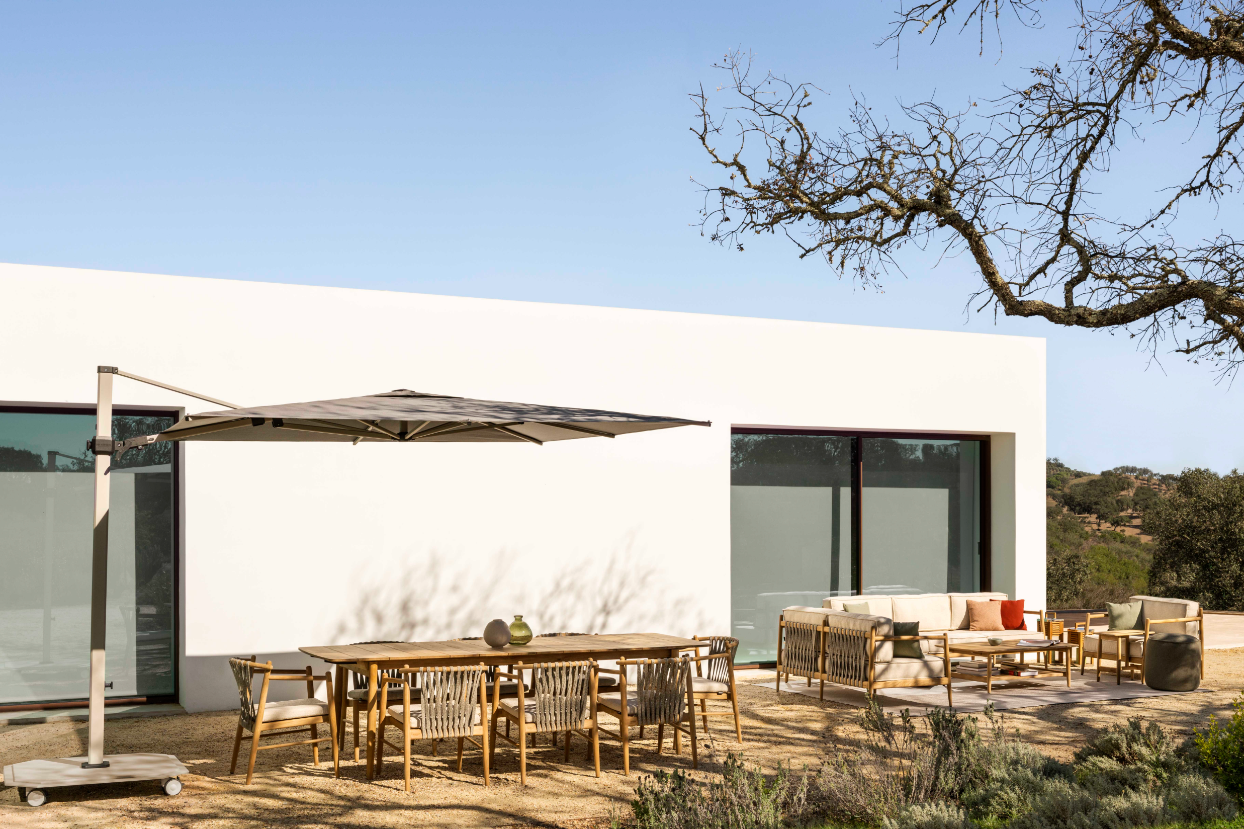 Characterised by its curving, the framework is made of natural teak that pay homage to old craftsmanship. The feeling of being close to nature continues thanks to the handwoven strap with a subtle touch of green. The accompanying cushions of the lounge pieces are made with a maximum of comfort to fully enjoy your relaxation outdoors.