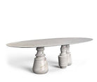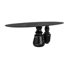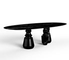 Playing with function and sculptural form, Pietra dining table shapes a timeless experience through its classical aura and finest Nero Marquina black marble. Reminding the renaissance era, its oval top gently lies in two-three robust Resin pour wood structures columns matching the marble top, each one conceived from solid blocks hand-sculpted and turned to create different details for additional texture. A noble material carved , conceiving a soulful statement dining table ideal for elegant and refined dining rooms. Designed for eight seats, the contemporary feel of Pietra is effortlessly stylish and it is suitable for indoor or outdoor use