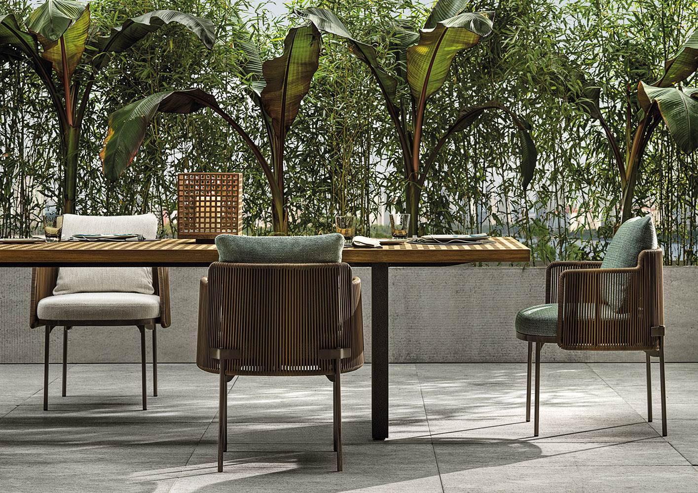 The seats become deeper, larger and more relaxing, while the metal frame, in a new outdoor finish, is covered with the wicker-effect cords available in two colours: Mud and Liquorice.