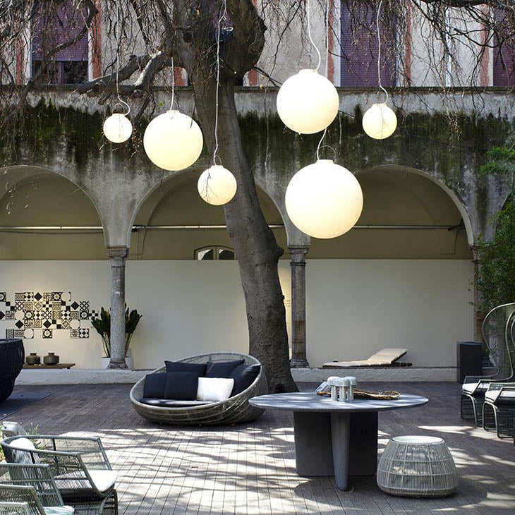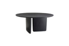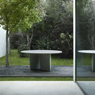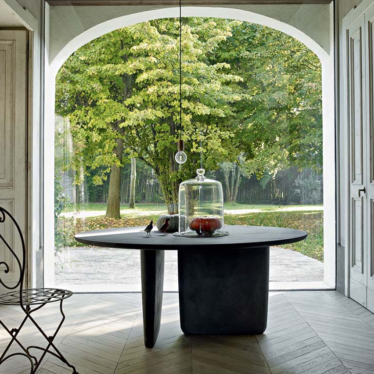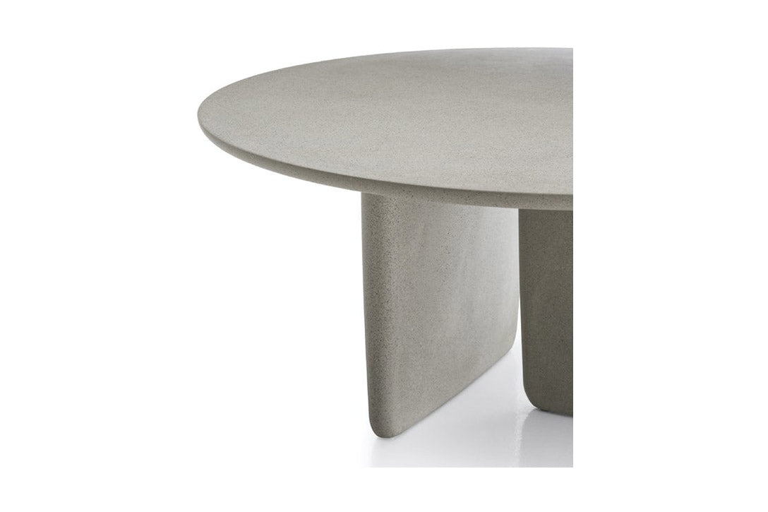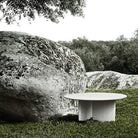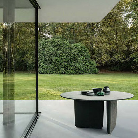 The name itself is a reference to the polished stones (tobi-ishi) used ornamentally in traditional Japanese gardens. The overhang of the top and the vertical trapezoidal bases set at right angles generate an essential sculptural figure that appears to change shape depending on the point of observation. In the outdoor version, the table is made of cement in two different colors.