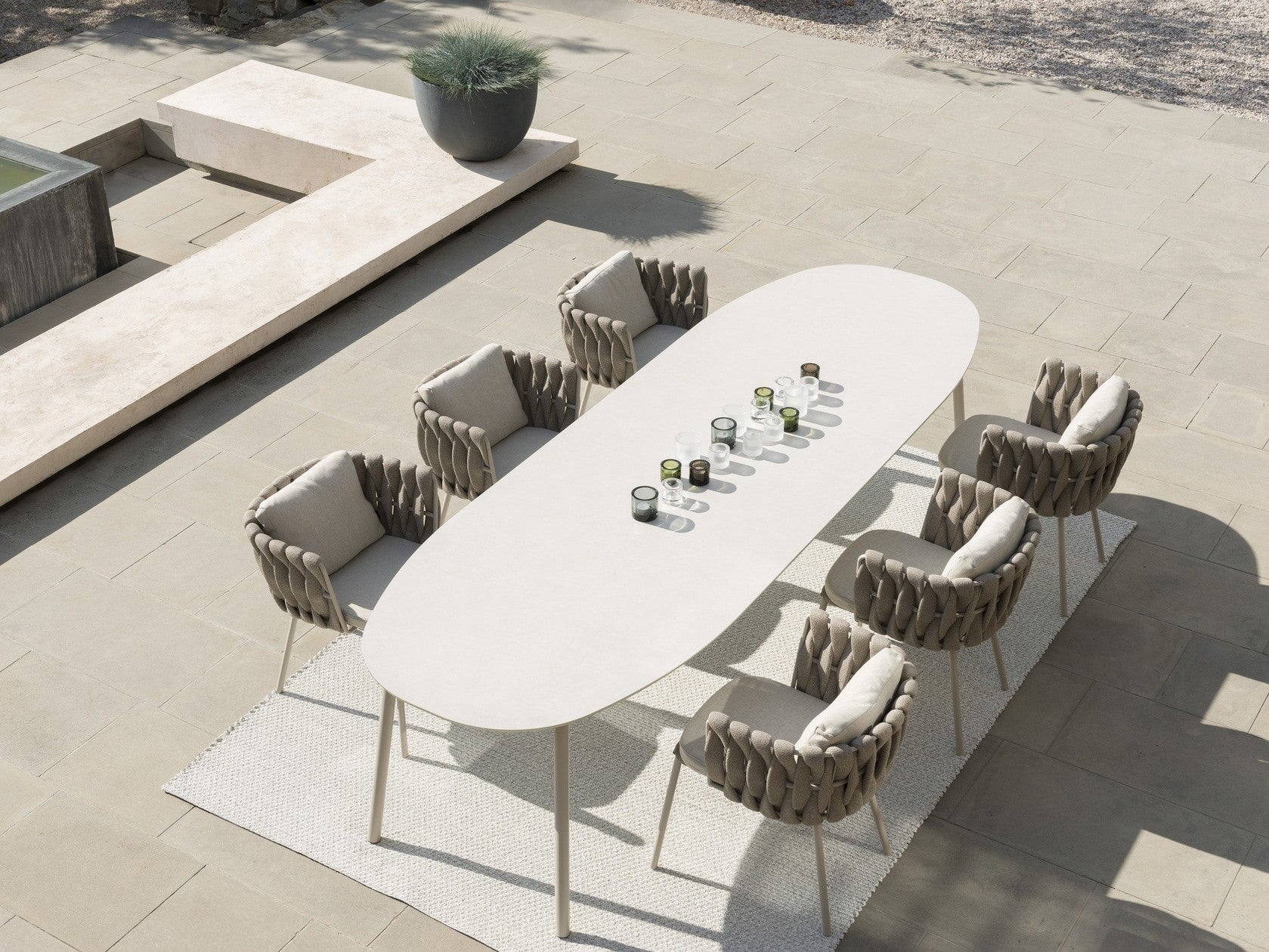 The Tosca outdoor furniture collection is warm, intriguing and inviting. It was the first time Tribù worked with internationally acclaimed female designer Monica Armani to draw an outdoor design with a feminine touch. Tosca has rounded forms, tapered legs and an elegant seating shell with extra-wide braiding.
