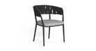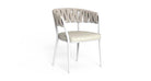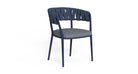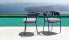 Whip dining armchair is the perfect solution to give character to your living area in the garden. The lightweight aluminum frame is developed around the comfortable seat. The wall bars and armrests are one that is highlighted by the geometric pattern drawn by the padded rope. This dynamic weave evokes a sense of movement and lightness, which is reflected in the outdoor living room.