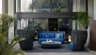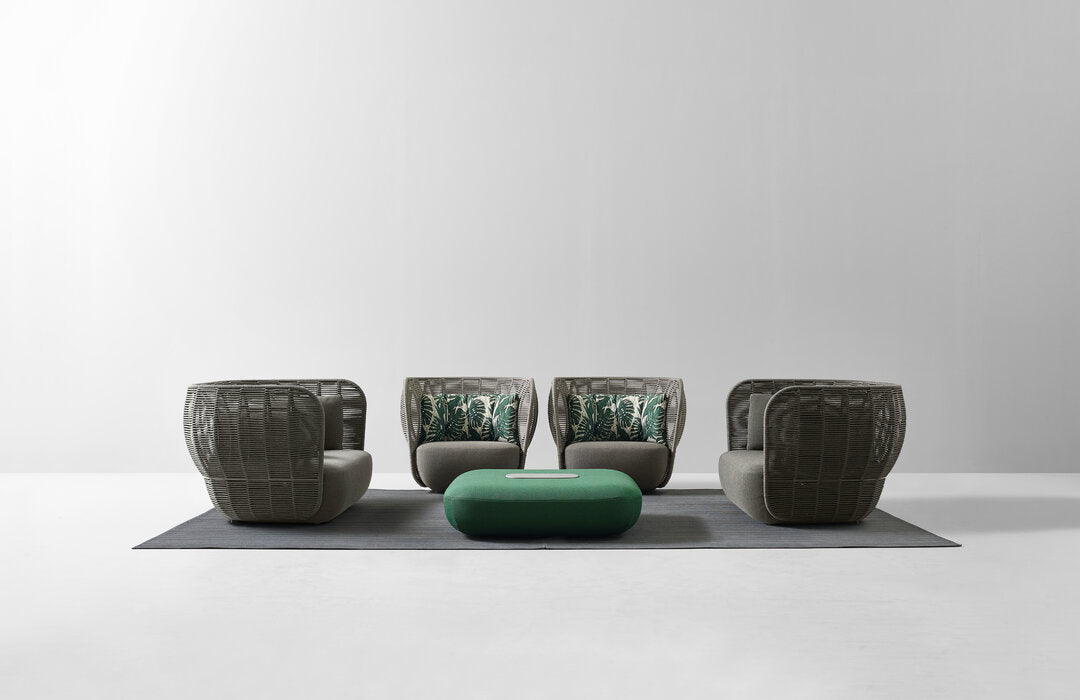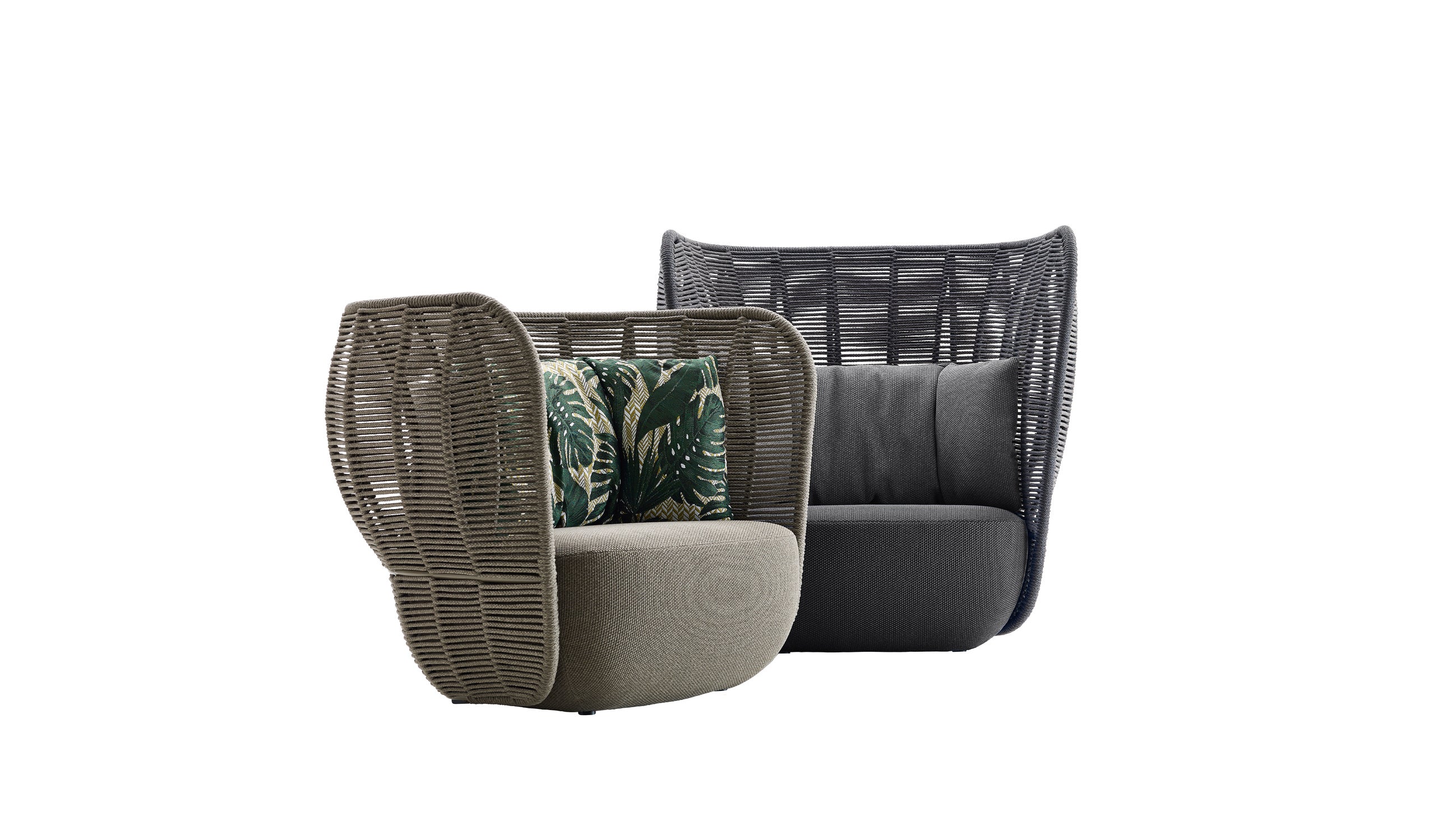 Bay is a sculptural, monolithic collection of braided outdoor furnishings. Enveloping braided volumes are combined with padded rock-like seats and soft cushions that reflect the elegance, comfort and refinement of B&B Italia’s indoor products. Sensually shaped, their double braiding creates air pockets that grant transparency and lightness to the collection.