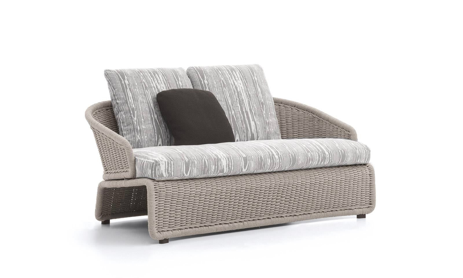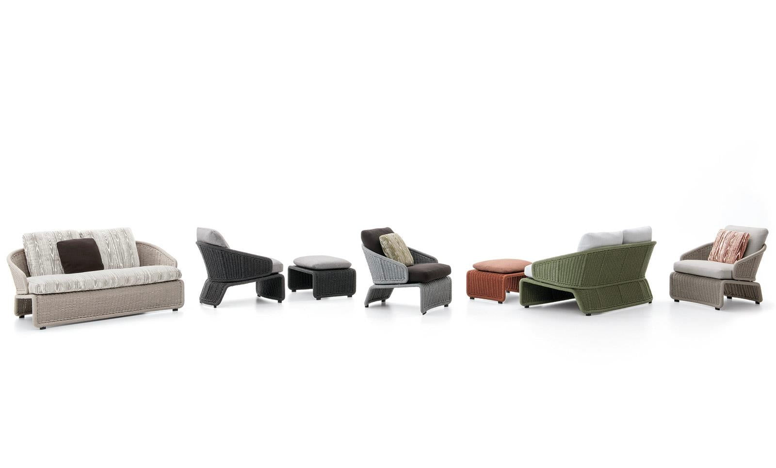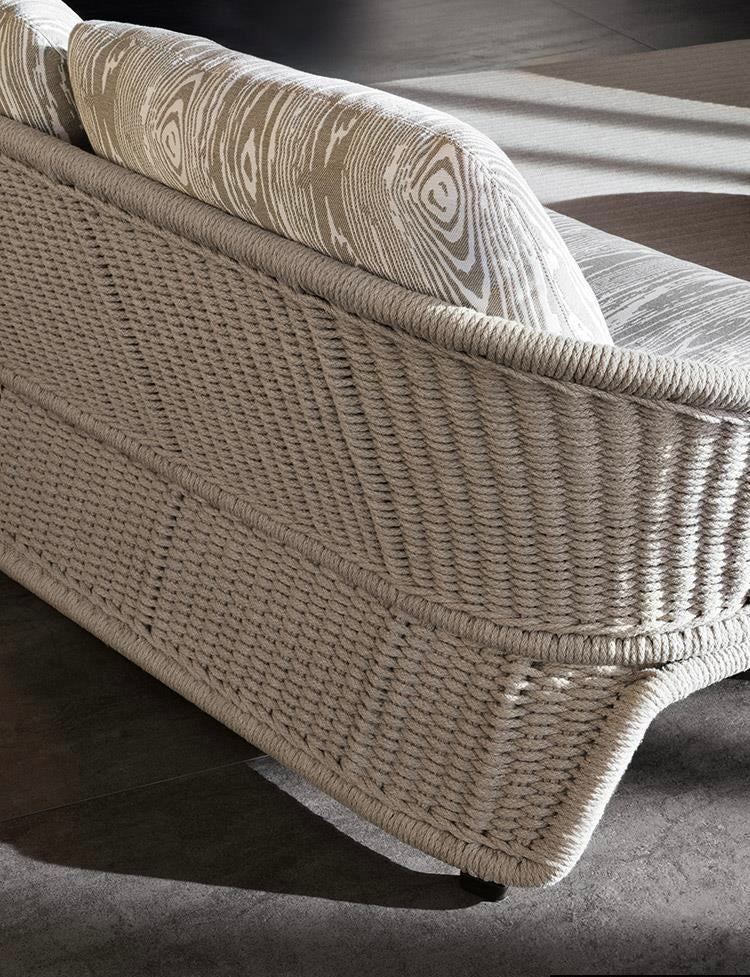 The stainless steel structure is first sandblasted to remove any imperfections and then epoxy powder-coated in the following colors: Clay, Pewter, Sunflower, Khaki Green and Rust. The stainless steel structure is completely covered in special polypropylene fiber that is similar to traditional woven wicker and comes in an array of sophisticated colors: Sand, Elephant Grey, Charcoal, Sunflower, Khaki Green and Rust. The epoxy-painted finish on the stainless steel structure is color-coordinated to match the cord. It is in Pewter color when the cord covering is in Elephant Grey or Charcoal, and is in the same shade as the cord for the other colors: Clay, Sunflower, Khaki Green and Rust. The cushions have internal padding in high resilience expanded polyurethane foam and are covered in water resistant fiber and fabric. The completely removable upholstery covers come in a vast array of outdoor fabrics that look sensational when combined with the cord structures.