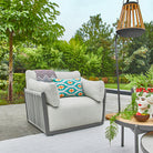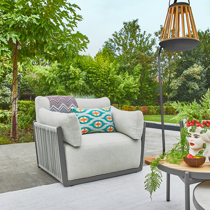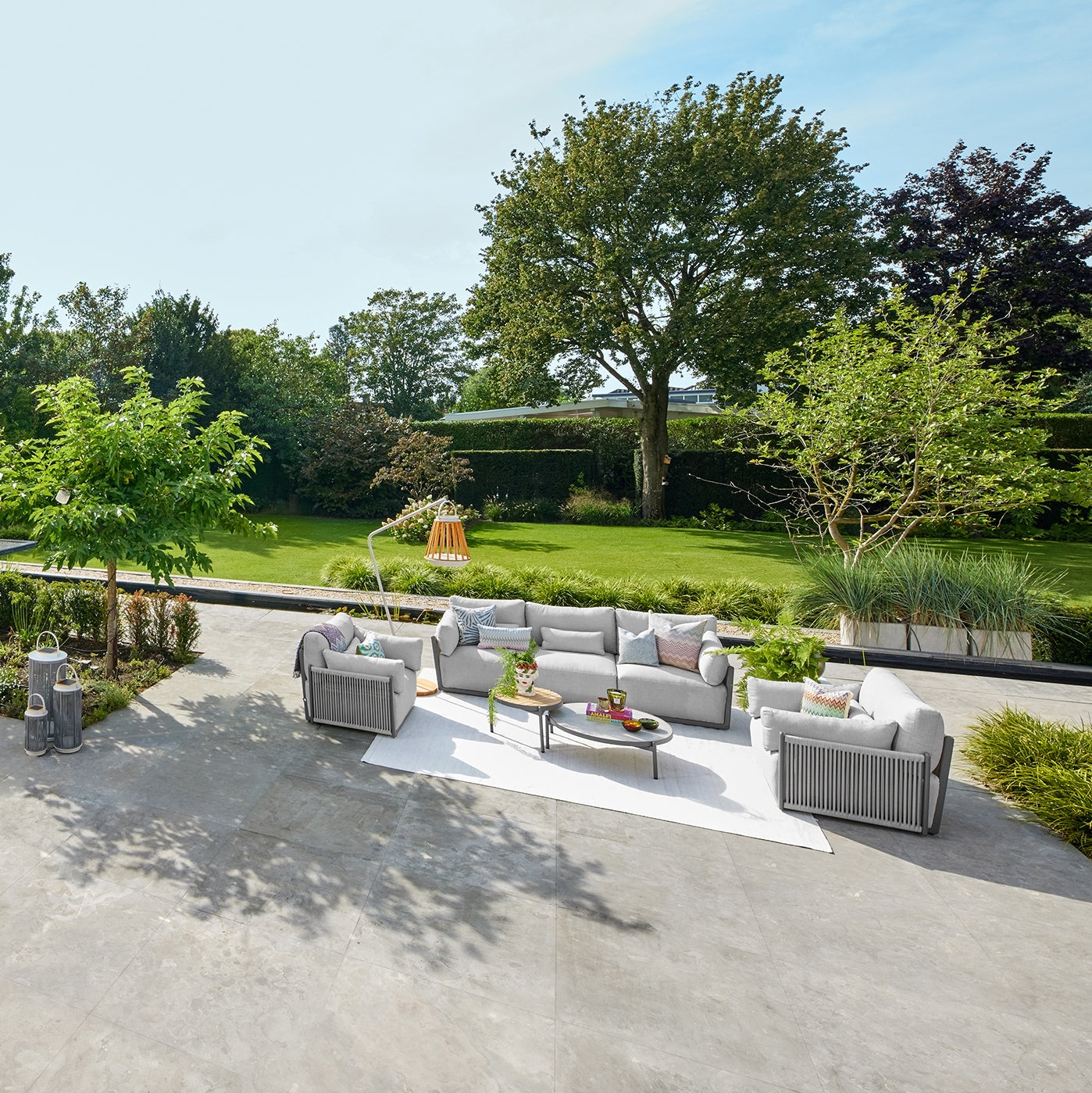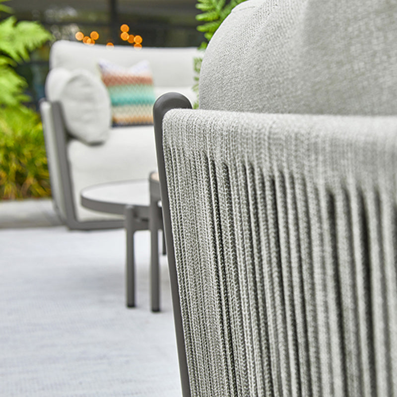 The lounge chair consists of a very solid frame made of industrial aluminium. The frame is strung with rope in a so-called fishbone weave. The premium acrylic quality rope is resistant to all weather conditions and particularly colourfast.