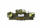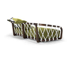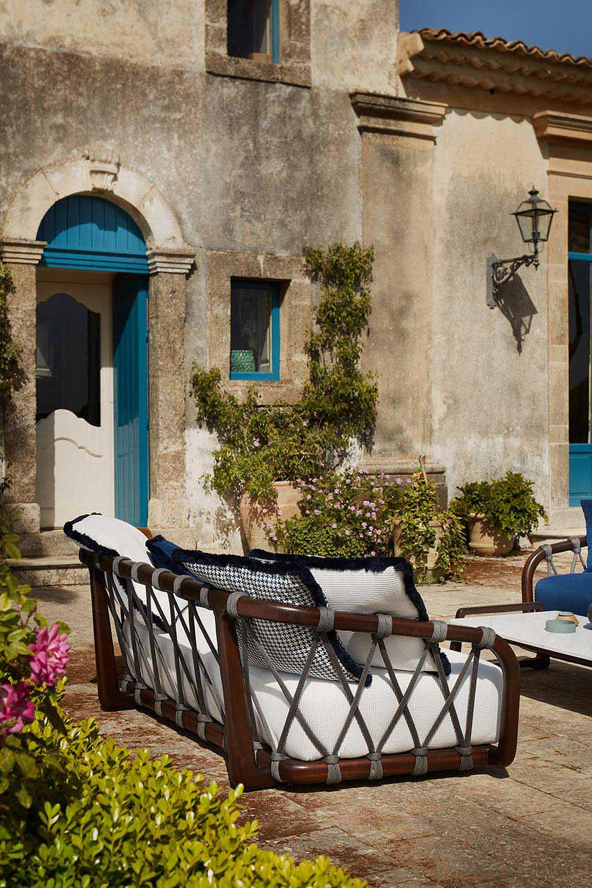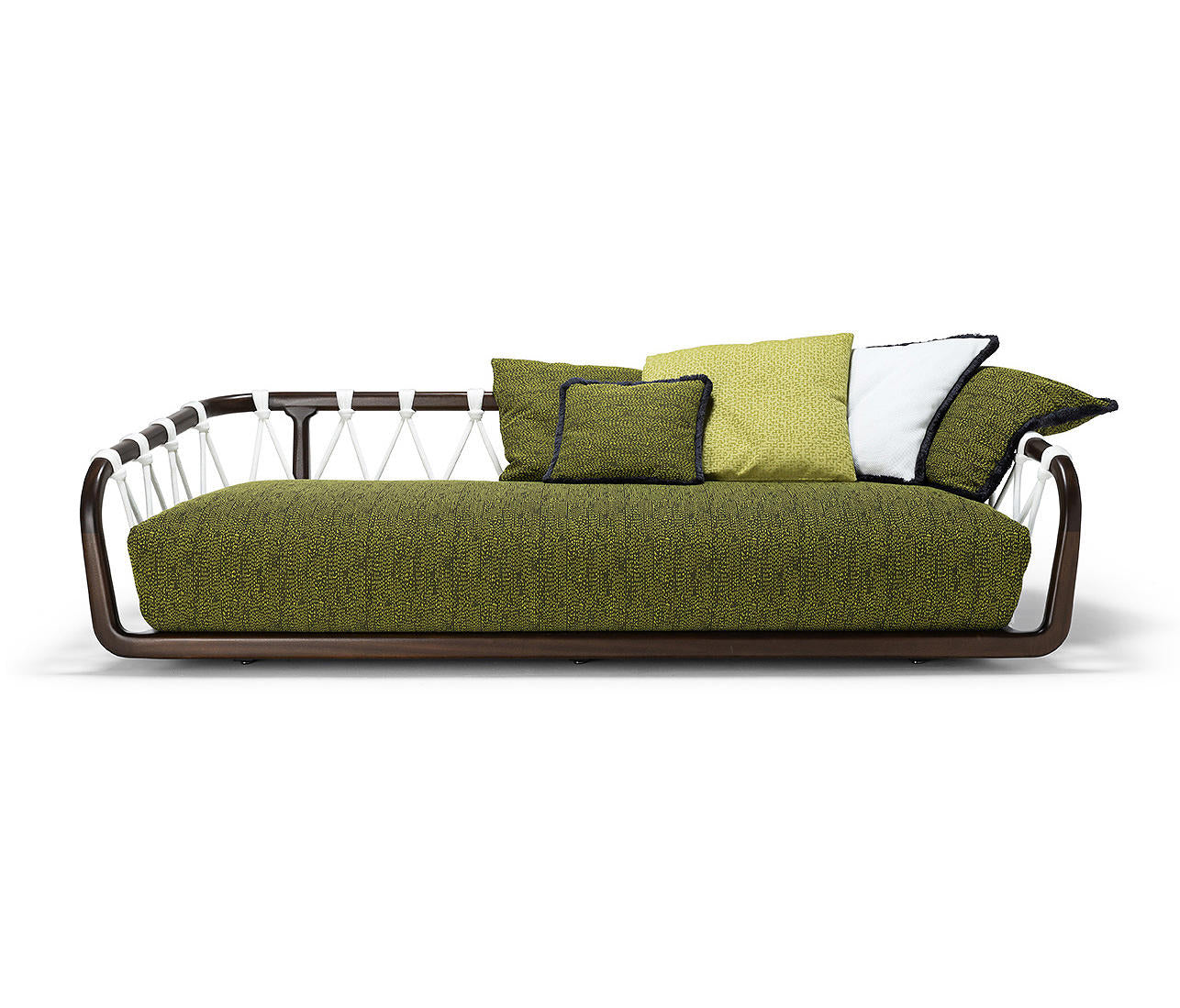 A vivid green shade reminiscent of moss is the one selected for the soft fabric upholstery of this plush sofa. Part of the Sunset Basket Collection coherently with its openwork diamond pattern of white ropes characterizing the back, it features a sleek and harmonious wooden shell and a richly padded seat with coordinated loose cushions. Please contact the Concierge for the pricing of the protective cover and available variants.