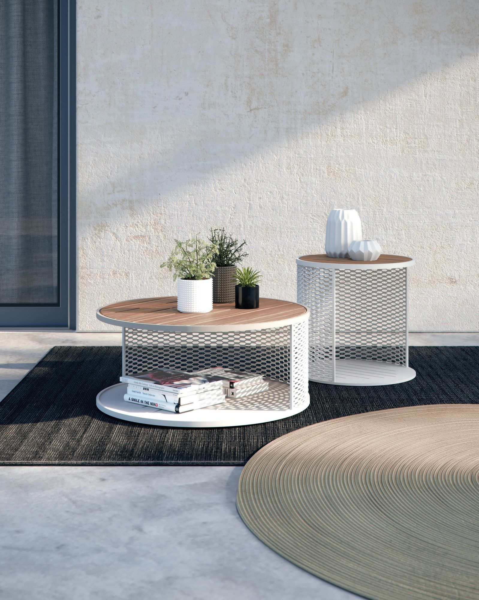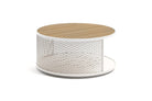 Switch is a round garden aluminium coffee-table with teak top.
