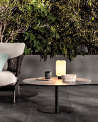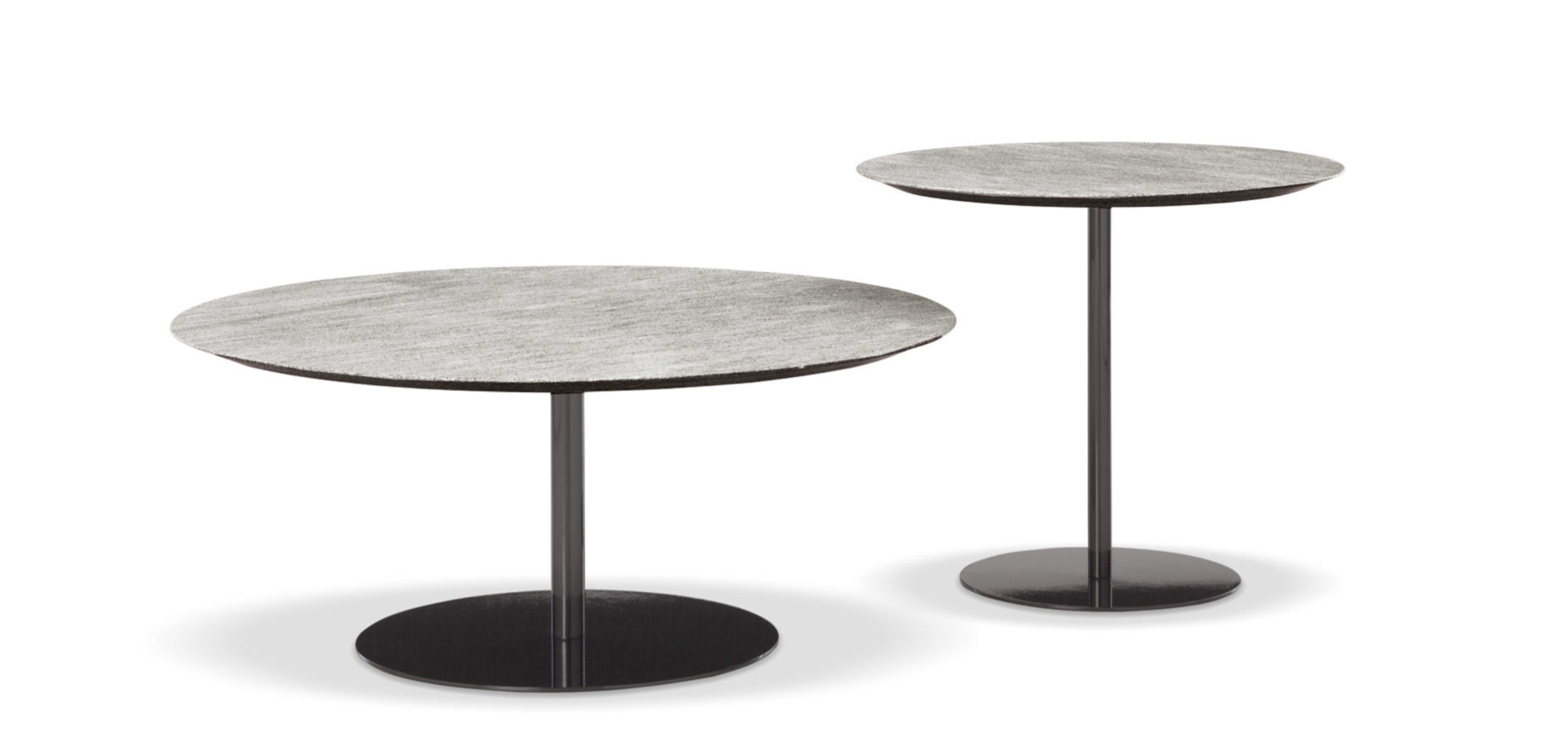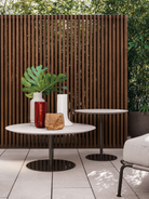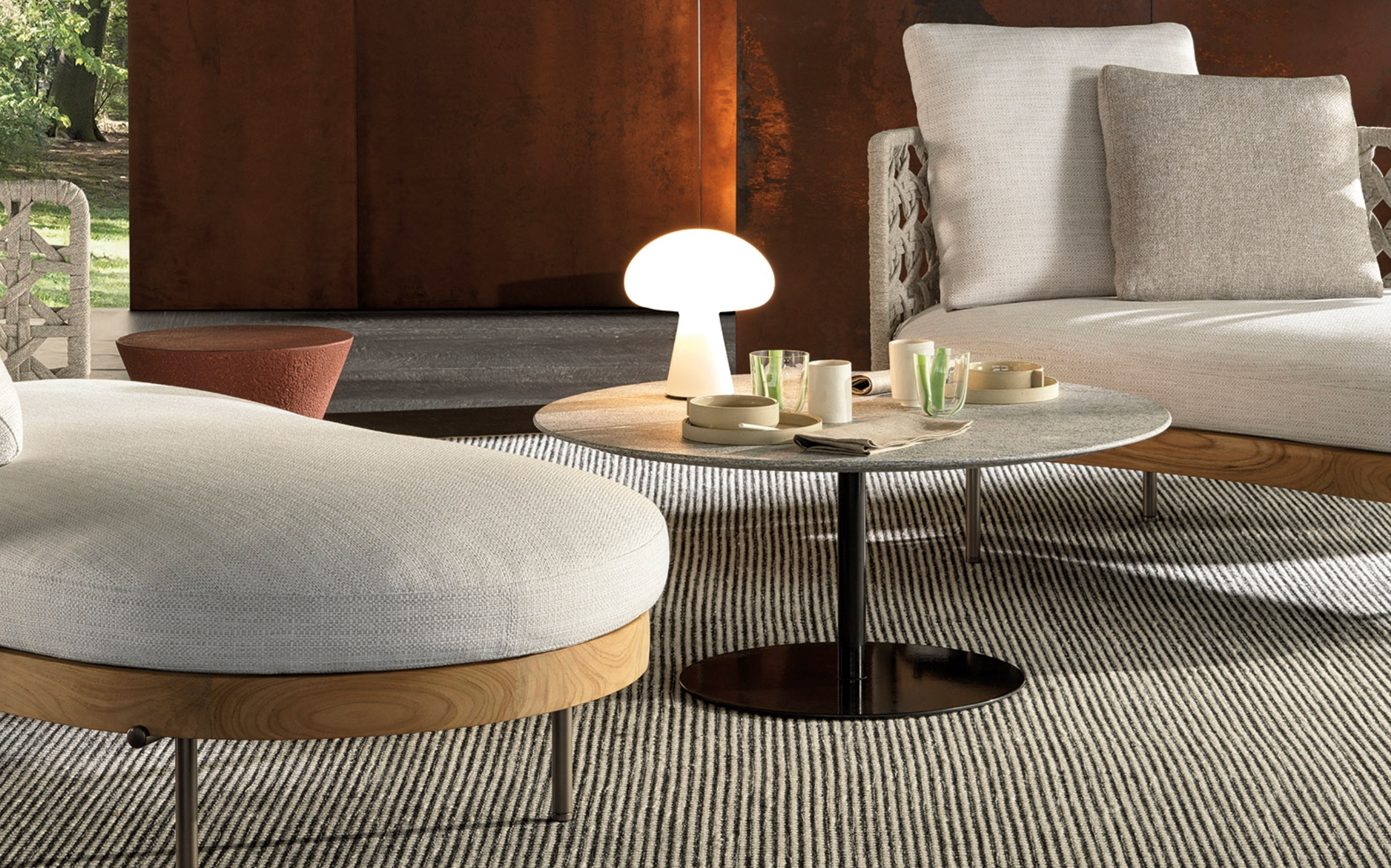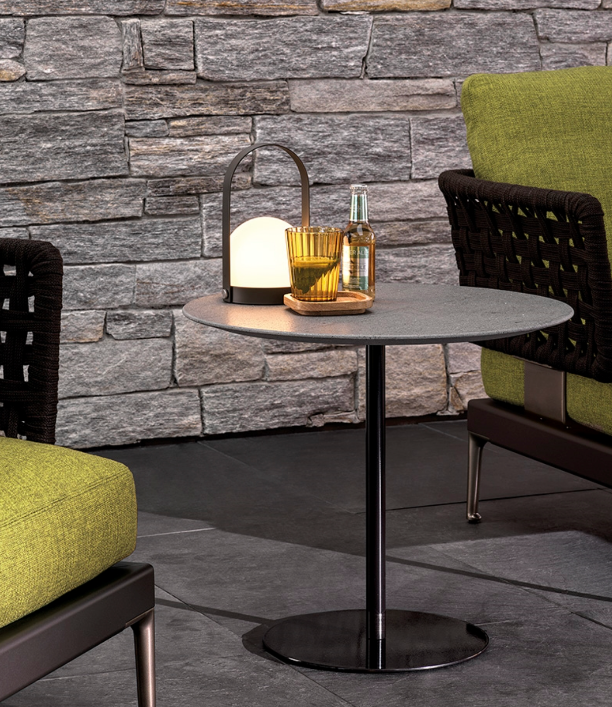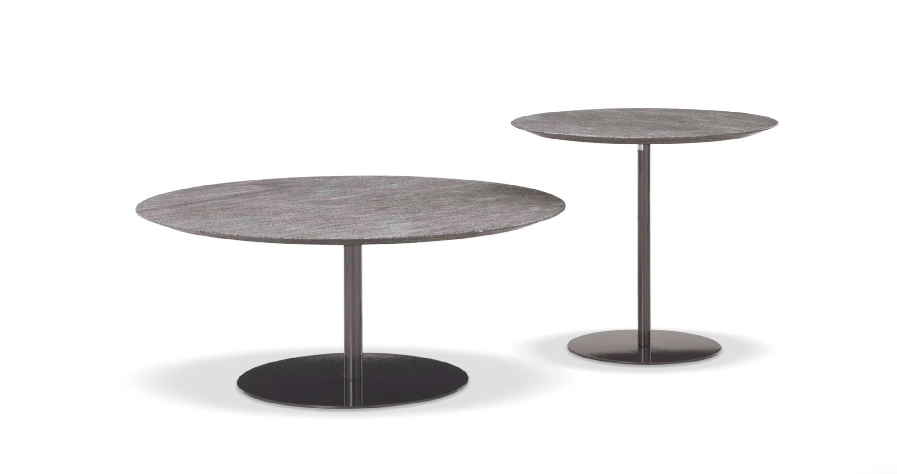 The contoured and fine-grain polished Basaltine stone version undergoes a unique stain-resistant treatment and has a stainless steel base with a polished Bronze or Pewter, or matt Ecru or Dark Brown finish with epoxy paint varnishes that guarantee colour stability over time. The variant with a teak top in a natural finish has a structural stainless steel frame, featuring a Bronze-coloured shiny varnish, or a matt Ecru or Dark Brown finish to match that of the base.