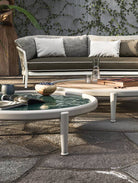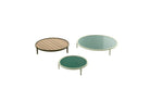 The Erica small tables, in three round sizes, combine powder-coated die-cast aluminum structures in five colors – anthracite, dove grey, olive bronze, aquamarine green, cream white – with slatted tops in natural teak or molten glass – a process that creates organic textures and irregularities on the surface for a distinct tactile effect - back-painted in jade green, emerald green and coral red.