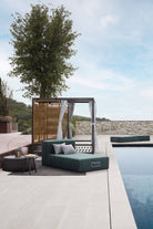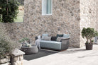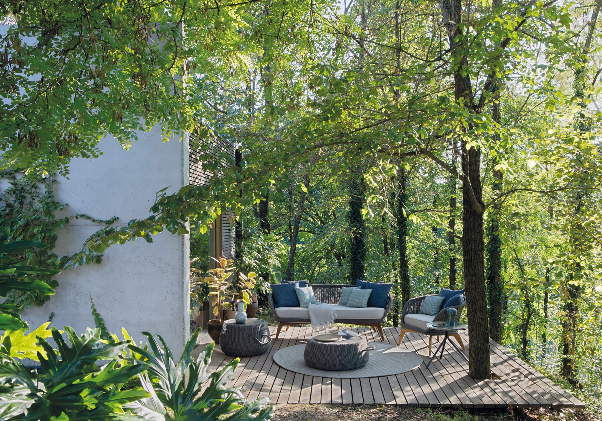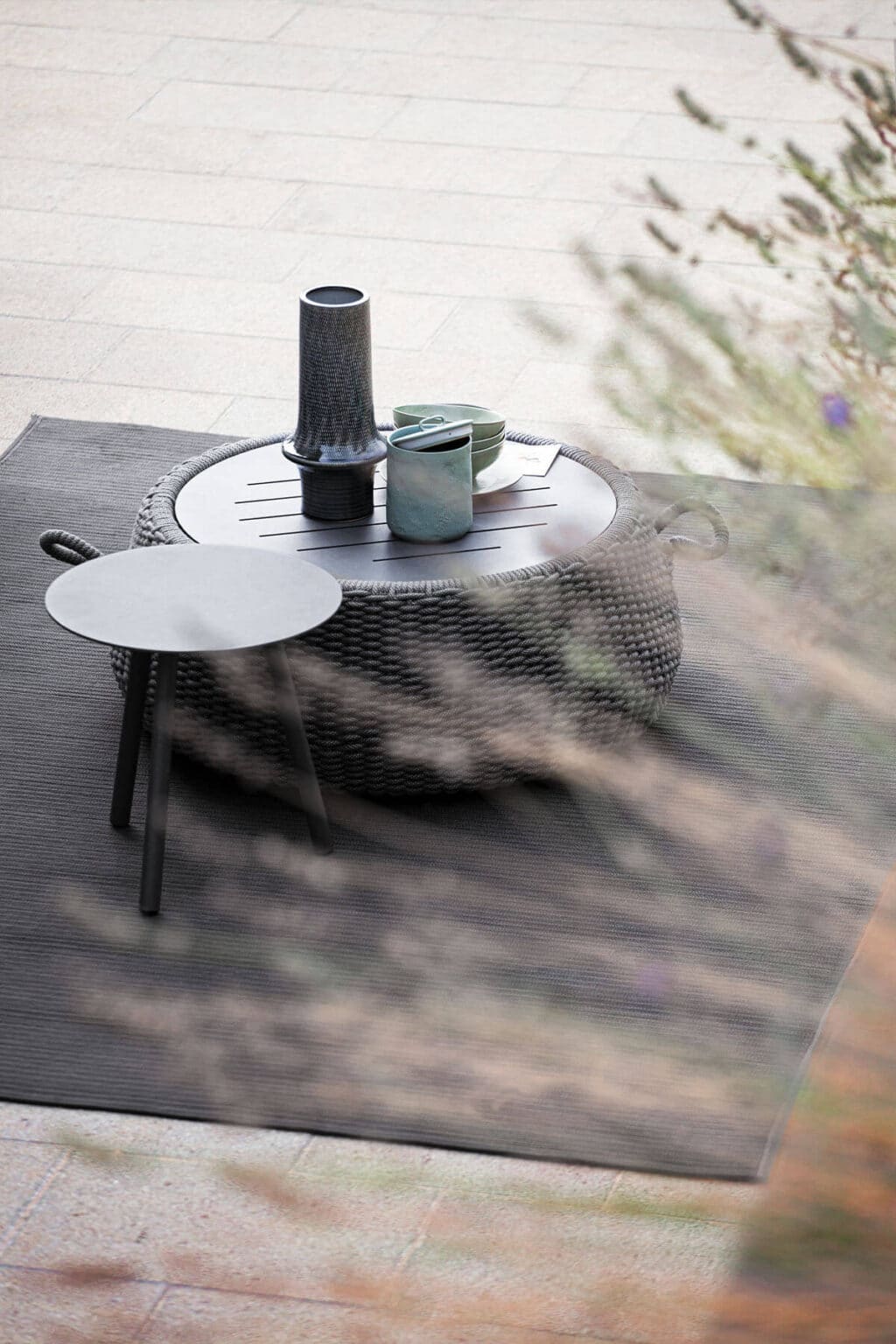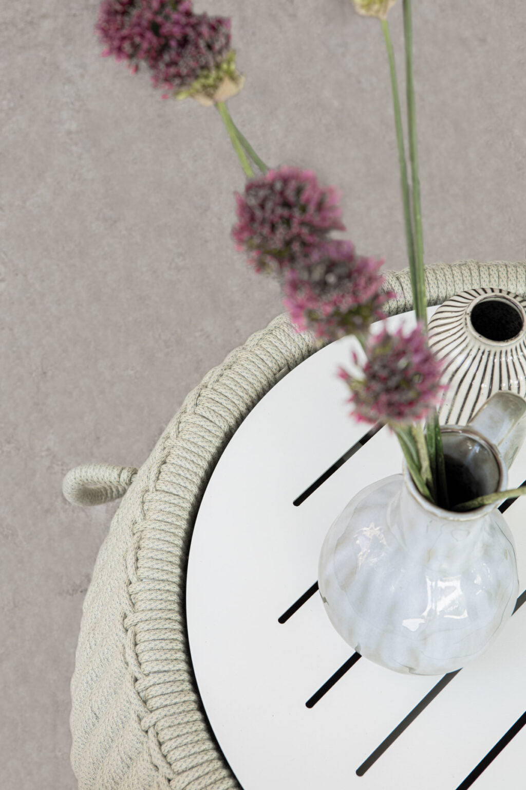Aluminium frame epoxy painted for outdoors, hand-woven fibre thermoplastic acrylic Teflon, waterproof and easy to clean.