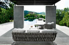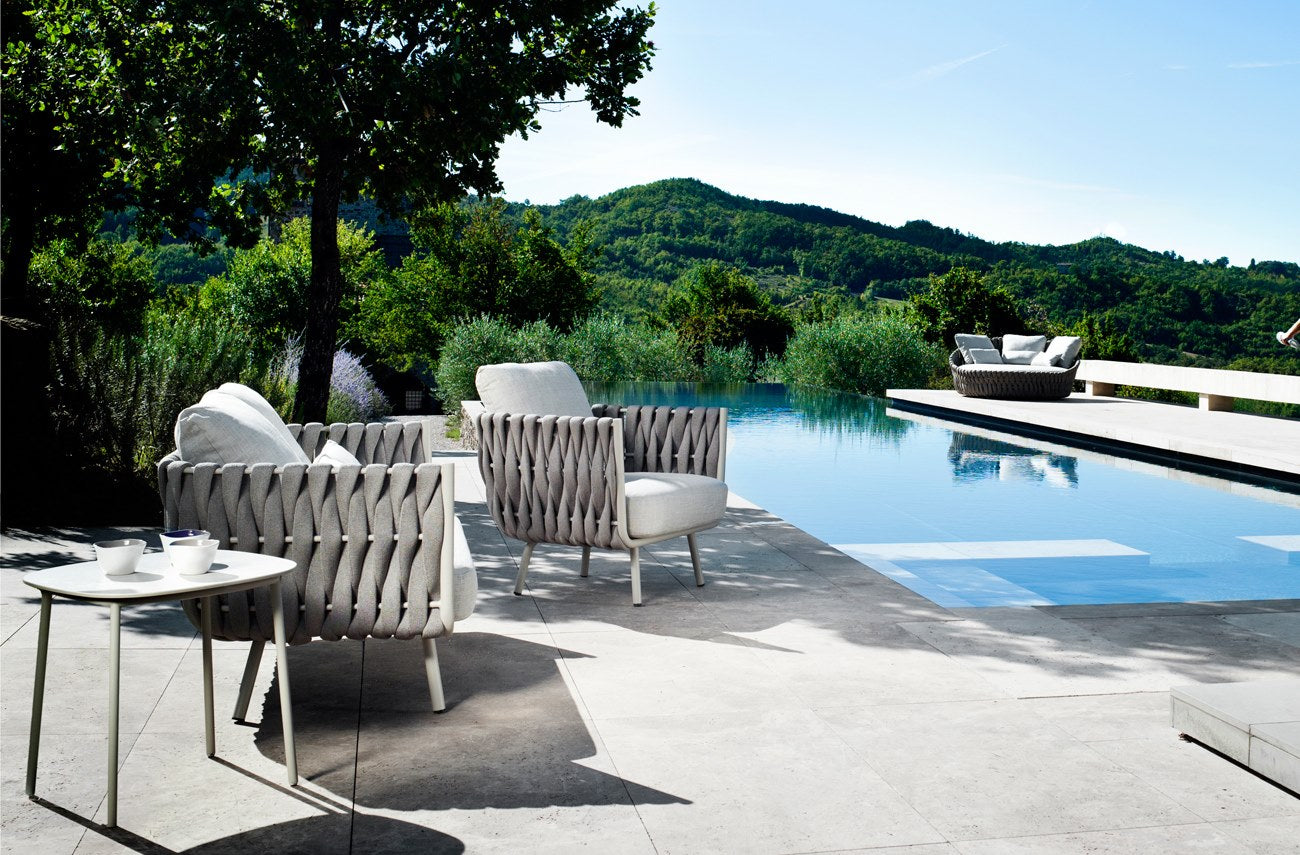 The Tosca outdoor collection is simultaneously warm and inviting, stylish and intriguing. It was the first time Tribù called upon a female designer to draw an outdoor furniture piece with a more feminine touch. Monica Armani succeeded in her challenge : rounded forms, tapered legs and an elegant seating shell in powdercoated stainless steel, upholstered with extra-wide braiding. The material for the braiding is genuinely innovative : foam mousse is encased in a seamless sheath of knitted textilene and polyolefine which makes the material weather-resistant, but also surprisingly soft to the touch. The seating comfort is especially pleasant, also thanks to the comfortable outdoor cushions.