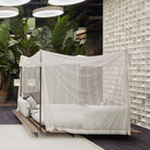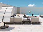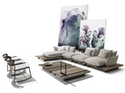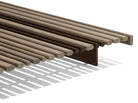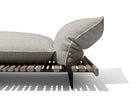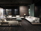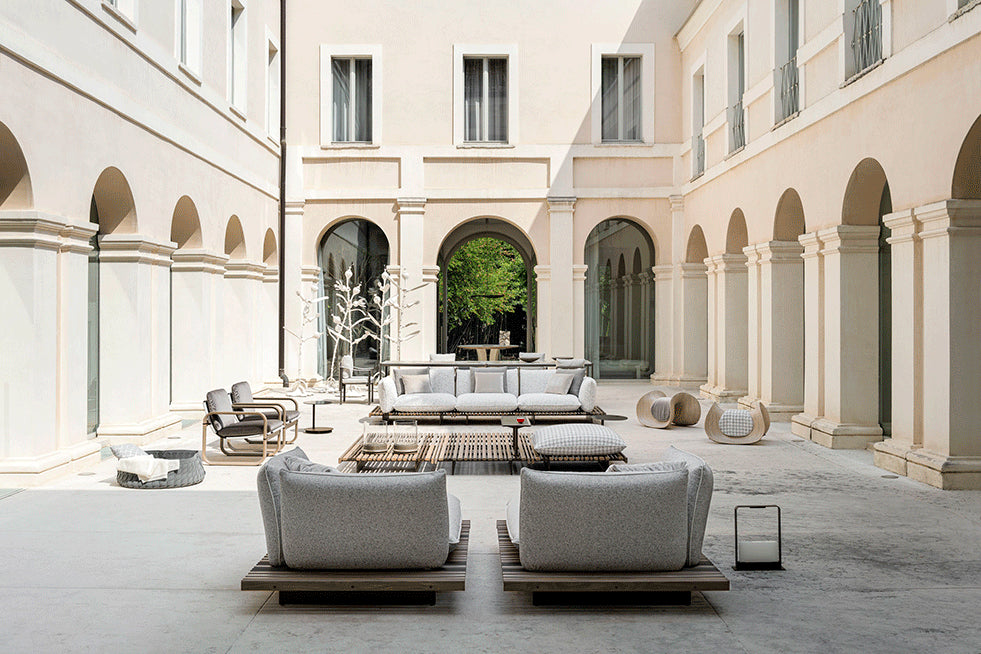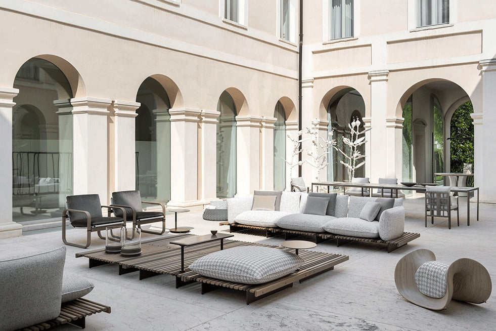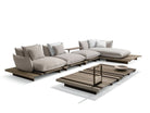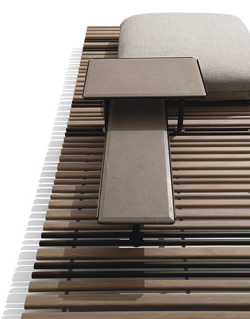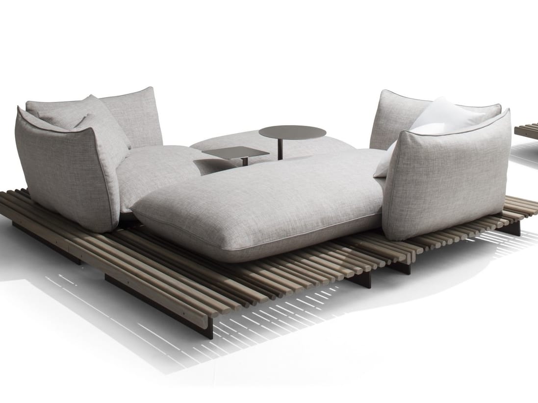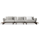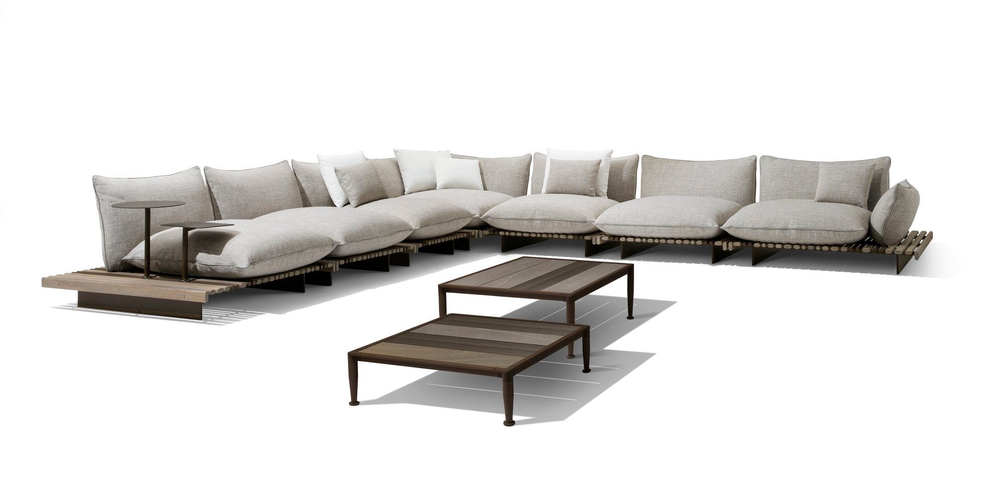Modular seating system with the base in protected aluminum, powder painted in carob colour, made up of oak and walnut wooden slats, alternated with others in aluminum. The upholstery is completely removable, with the piping in waterproof outdoor technical fabric.