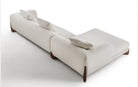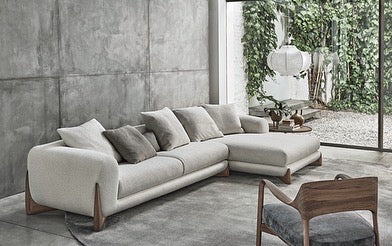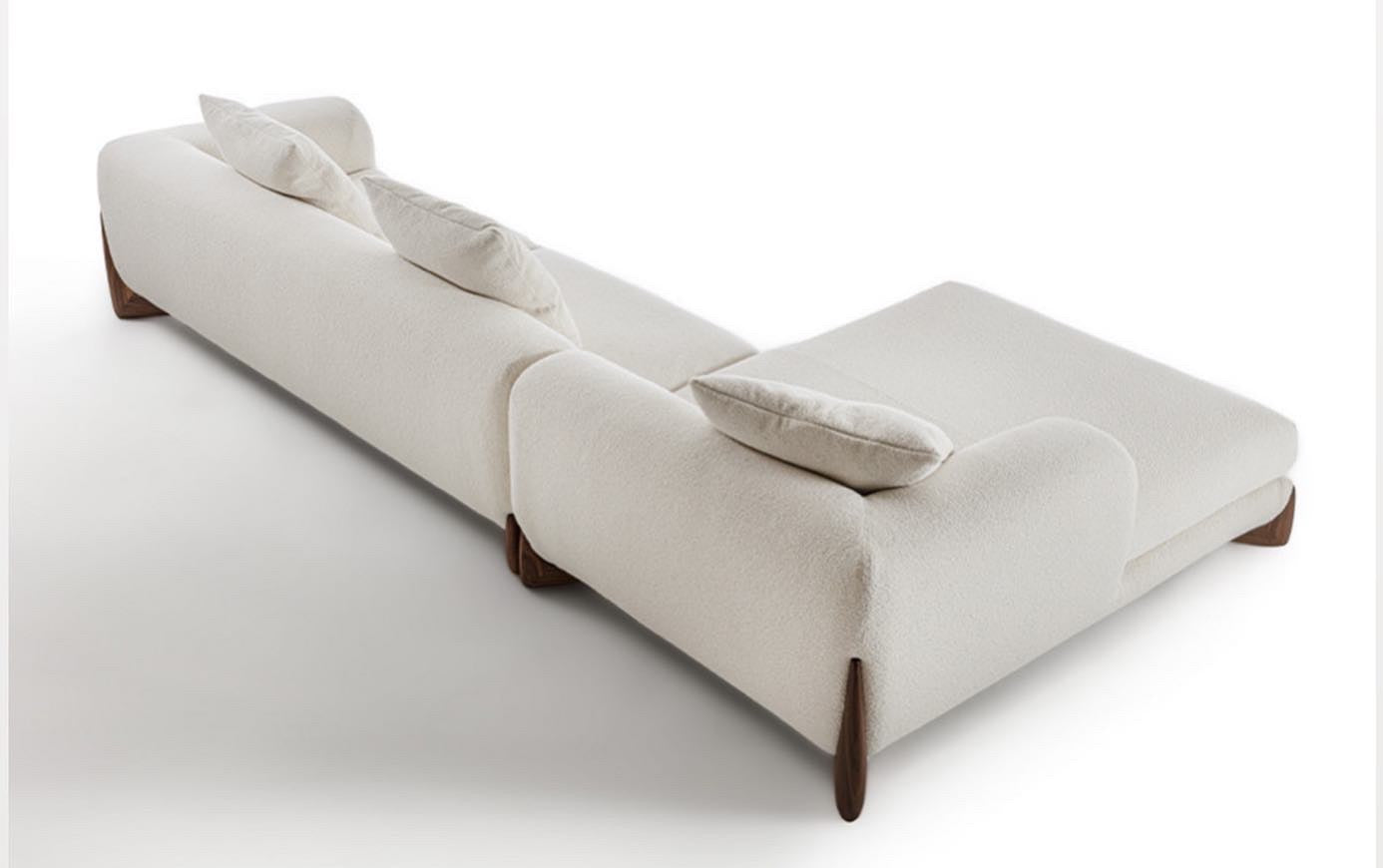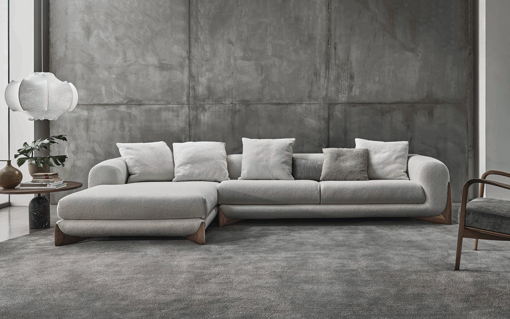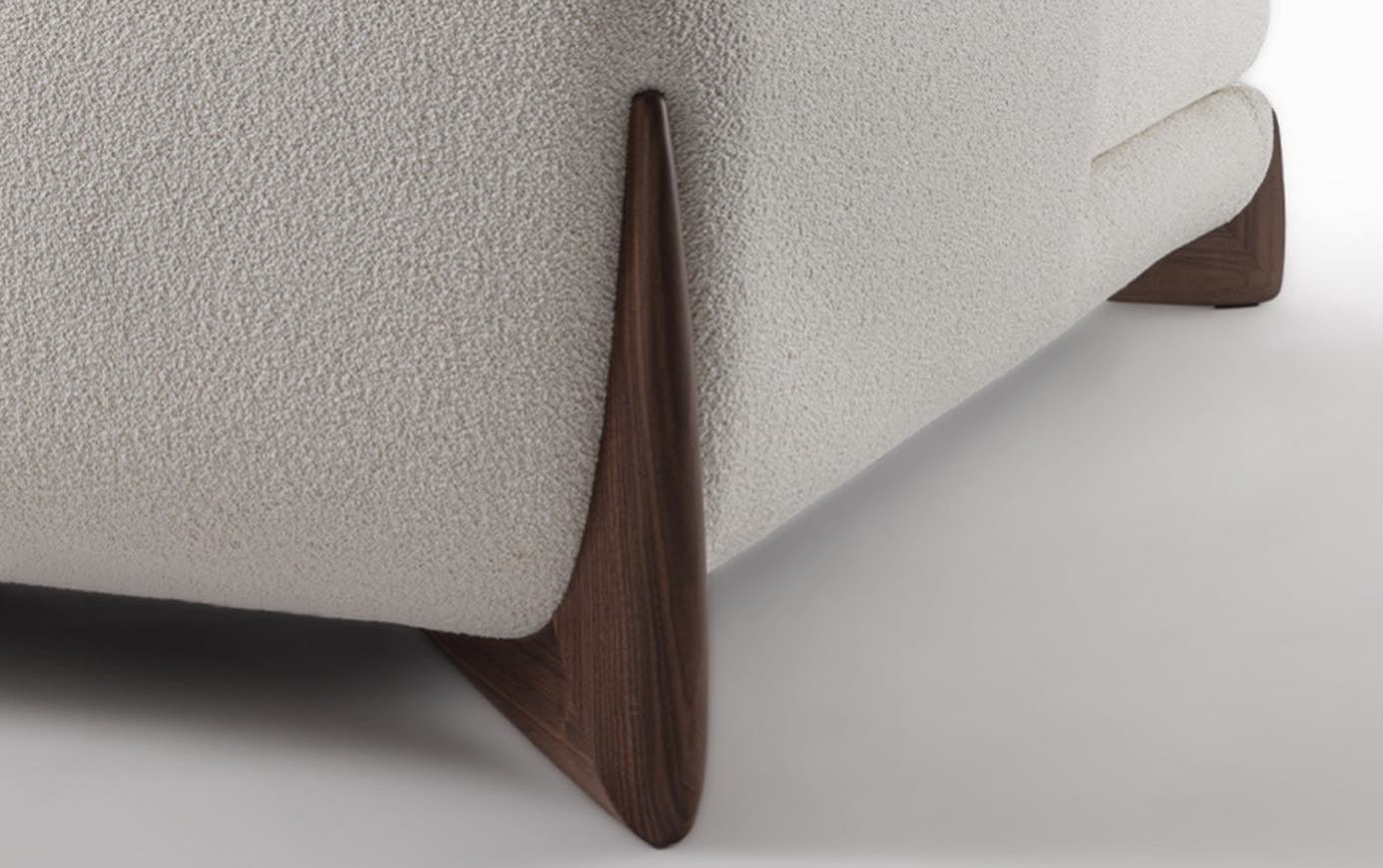 The Softbay Sofa is defined by boldly stylised curves are supported by shaped feet in solid canaletto walnut wood that extend partway up and into the corners of the low rounded back and armrests. Select from a choice of fixed or modular sizes.