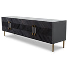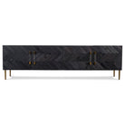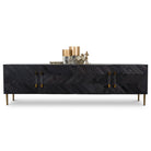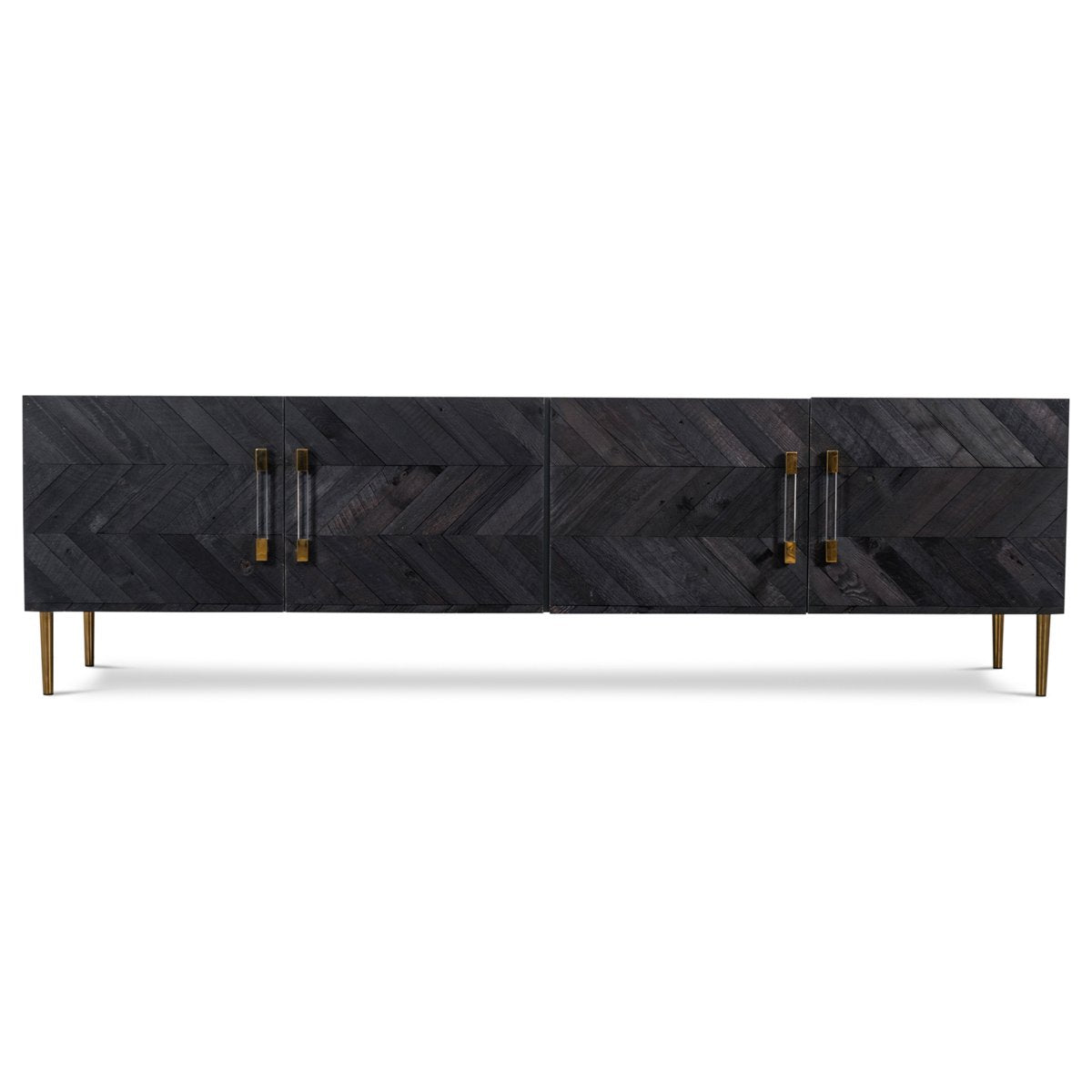 This Credenza is a sleek addition to any room. Featuring lucite and brass pulls, tapered brass legs, four doors, and black wood in a herringbone pattern, the Credenza is the perfect way to store your favorite items and elevate any space.