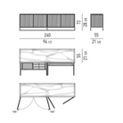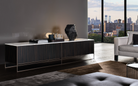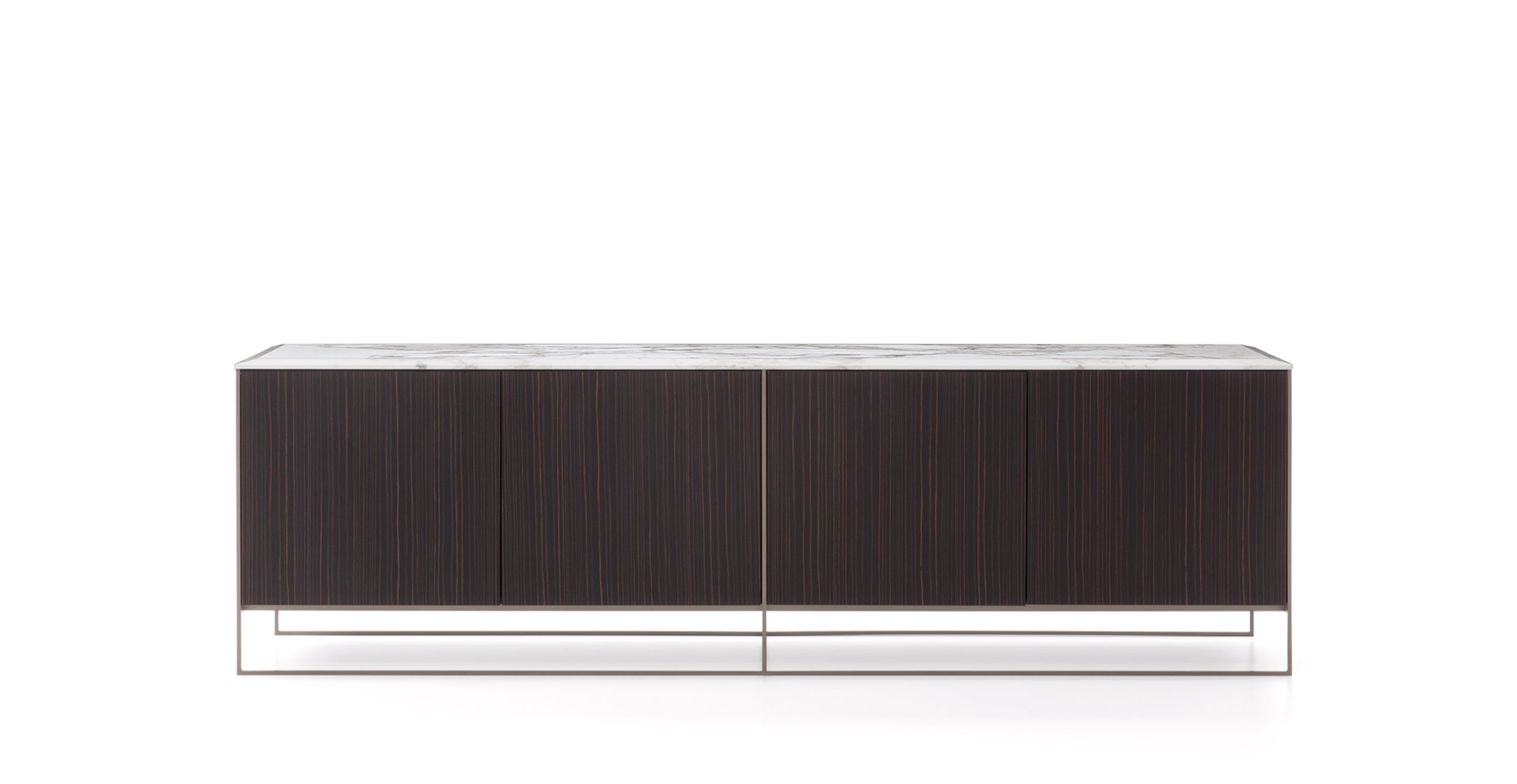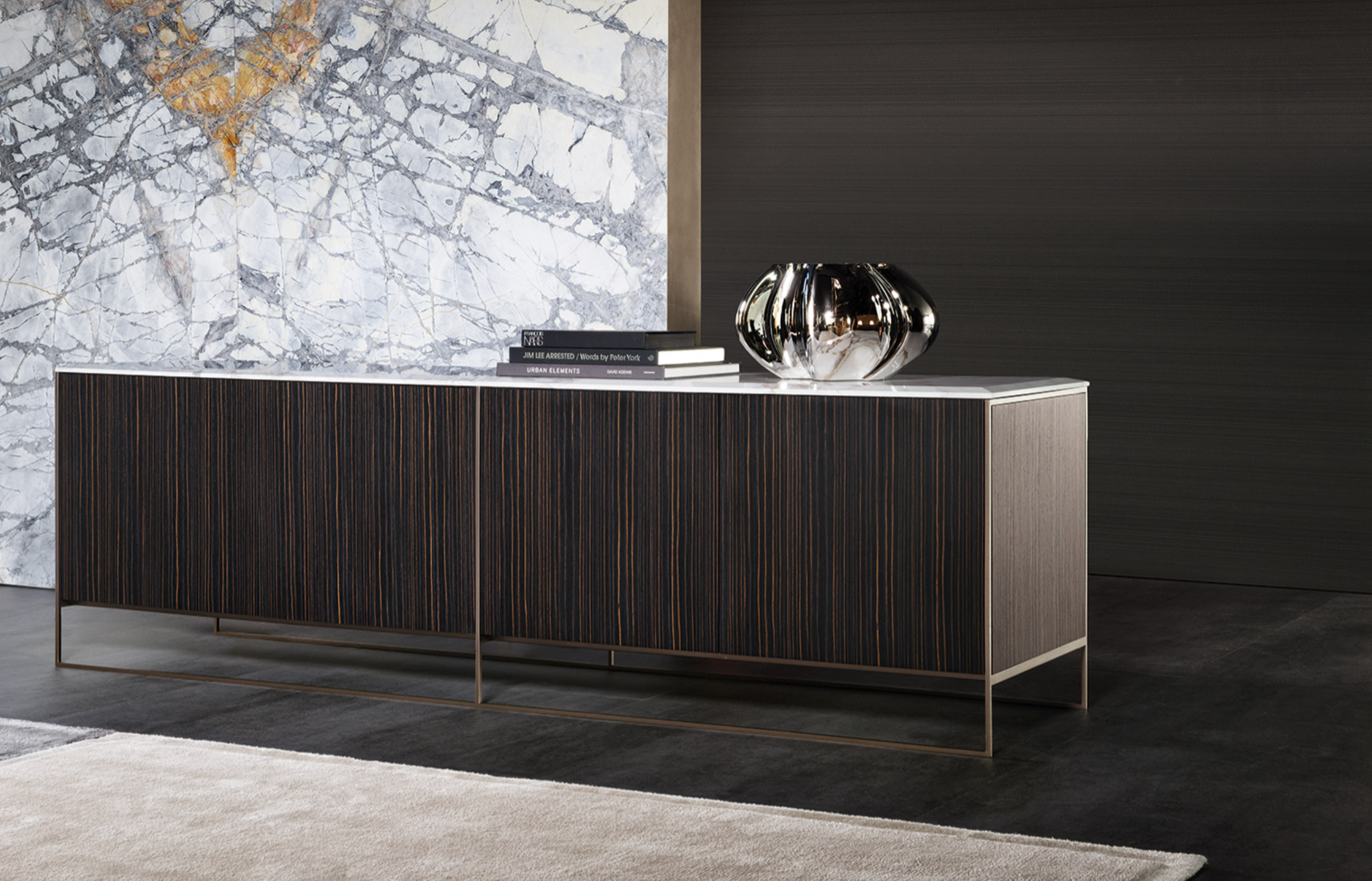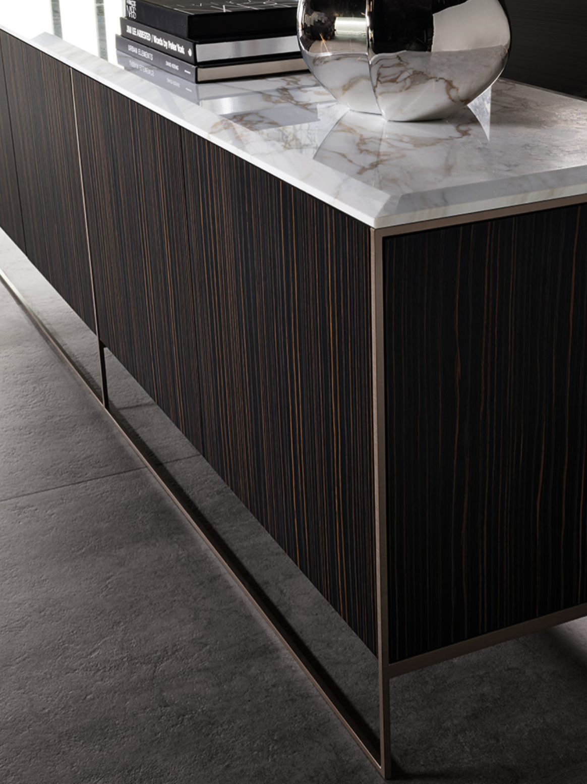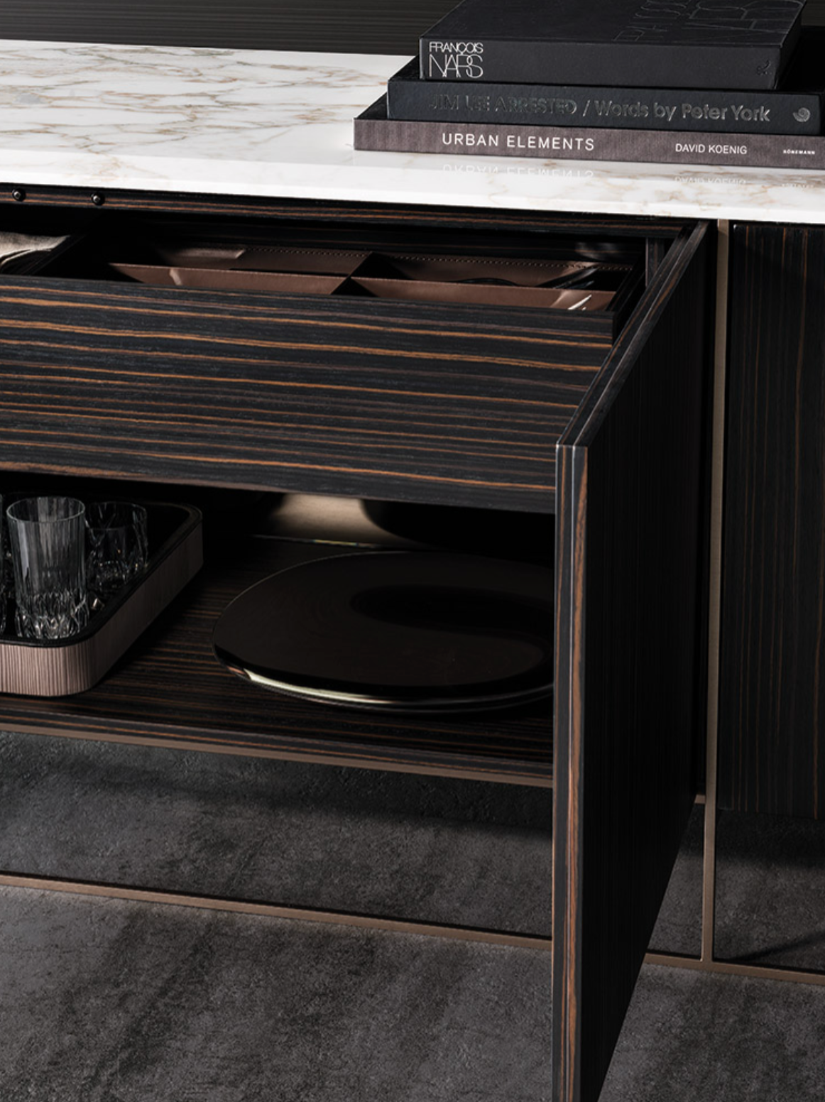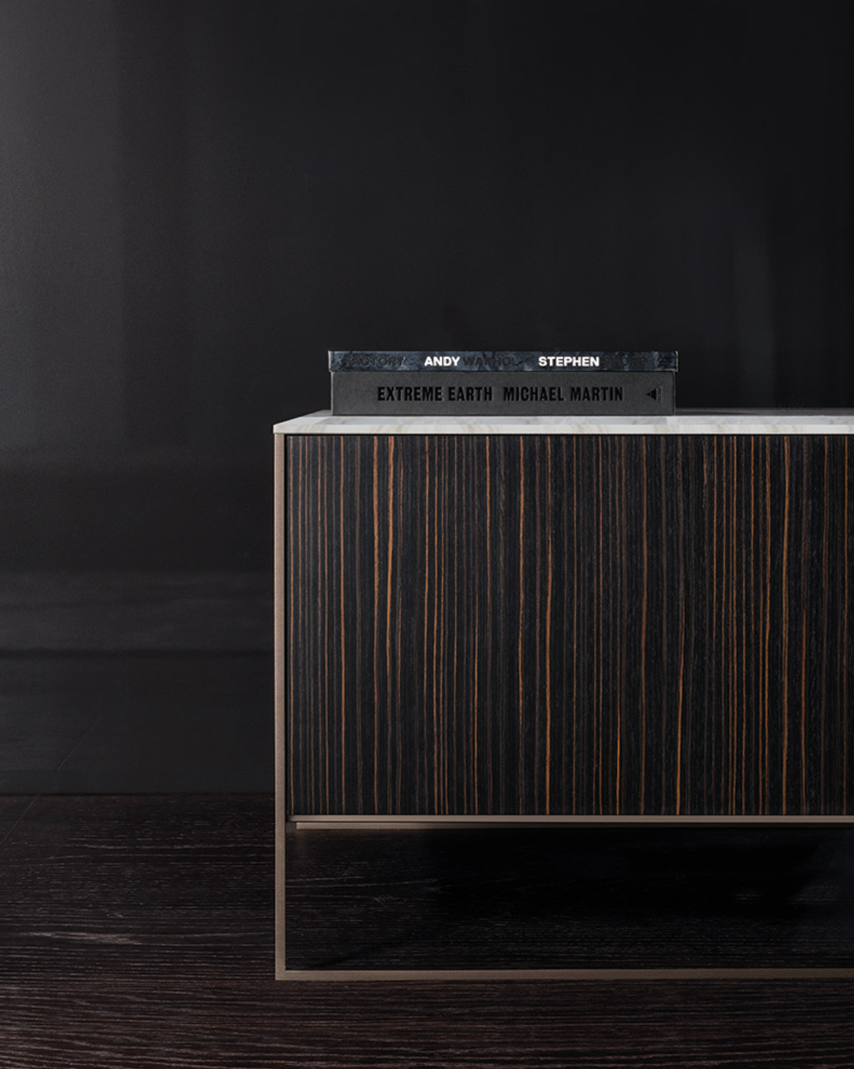 The choice of elegant, luxurious materials contrasts the studied simplicity of the design. The structure is in satin-finish metal with Bronze finish. The sides and doors are available in ebony veneer with open-pore opaque lacquer finish or Mink stained sucupira veneer, while the beveled top is in Calacatta marble.