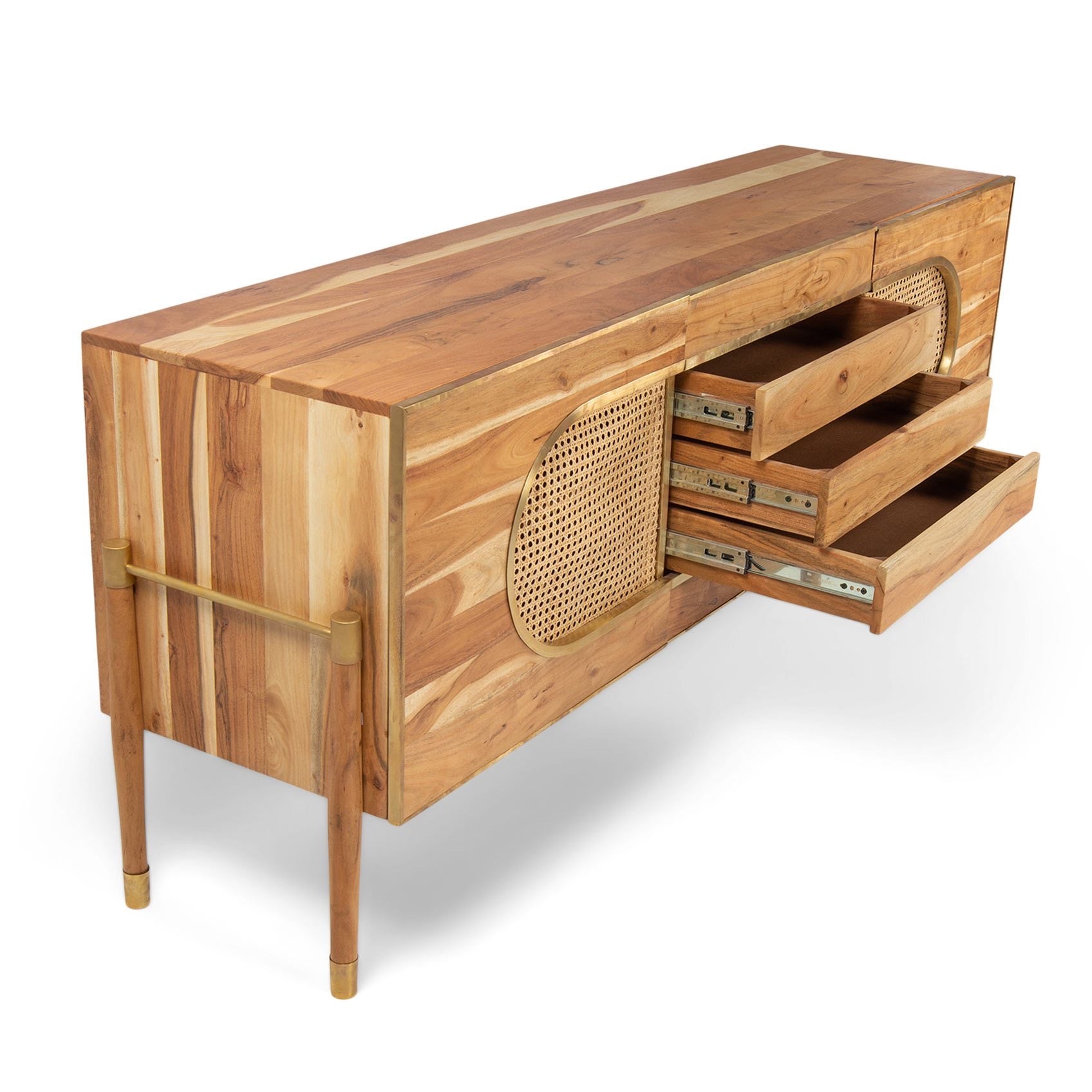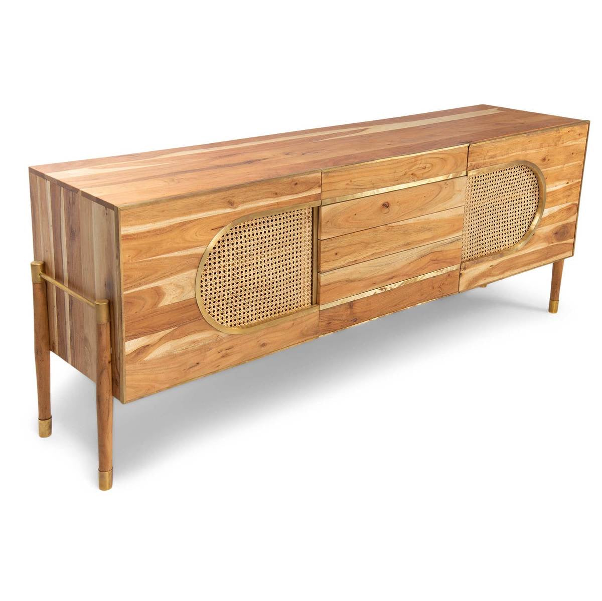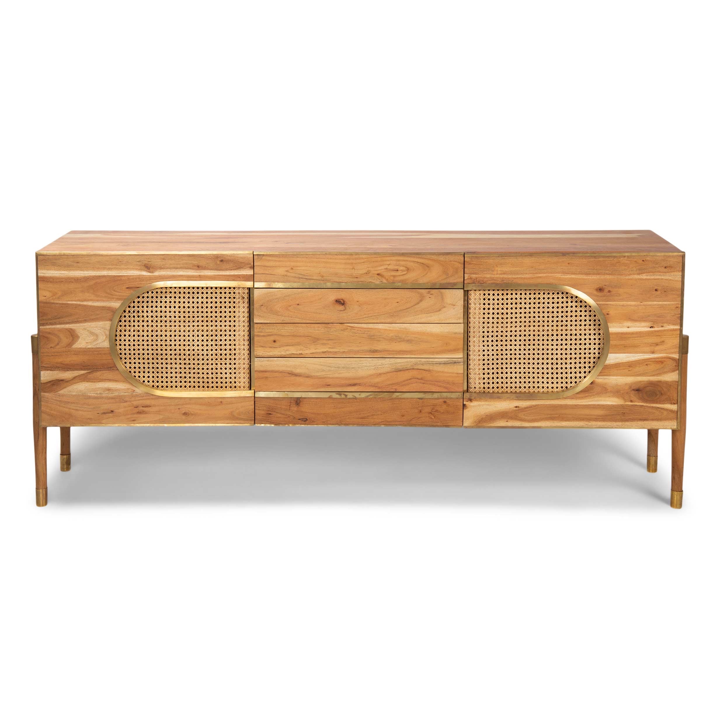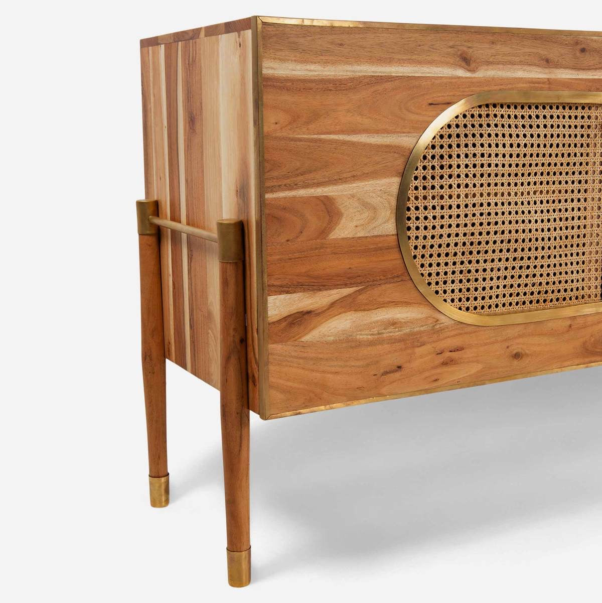 Introducing our Cane credenza featuring oiled natural acacia. The 2 doors are accentuated by natural rattan trimmed with brushed brass. This piece comes with exposed legs with brushed brass caps.