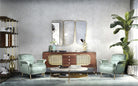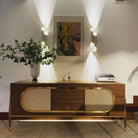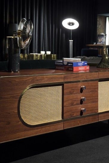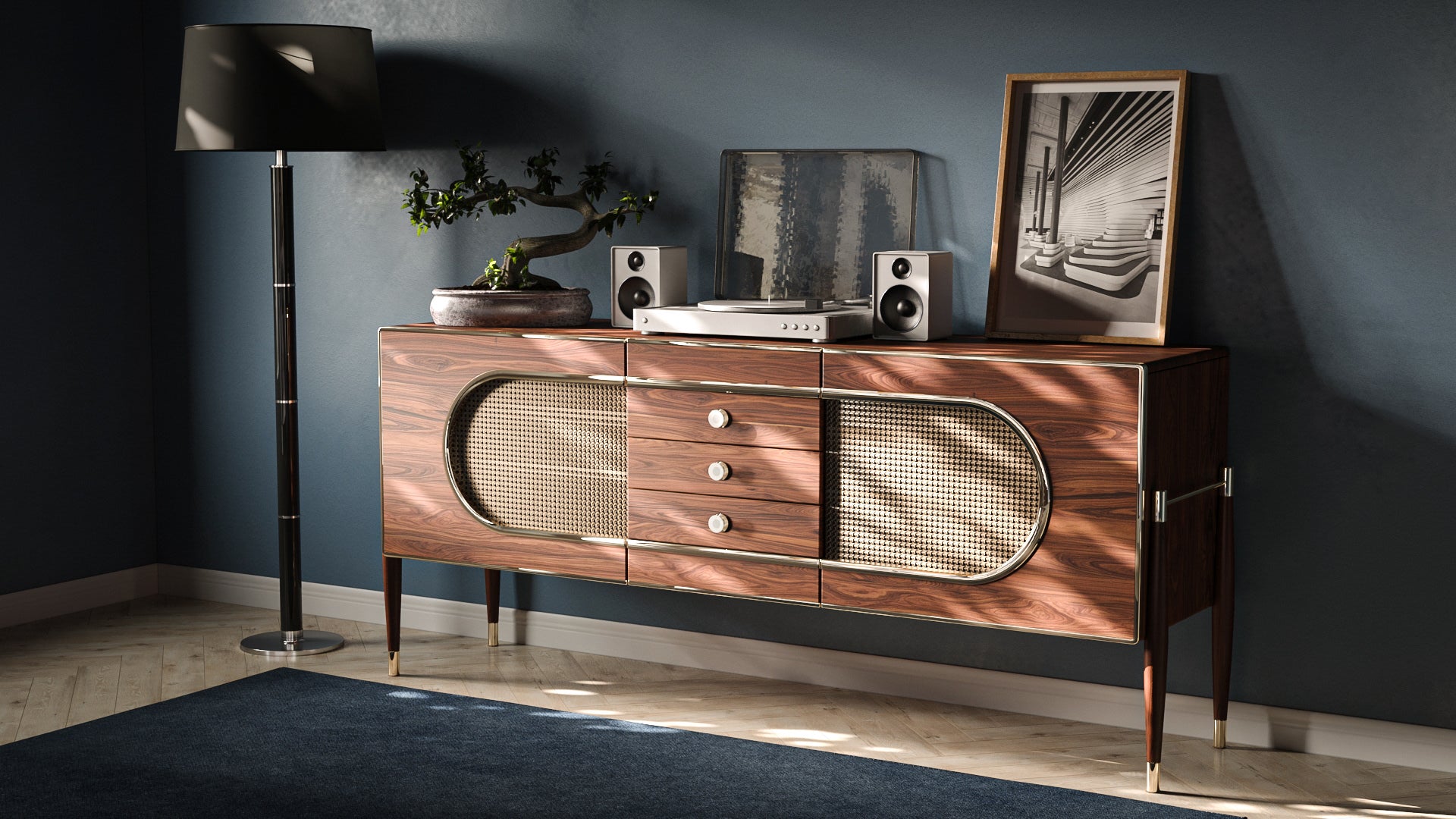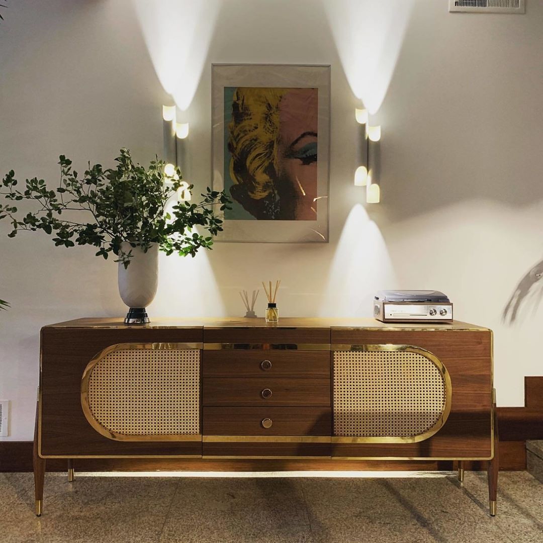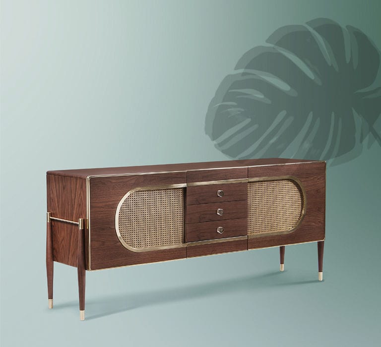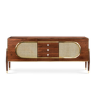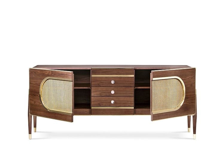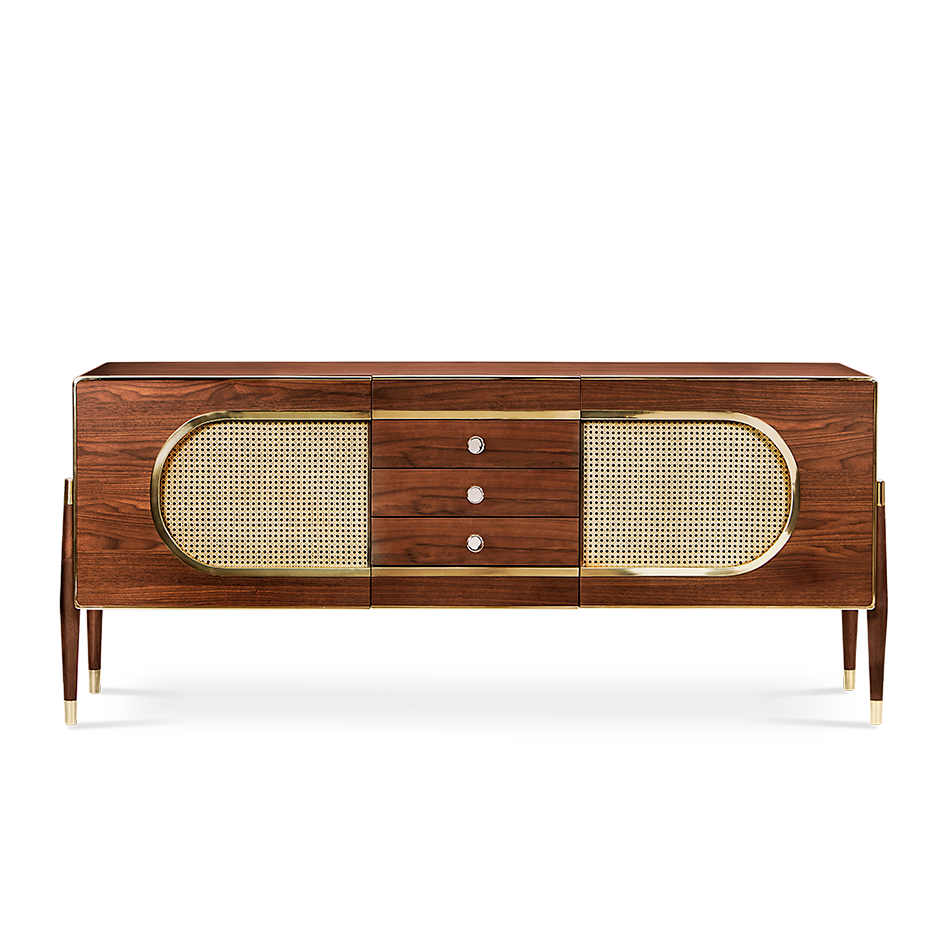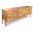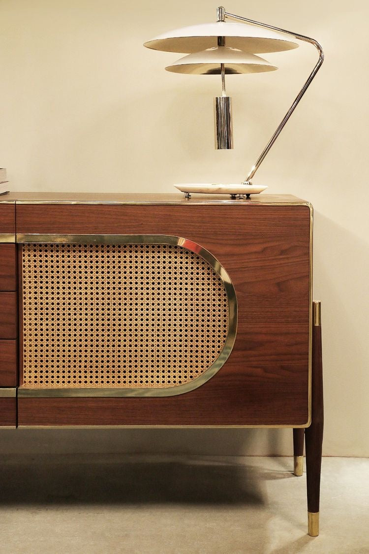 Introducing our Cane credenza featuring oiled natural acacia. The 2 doors are accentuated by natural rattan trimmed with brushed brass. This piece comes with exposed legs with brushed brass caps.