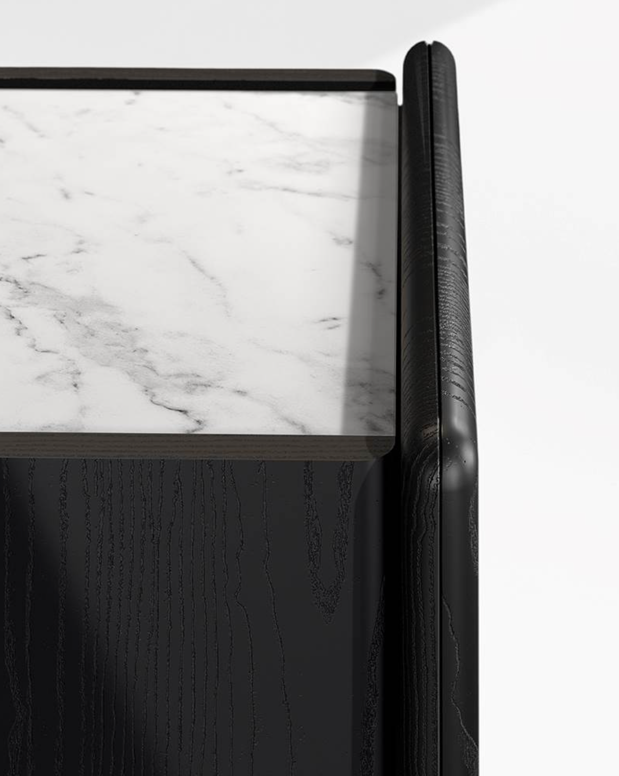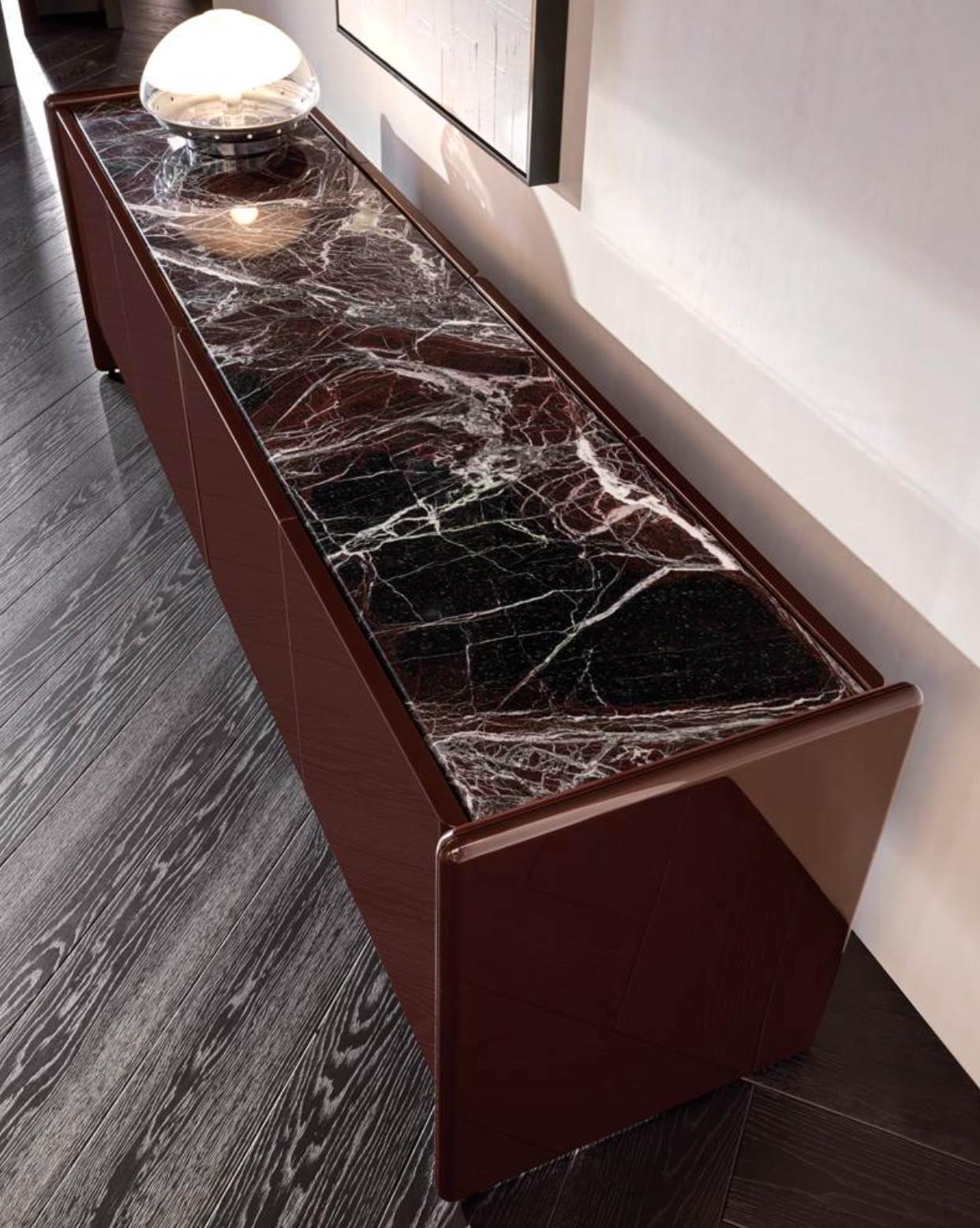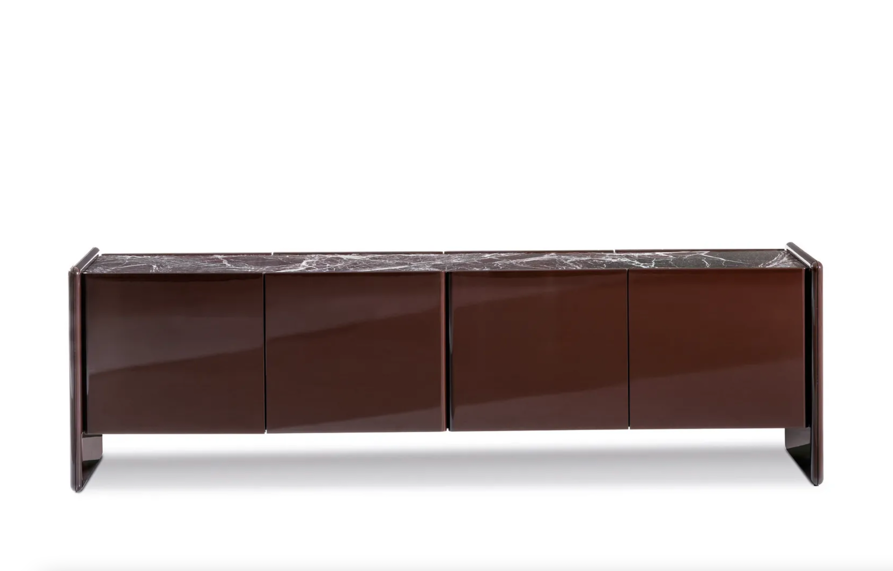 A storage unit system that embodies the essence of effortless elegance through its essential geometric lines: the design of Logan exudes a sense of refinement, blending sculptural beauty and understated grace. Made from a combination of different materials - lacquered wood, wood and marble - its stylistic feature lies in the particular join between its shaped sides and recessed top.