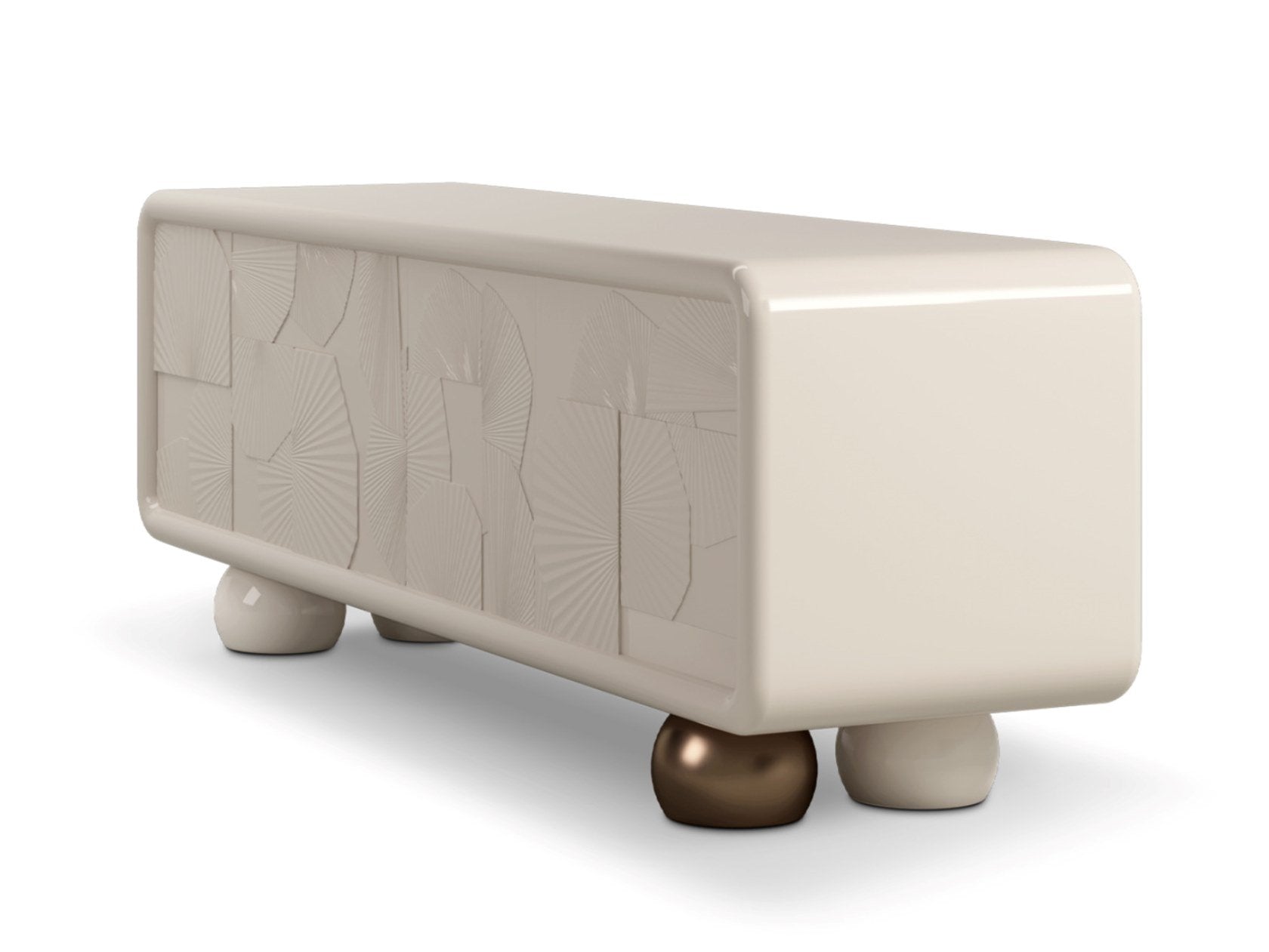 Exquisite handcrafted by Portuguese artisans in walnut wood, the sideboard presents hand-carved abstract elements, which provide uniqueness in every piece made. In addition, the monochromatic future classic sideboard features four aged brushed brass spheres feet.