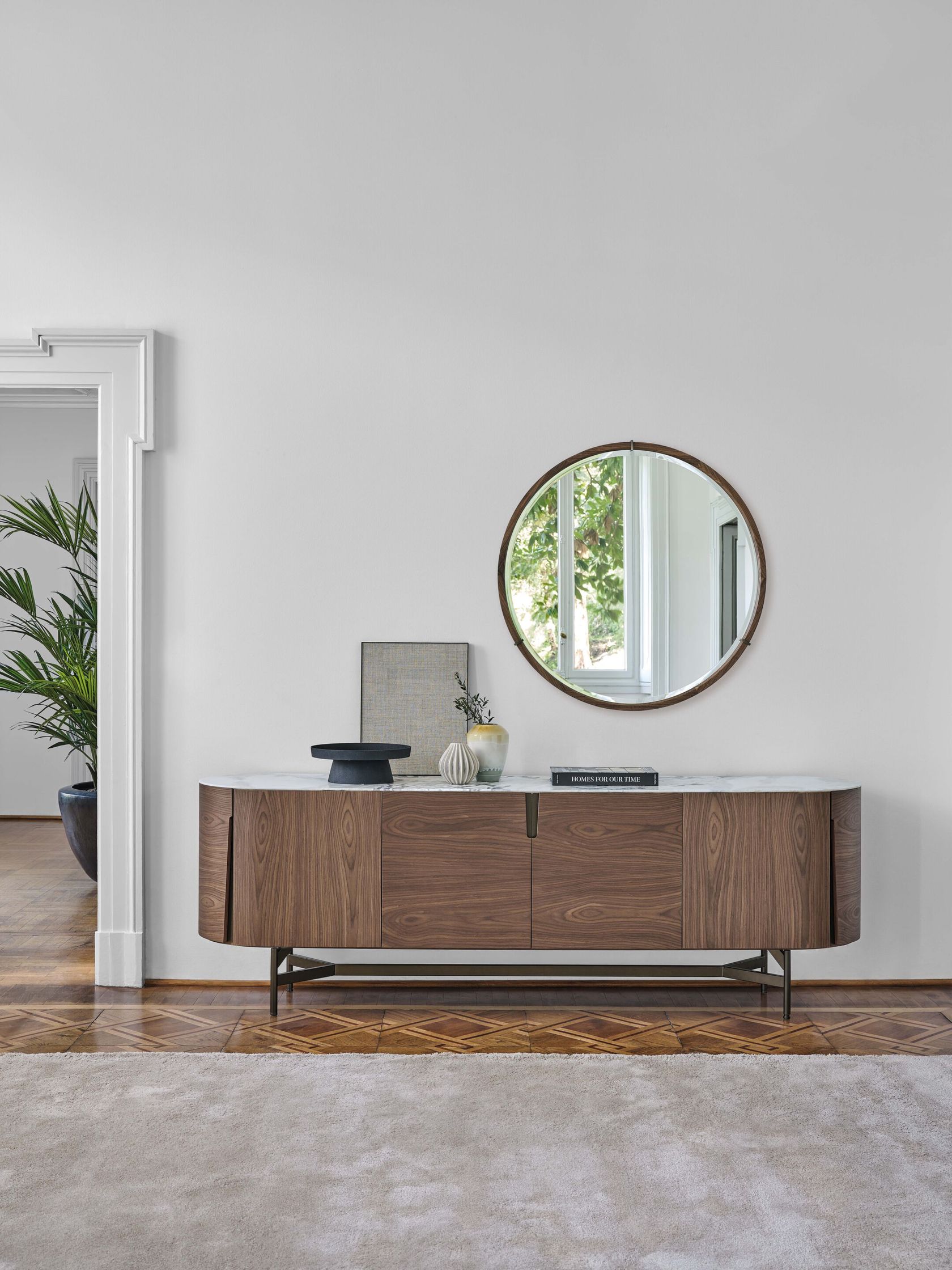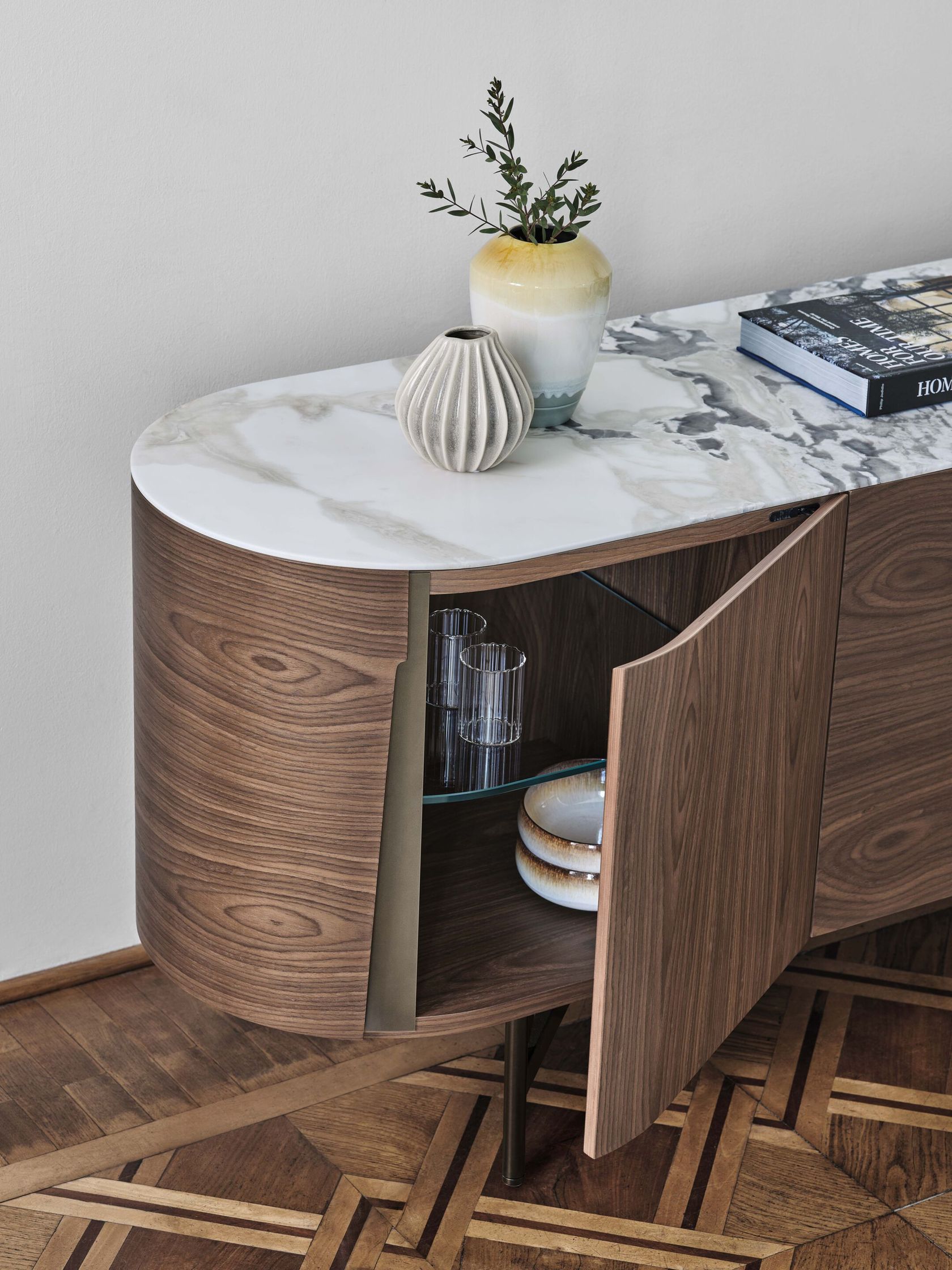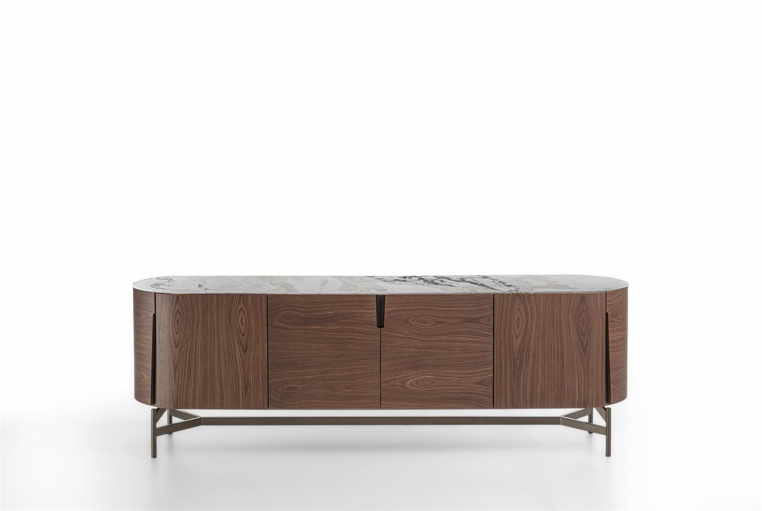 Sideboard with three compartments and four hinged doors with ash or canaletta walnut frame. Recessed handles with metal back in Bronzoro finish. Metal base in Bronzoro finish and top in wood or marble. Internal shelves in clear glass.