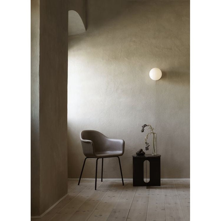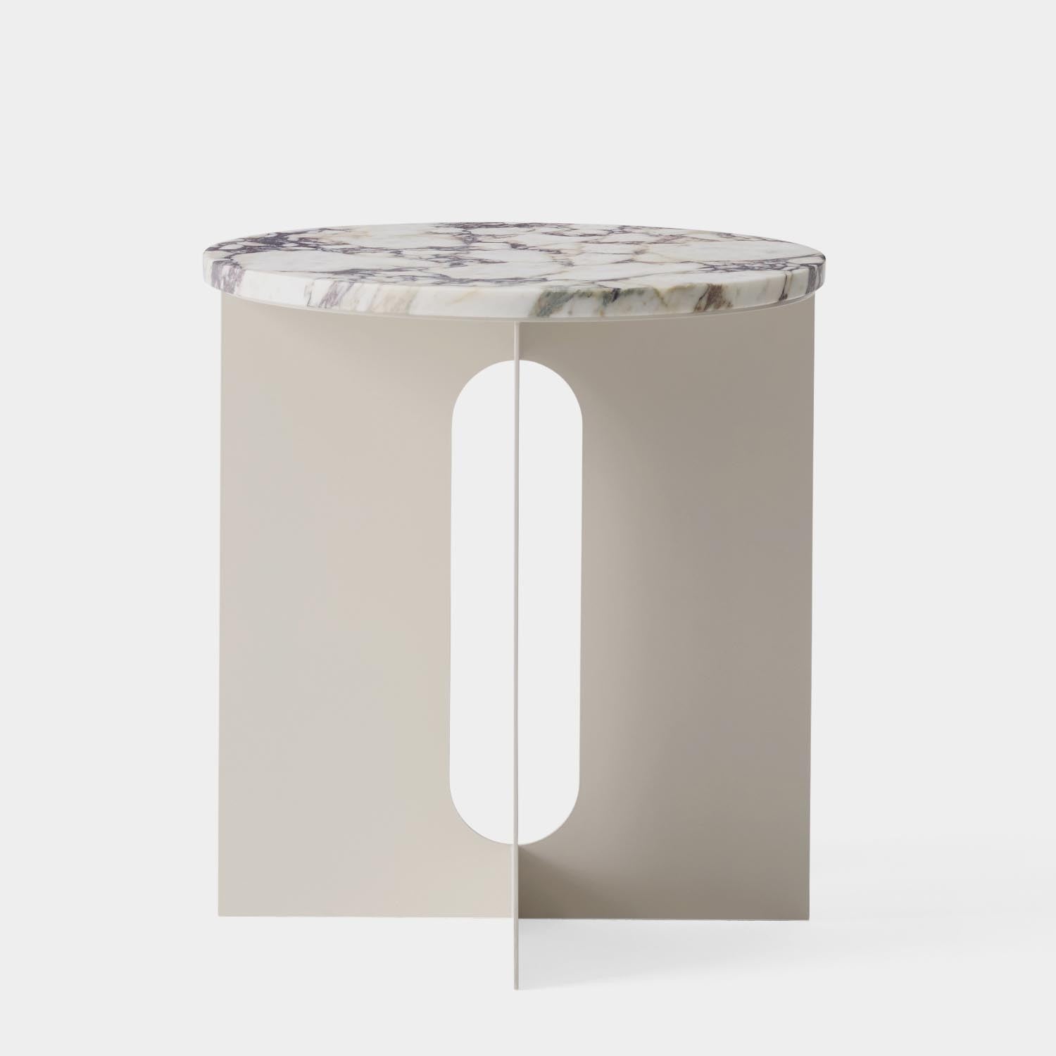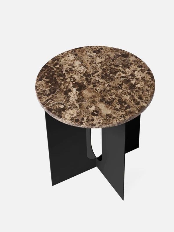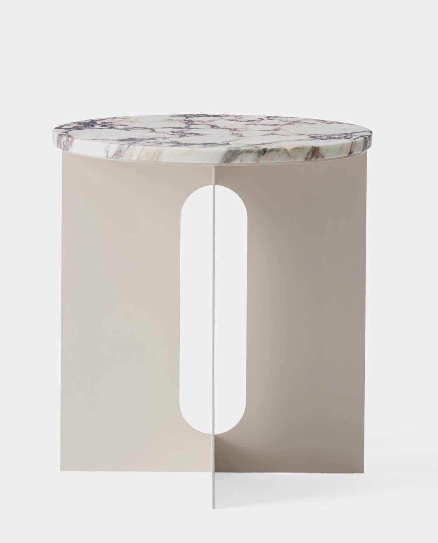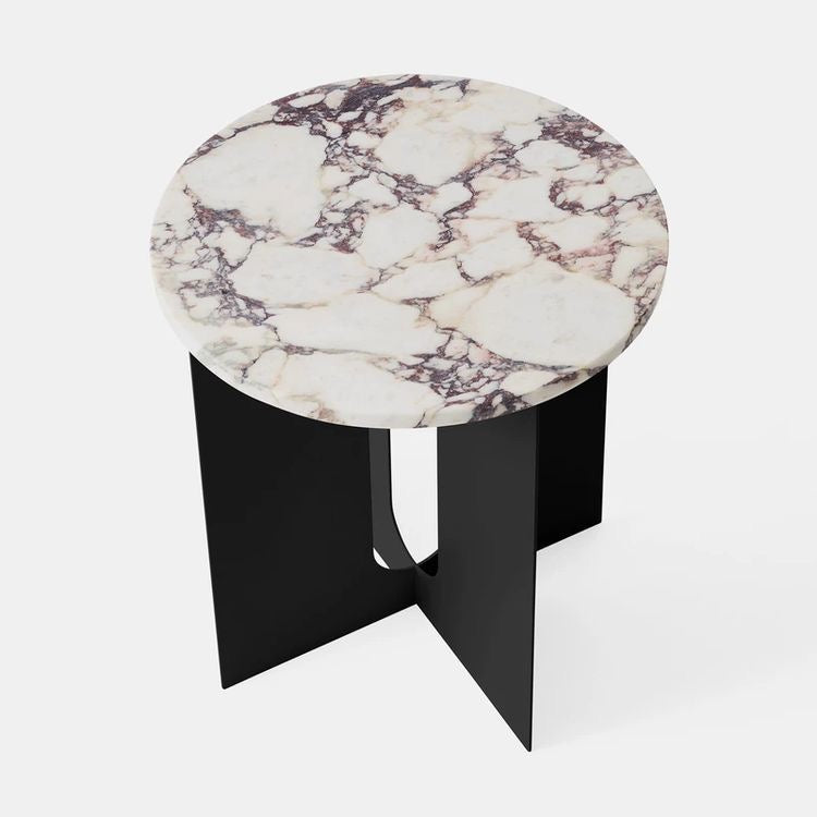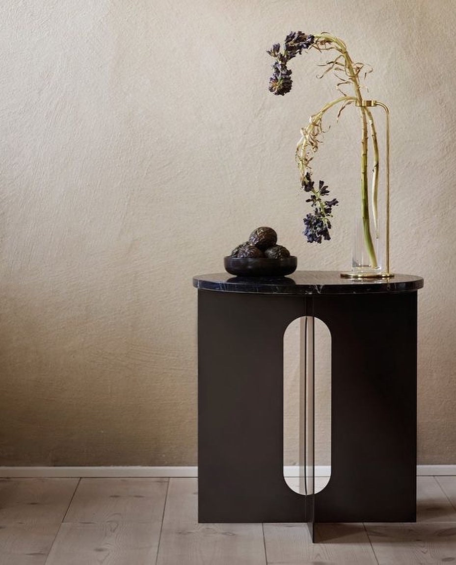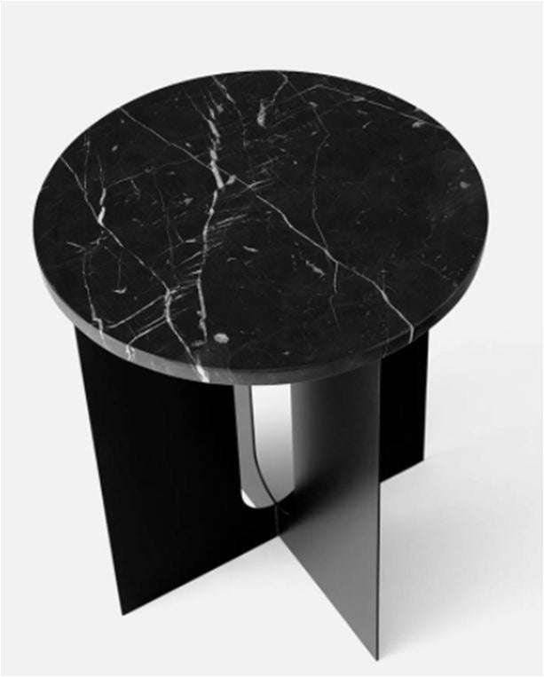 The perfectly proportioned table comprises a sturdy powder coated steel base on which a rounded marble tabletop is balanced. The table’s refined marble top, which barely hangs over the legs to create an overall sense of balance, and contrasting wide, flat legs – laser-cut for precision – make it an easy fit for a range of décor styles. Both base and top are available separately and in ivory or black powder coated steel and white or black marble respectively for total customization.