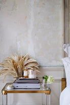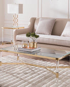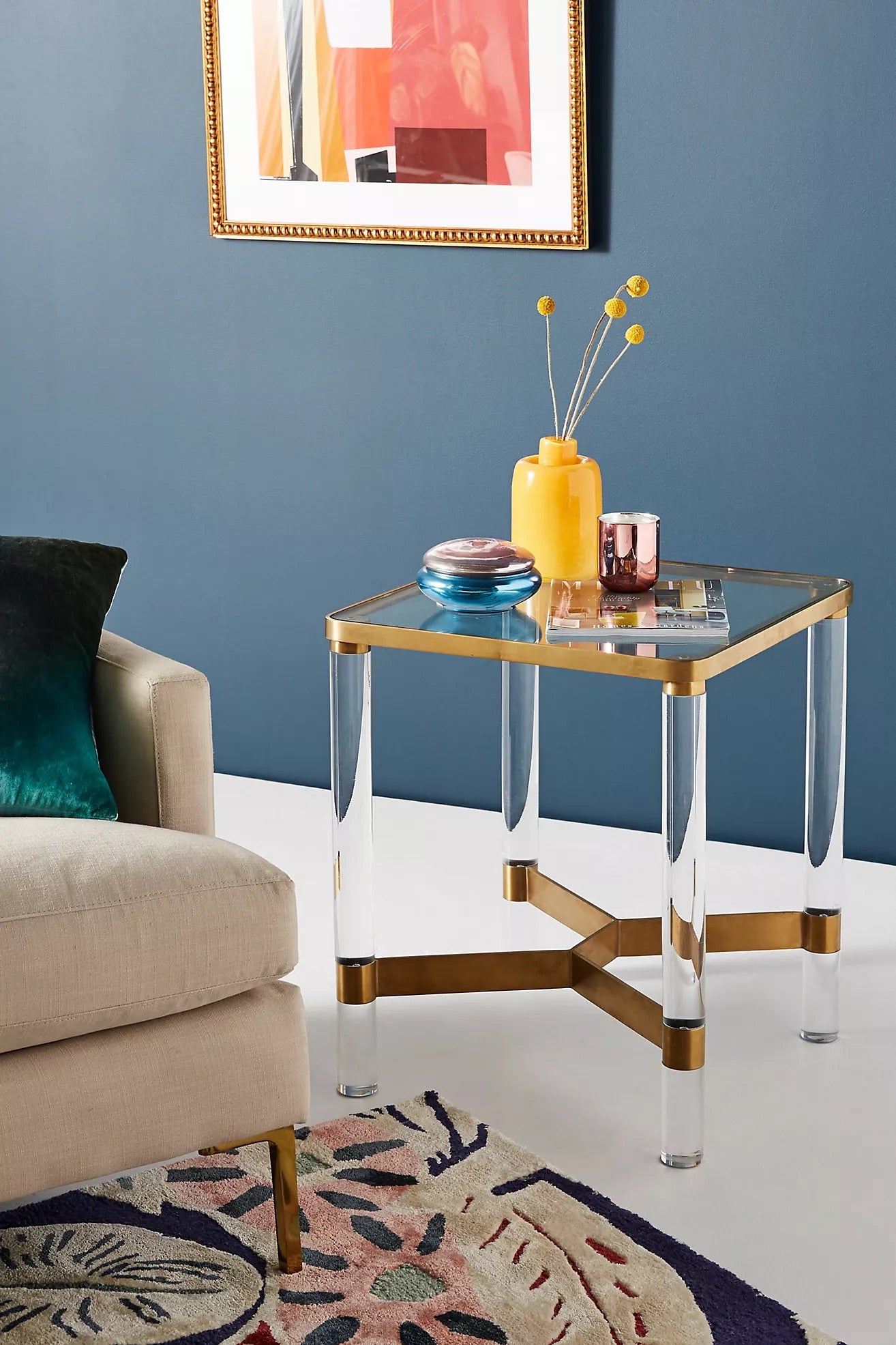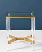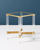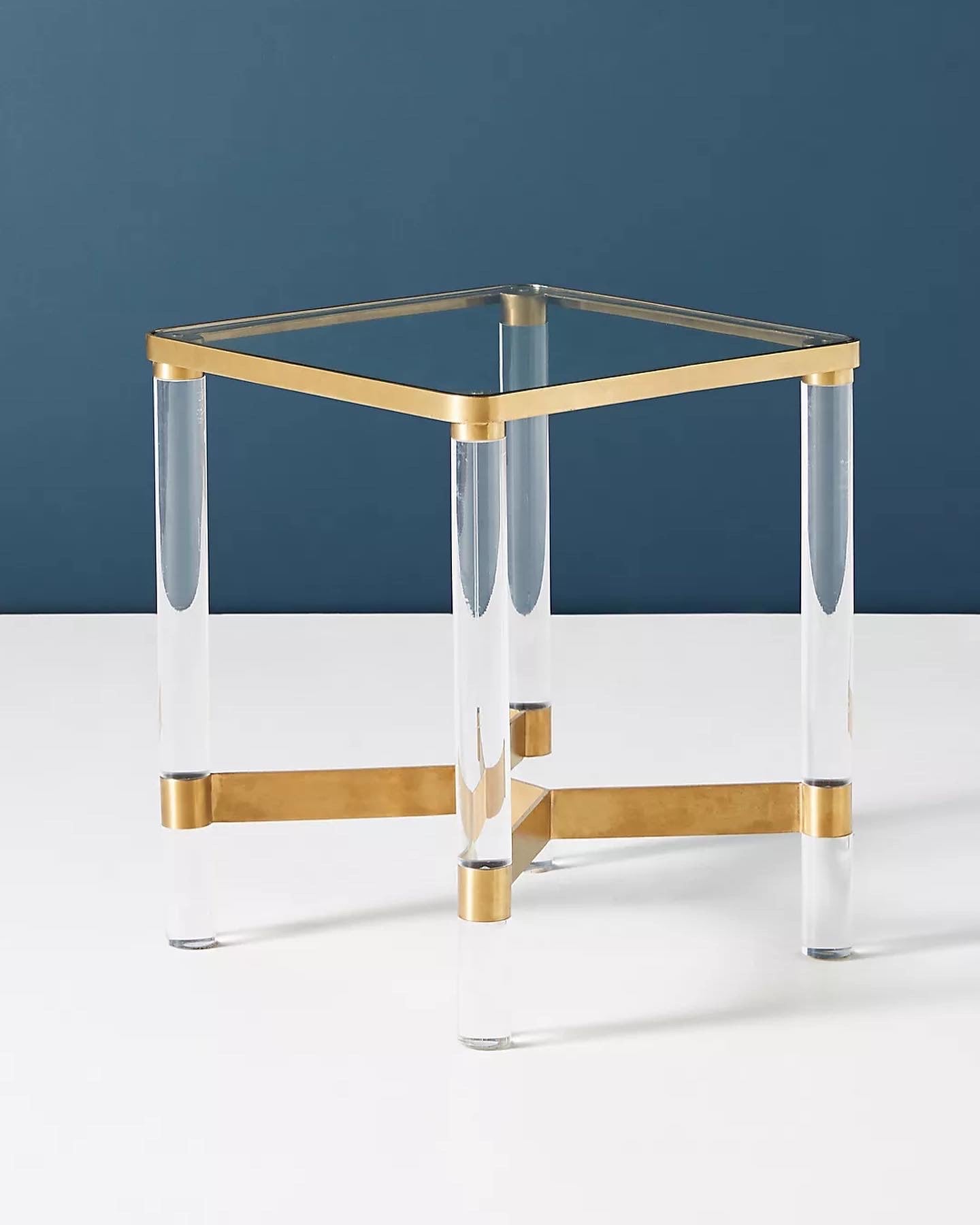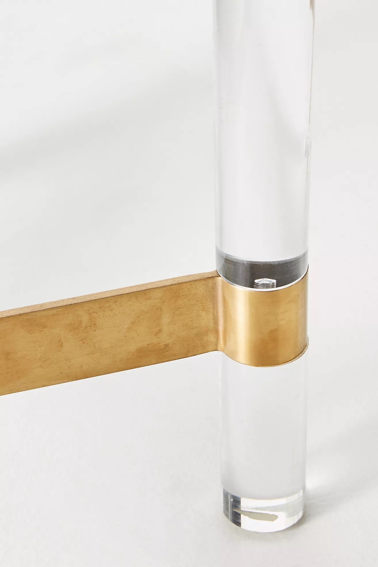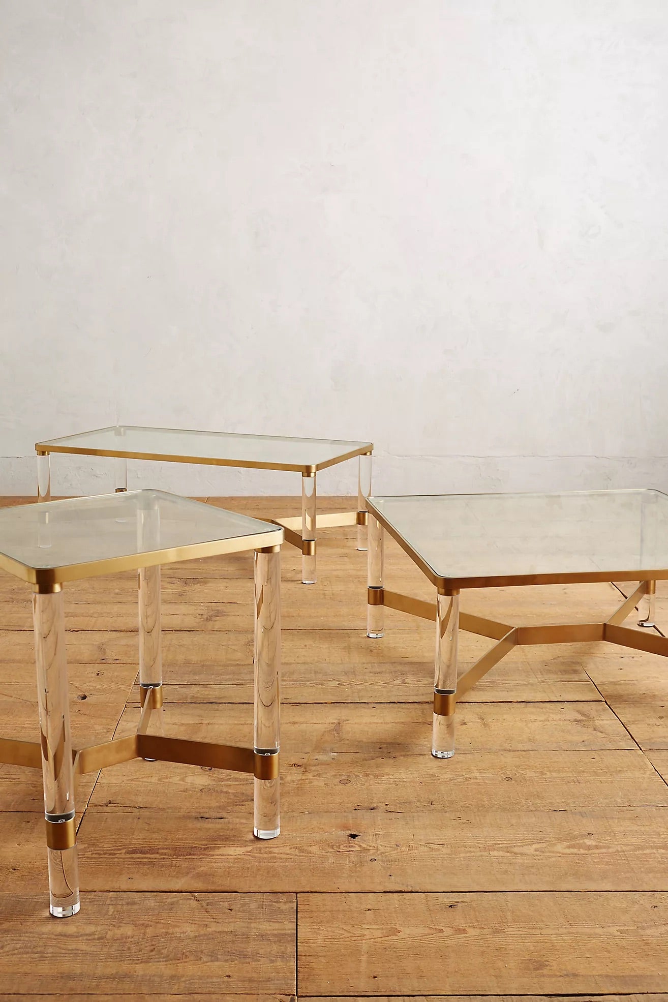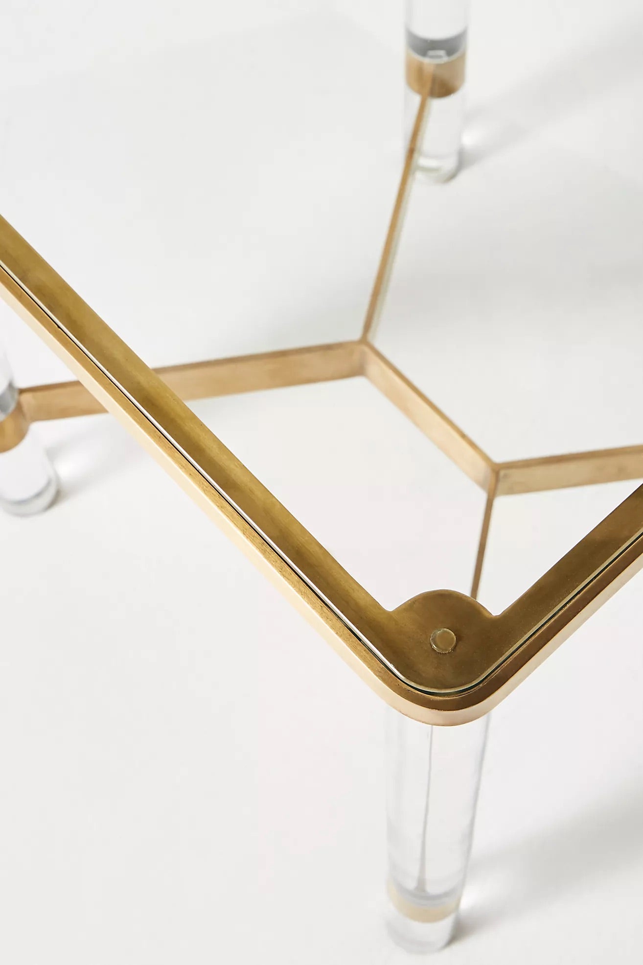 The refractive Lucite legs and gleaming cast brass base of this table are meant to catch the light, drawing all eyes to its Deco-inspired lines.