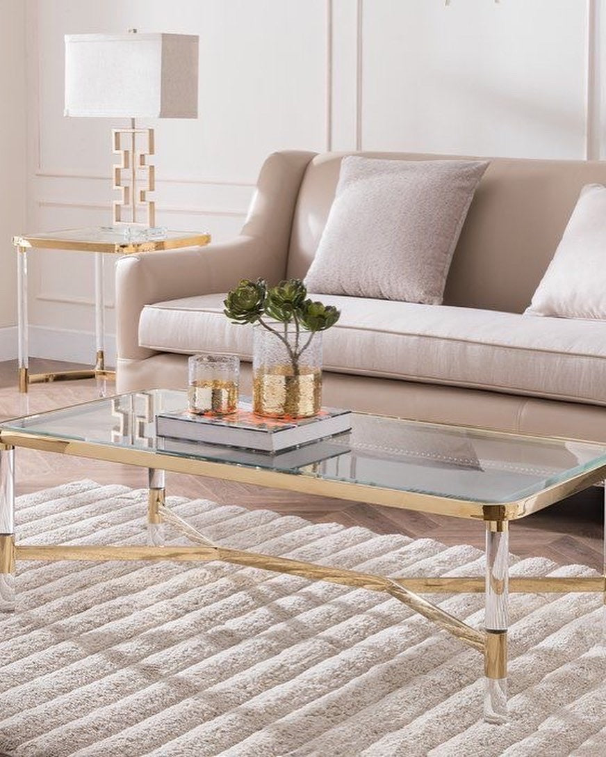 Glass, lucite, brass-plated steel- Wipe with dry cloth