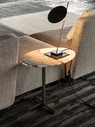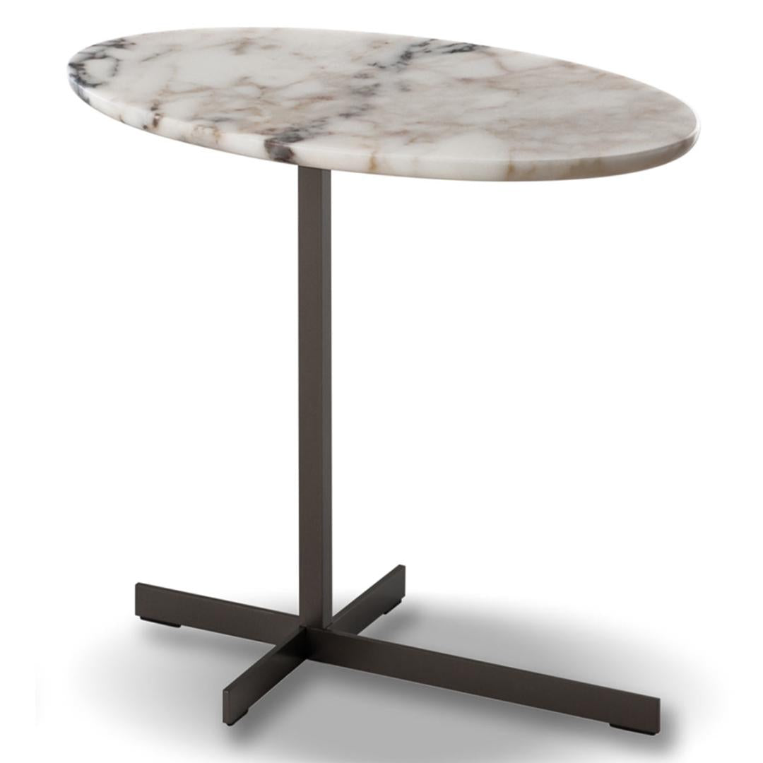 The Joy side table is available in a new version with an oval-shaped marble top that creates a unique asymmetrical effect in contrast to the base and makes the Joy “Jut Out” an especially good match with the sofas and armchairs in the new collection. The base, with its characteristic cross-motif pattern comes in Bronze-finished metal. The top of the Joy “Jut Out” features a rounded edge and is available in select, precious marbles: Arabescato Purple, Sahara Noir and Rosso Levanto, all with polished finish.