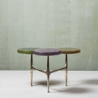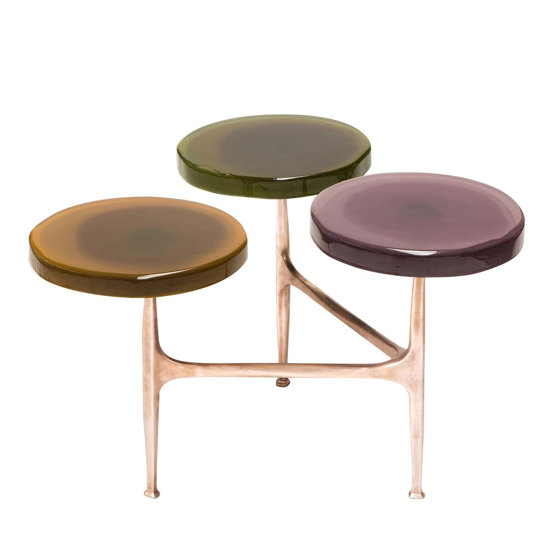A unique objet d'art of bold sophistication, this coffee table belongs to the Transparency Matters Collection entirely created by hand. Boasting a captivating V-shaped structure made of cast bronze, the three stunning tabletops in purple, green and gold are enhanced by exquisite transparency. Also available in other colors, each table will display unique gradients as the mix of resin and color layered in the mould will producing always different gradients.