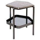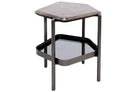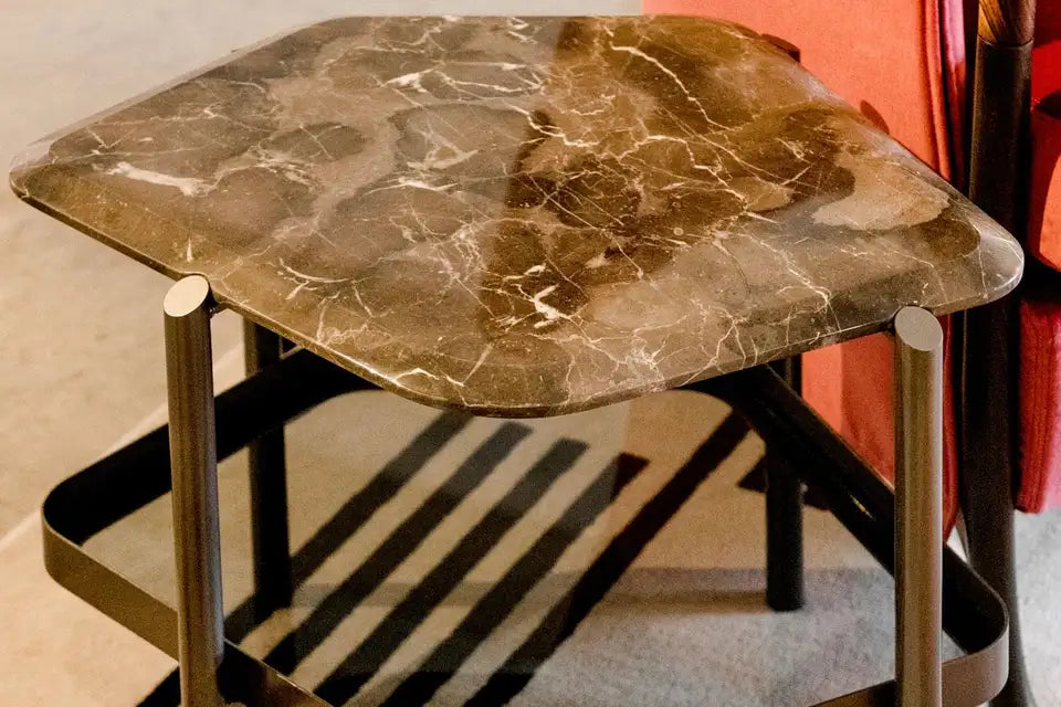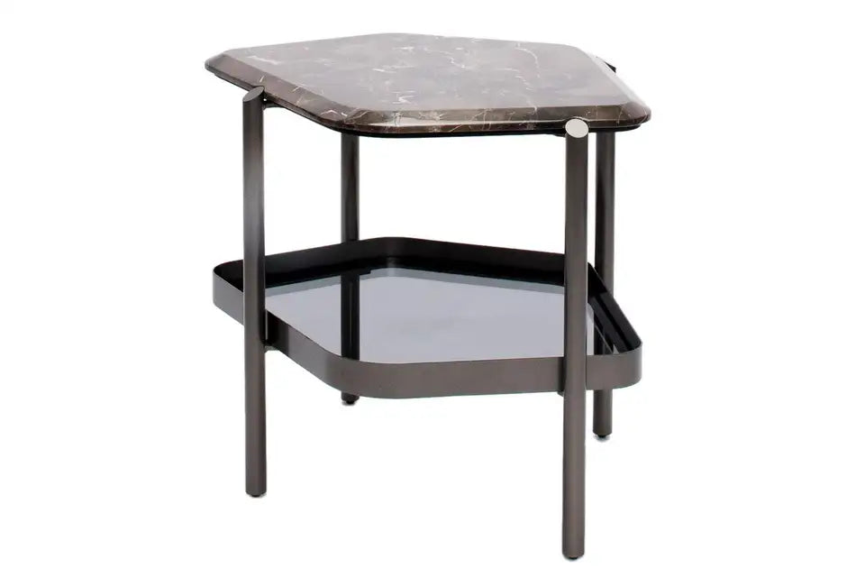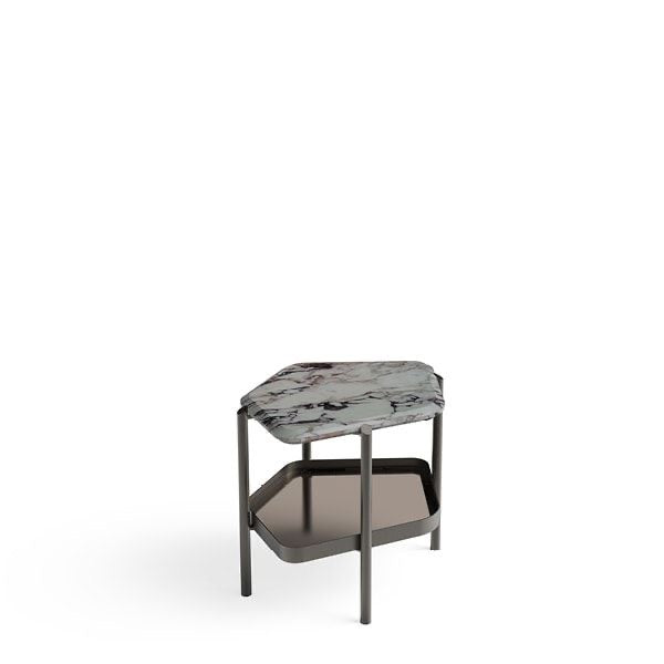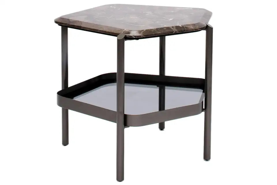 Skyline is a series of tables with customizable shapes and finishes from Giorgetti. Our side table on display is a pentagonal shaped low table with a metal frame finished in pewter. The overall shape of this piece along with the beauty of the velvet finished brown marble top draws you in to the fine details of the