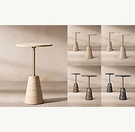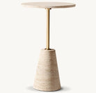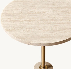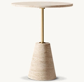 Equal parts elegant and elemental, this sculptural table features a pure geometric profile grounded in a conical base hand-carved from richly veined stone. Rising to a perfectly balanced circular top, the slender stem creates a refined contrast to the stone’s organic materiality.