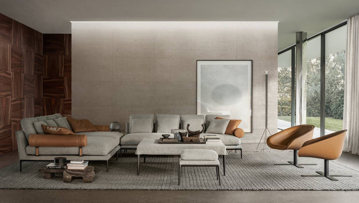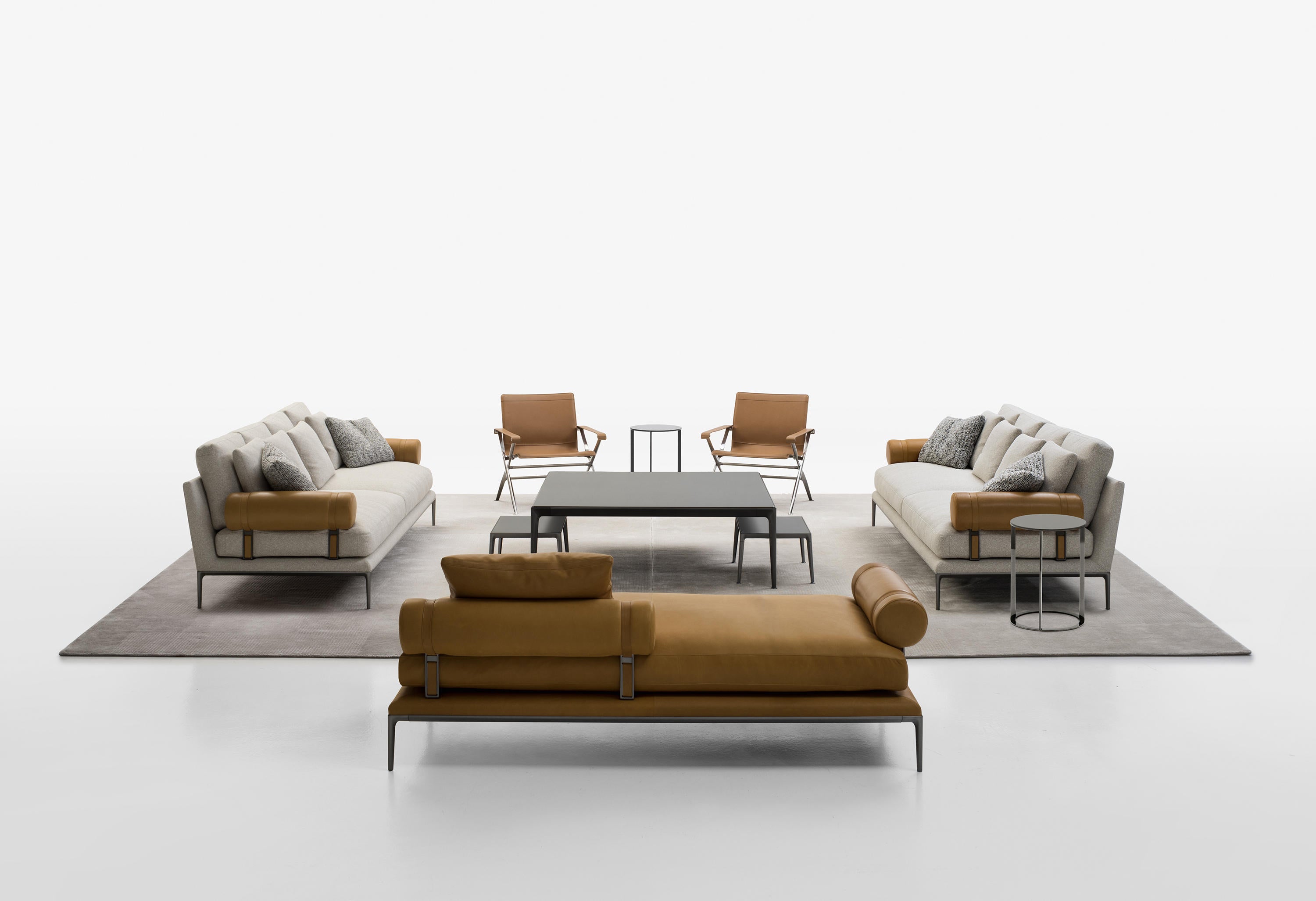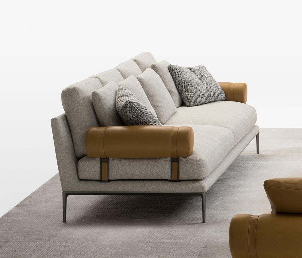 Atoll is a refined expression of a balanced aesthetic form and a decisive contemporary style that is also extremely elegant.‎ The system is built on three basic platforms that are complemented by armrest and backrest elements to form various types of seats: sofas, dormeuses, corner-end modules, single or modular elements with chaise longue and ottomans.‎ The frames have light, slender lines and are applied on high die-cast supports with metal profile emphasising the line between the structure and upholstery.‎ The pieces are given even more character by a supporting element to be placed wherever desired, a bolster in two sizes attached by leather straps to a die-cast structure.