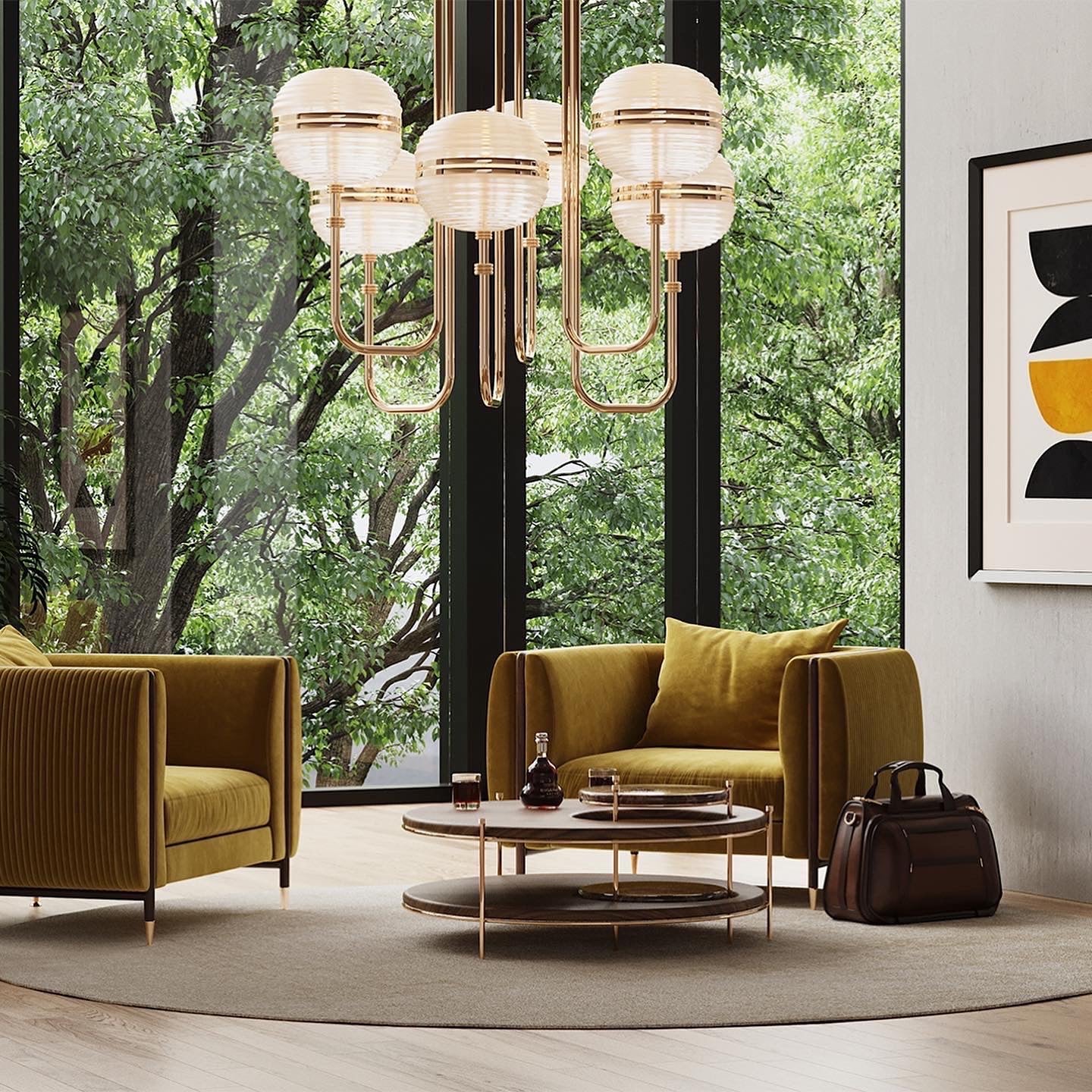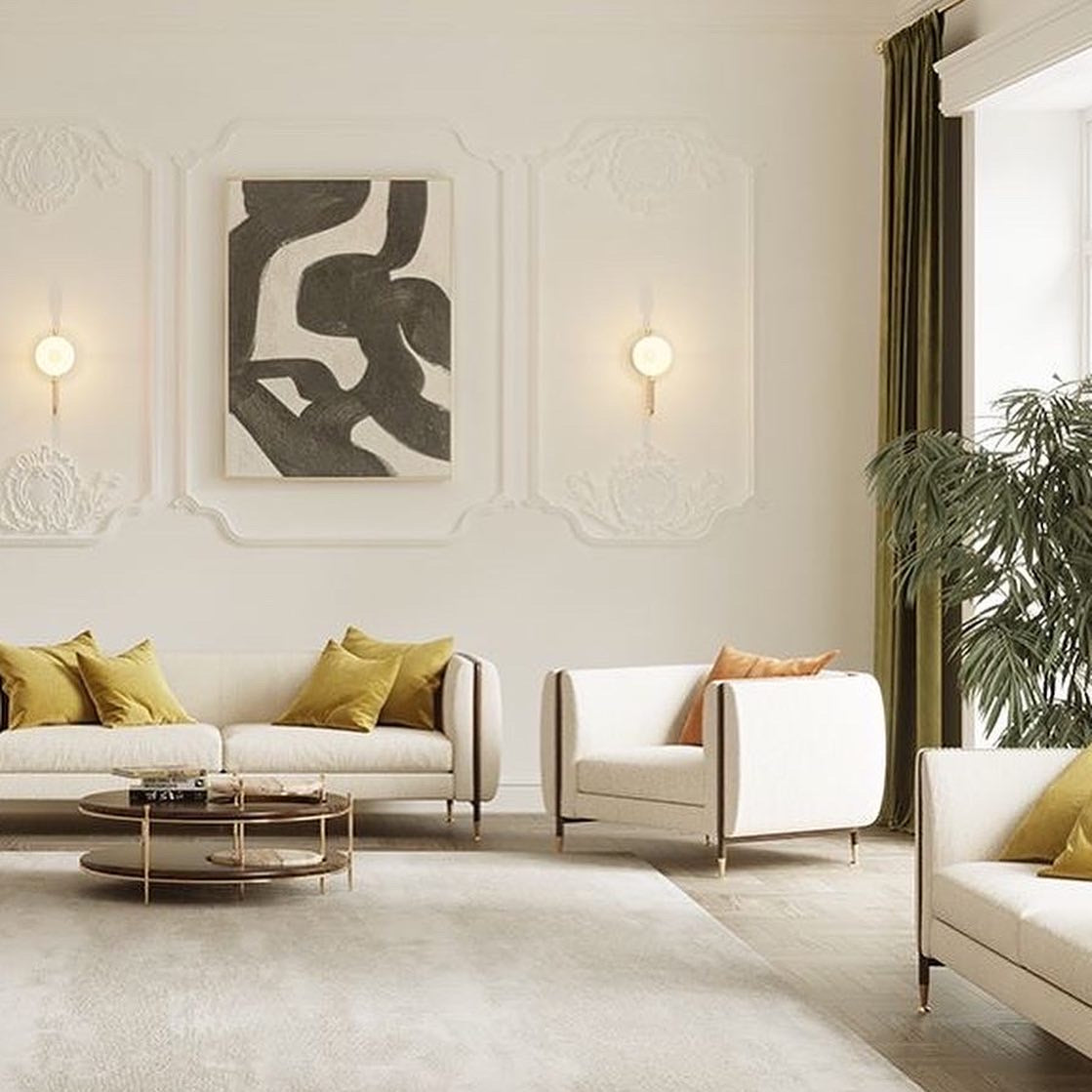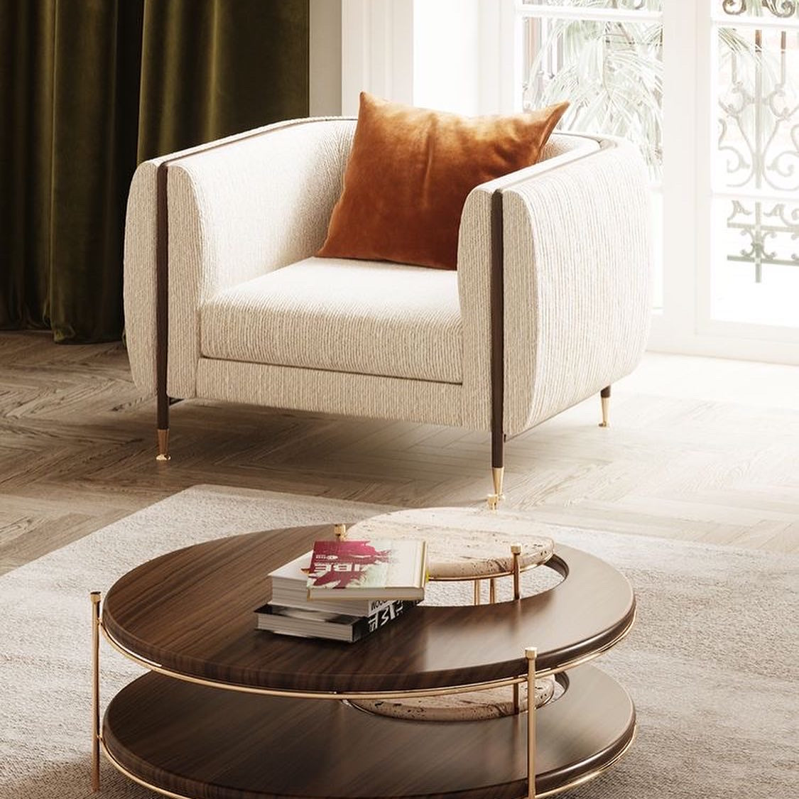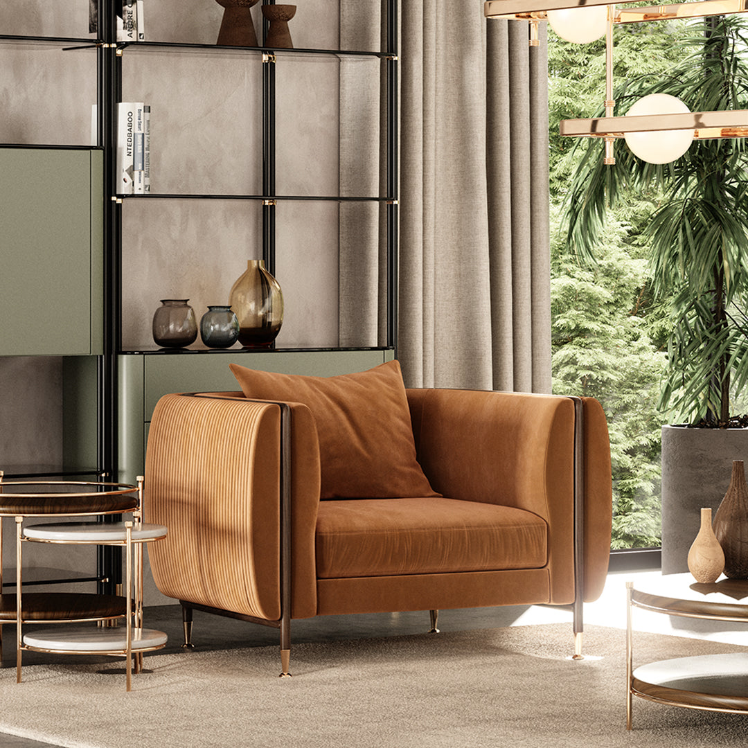 The Barlow armchair is a handmade upholstery piece with a textured fabric. The curved lines bend the legs in all its strength gracefully accentuated by rich polished brass details. The medley between the materials takes this sofa to a higher level.