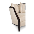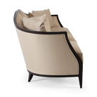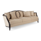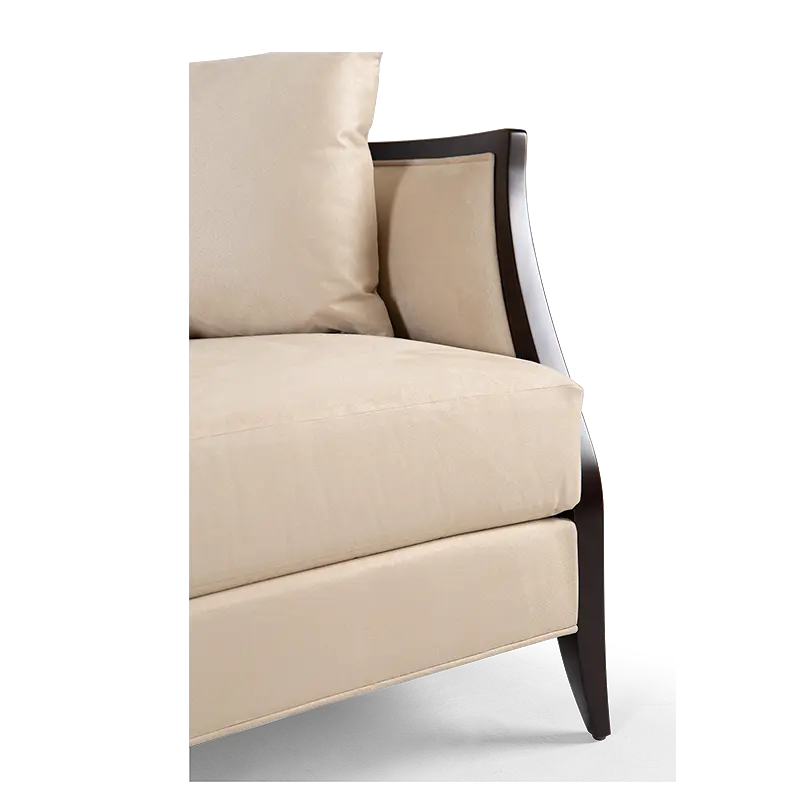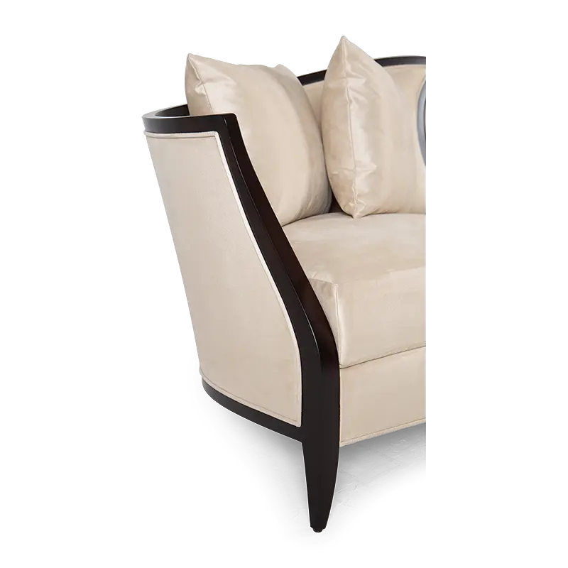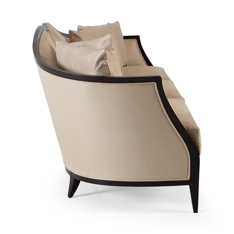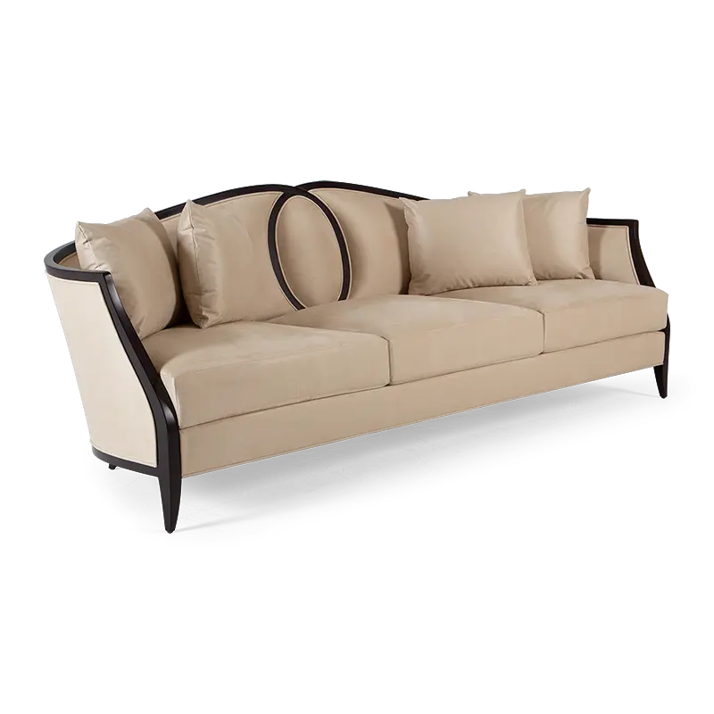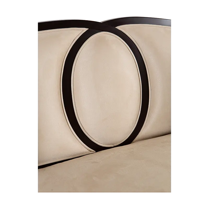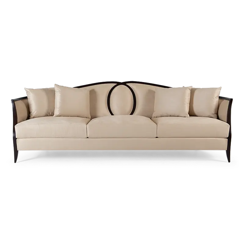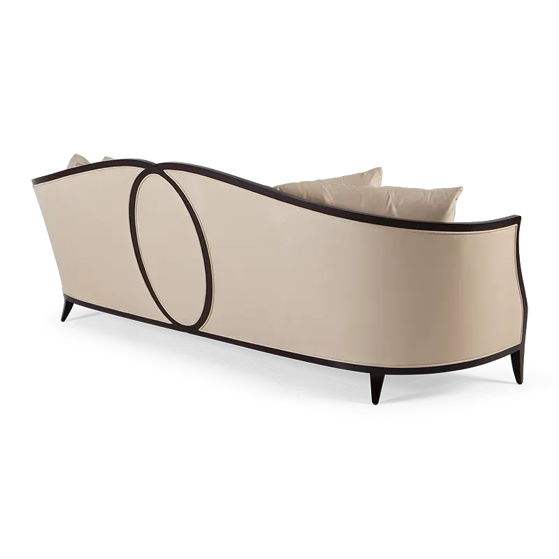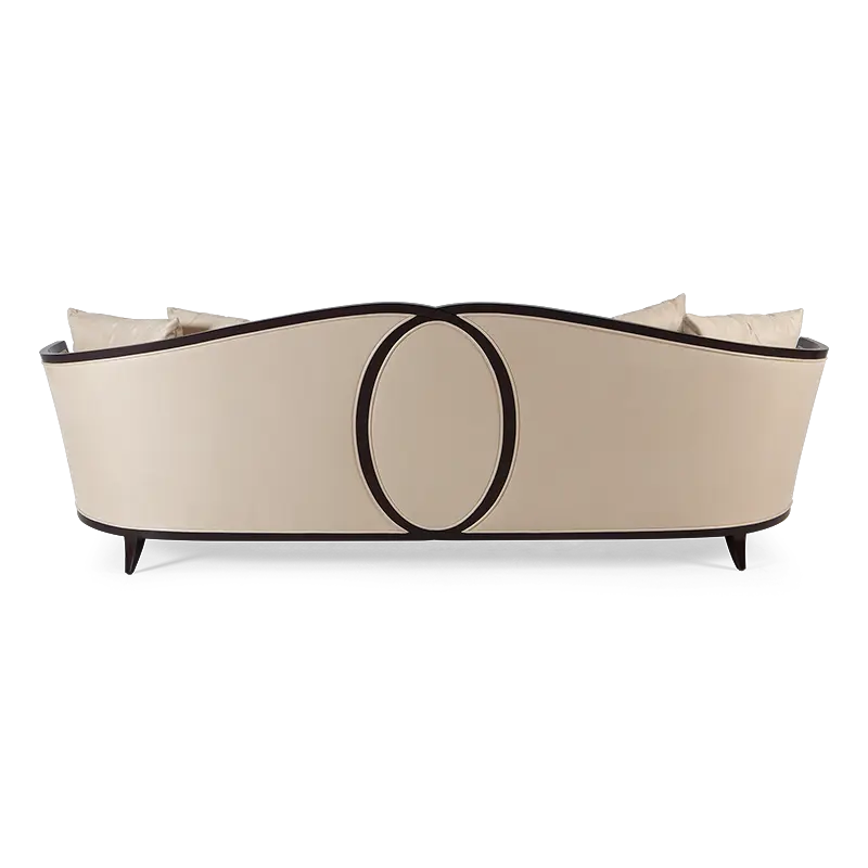 This elegant sofa features a central oval upholstered detail set within a ‘sweetheart’-shaped back, beautifully sculpted in solid hand-carved mahogany. It brings a fresh, refined look to both classic and contemporary interiors.