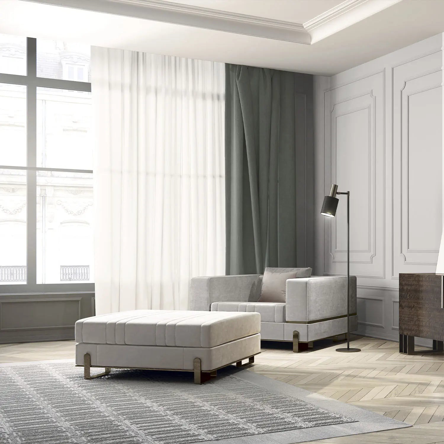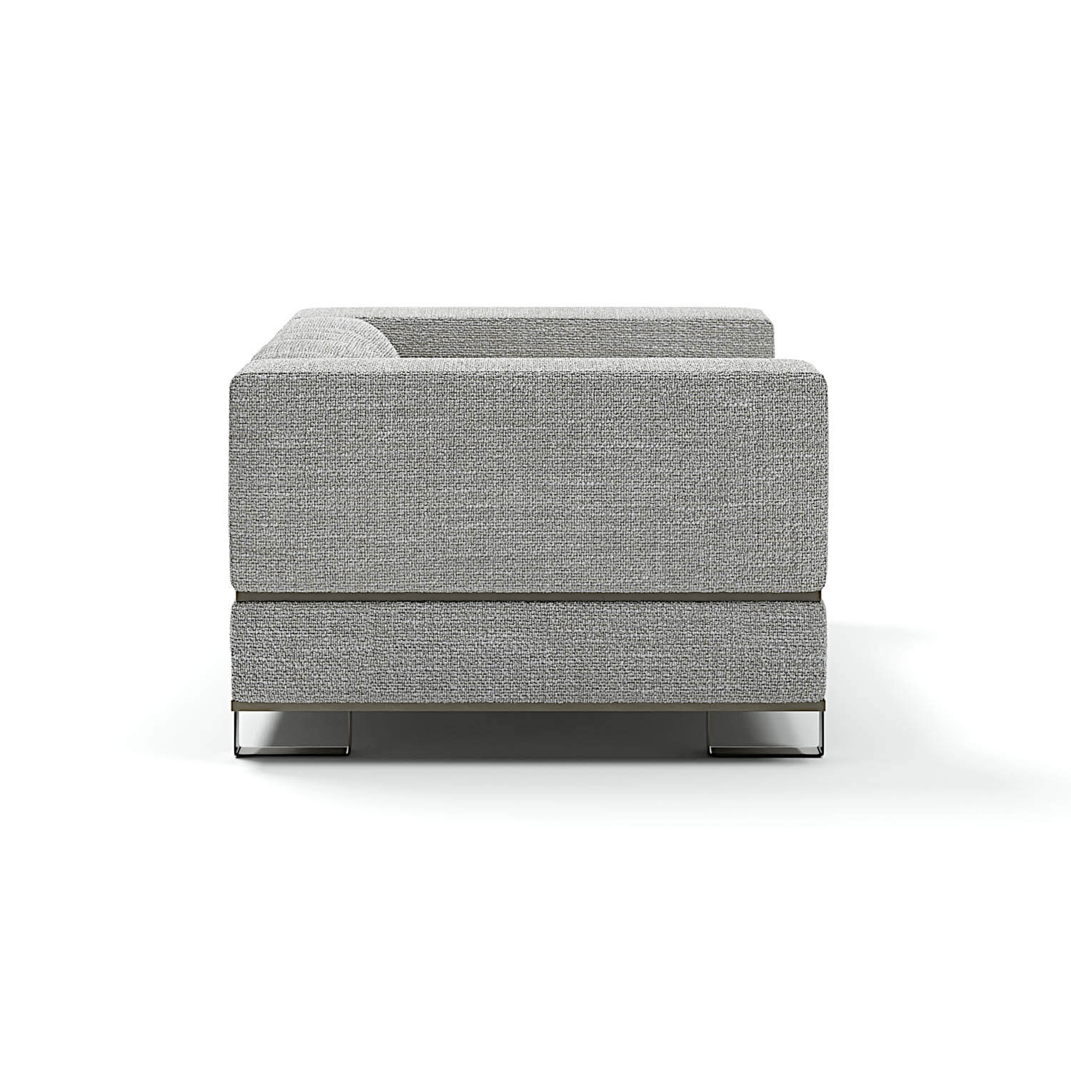Martino luxury Italian sofa shown in upholstered Turkish Fabric with wood framework. This luxury modern furniture collection combines fashion with furniture. Optional profiles and plates in golden, bronzed, nickel and lacquered Brass Metal. A wide selection of fabrics are available to choose from (samples available upon request). Made in Pakistan