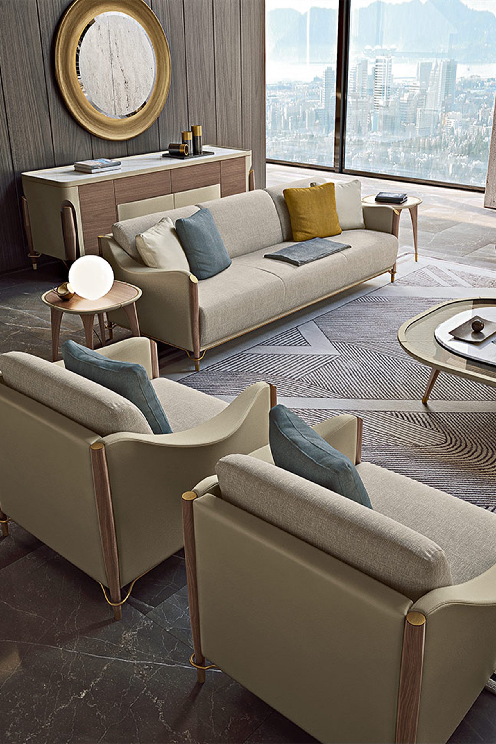 Soft, enveloping, almost circular lines define the volumes of all the elements in the collection. The design, certainly distinctive and recognizable, becomes more agile and slender, but embellished with details that identify the manufacturing capacity of the company in Brianza and that remain the best ambassadors of Made in Italy in the world.
