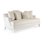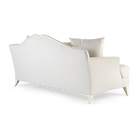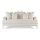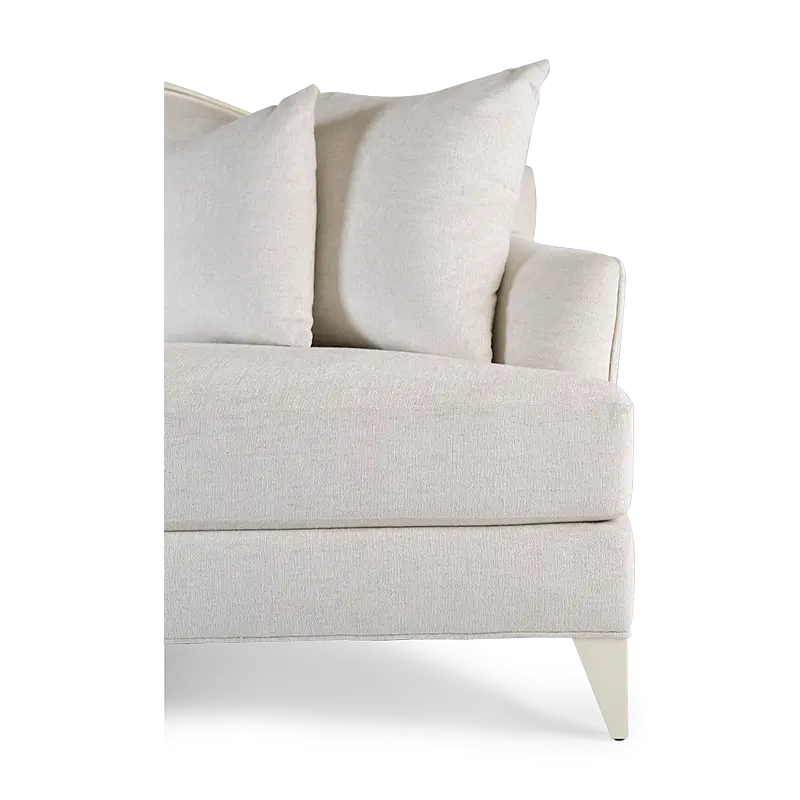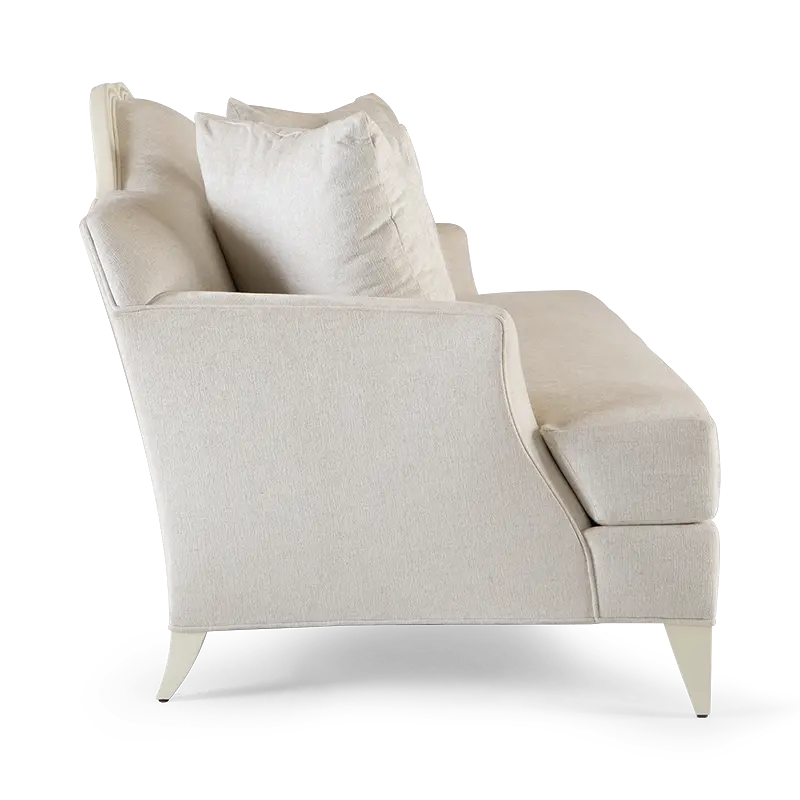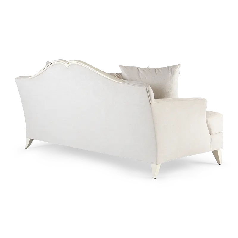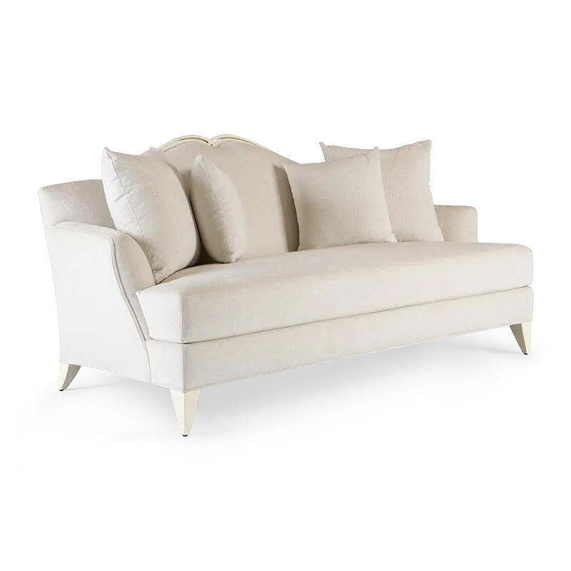 Displaying a clean and elegant silhouette, this sumptuous sofa features upholstered arms, a single continuous seat, and a beautifully hand-carved accent detail crowning the wide back for a refined, timeless appeal.